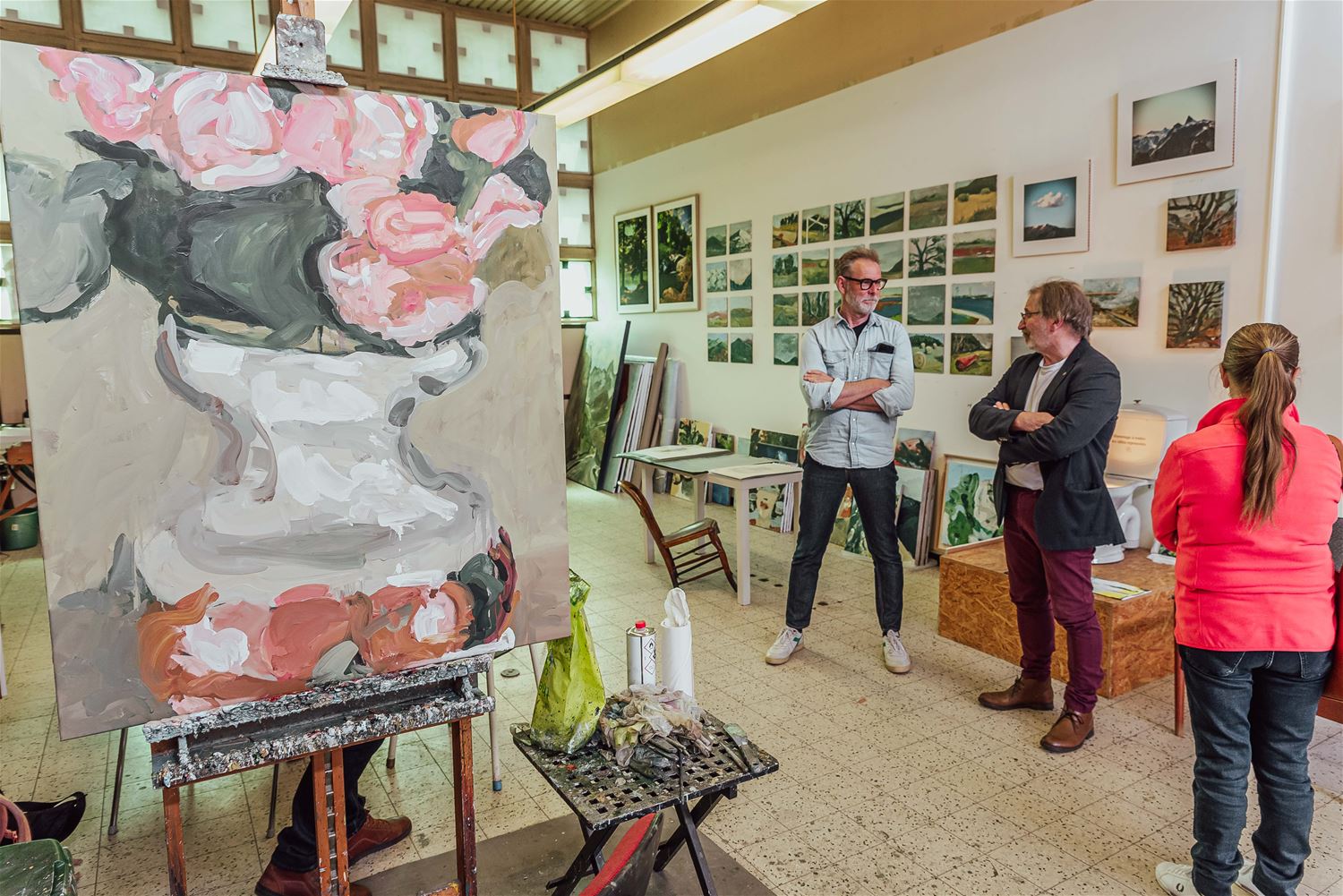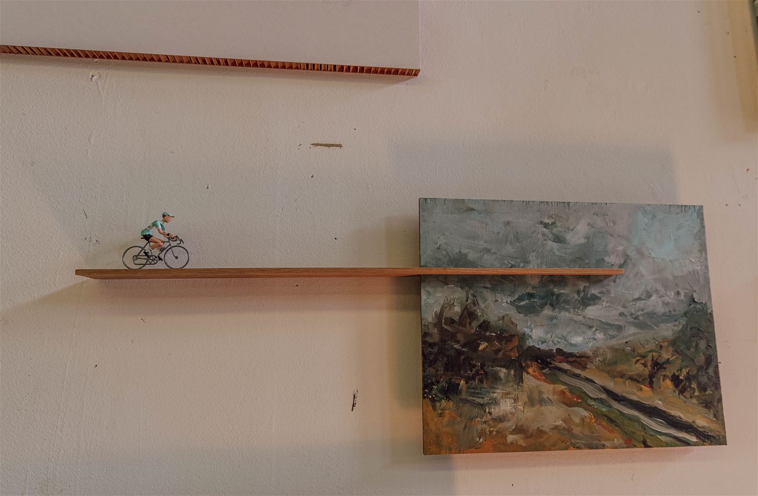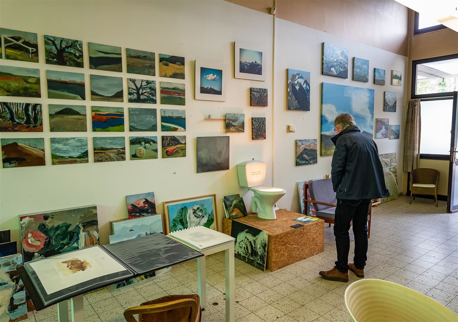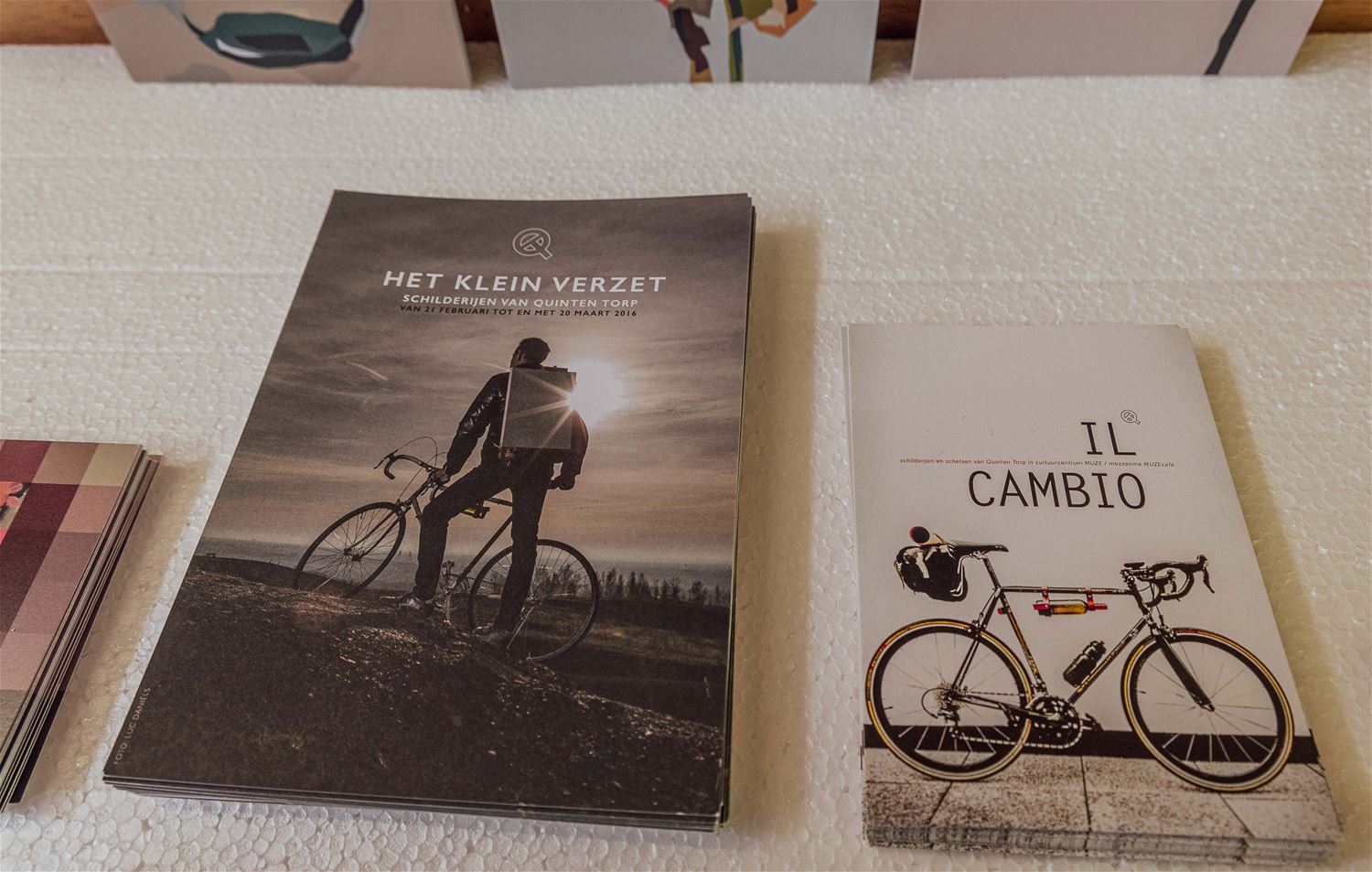 Quinten Top oftewel Geert Mullens heeft ondertussen al een hele reputatie opgebouwd als kunstenaar. Vooral zijn schilderijen zijn al op vele expo's en in galerijen te zien geweest, ook in het buitenland, maar daarnaast is hij ook met digitale kunst en grafiek bezig. Hij combineert al eens graag zijn passie voor de fiets met zijn kunst. Zo zocht hij voor Het Klein Vezet al fietsend hier in de streek inspiratie voor heel wat werken, maar erg indrukwekkend was ook zijn reeks 'Il Cambio' waarvoor hij op zijn vintage koersfiets door de Italiaanse Alpen trok en ter plekke werken schilderde. Ook tijdens de coronaperiode maakte hij enkele boeiende werken. Ook zondag van 11 tot 17 uur nog te bezoeken in de lokettenzaal van het station van Zolder, Stationsstraat. (foto's Ann Jordens) 77435