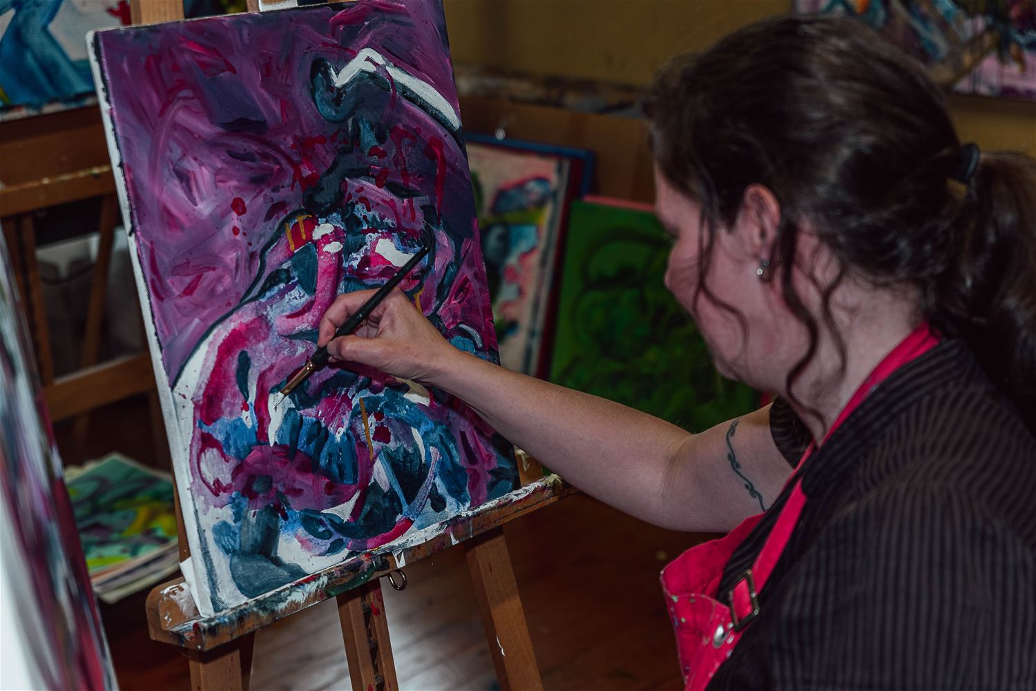 Kleur. Dat is wat meteen opvalt wanneer je het schildersatelier van Eefje Van den Brande binnenstapt. Ze werkt met felle kleuren, maar de andere keer weer met donkere kleuren. Ze vertrekt vanuit een vlek waarop ze haar fantasie loslaat. De natuur en dieren vormen heel vaak de inspiratie, maar tegelijk gaat ze de uitdaging aan met zichzelf. Zo zijn haar werken ook een veruitwendiging van het eigen innerlijke en emoties. Je kunt Eefje ook zondag van 11 tot 17 uur nog aan het werk zien in de Mommestraat 104. (foto's Ann Jordens)77437