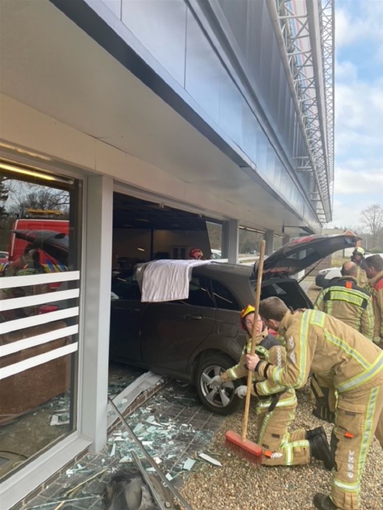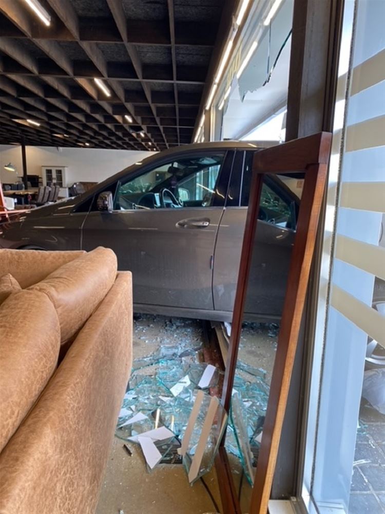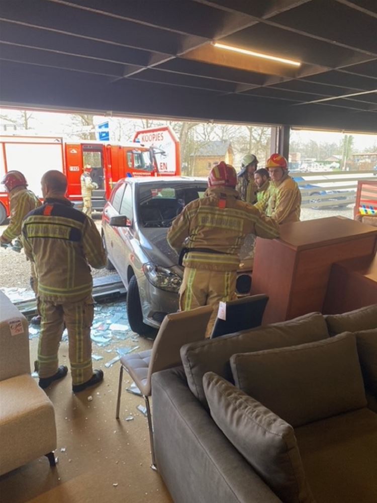 Auto rijdt dwars door vitrine meubelzaak binnen