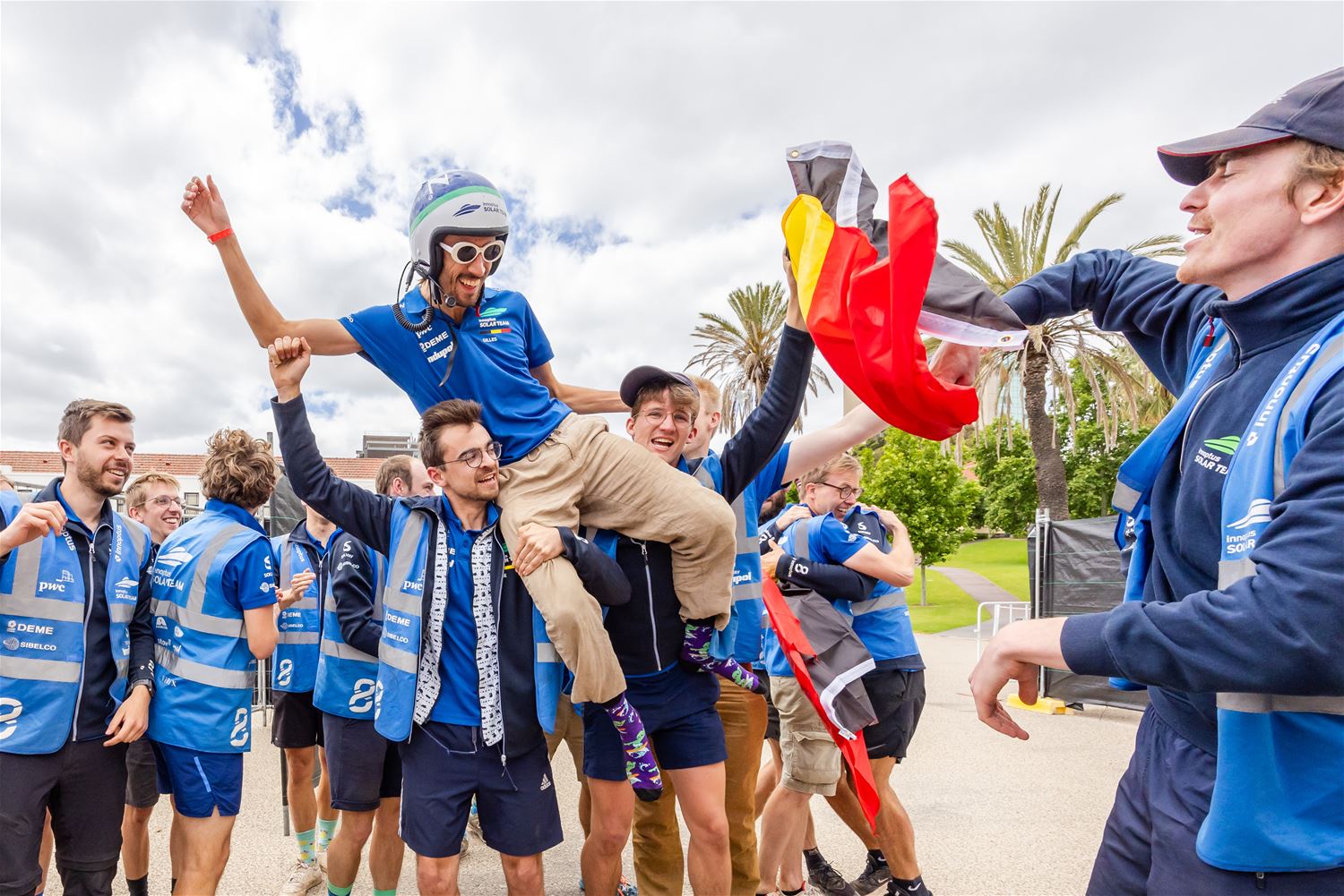 Het Innoptus Solar Team is vanmorgen als eerste gefinisht in de Bridgestone World Solar Challenge, het wereldkampioenschap voor zonnewagens dat plaatsvindt in Australië. De studenten van de KU Leuven pakken hiermee voor de tweede keer op rij goud, nadat ze in 2019 al eens wereldkampioen werden. De ingenieursstudenten, onder wie Heusdenaar Stan Kelchtermans, hebben een foutloze editie achter de rug. Daarmee bekronen ze 15 maanden werken en experimenteren. De ontlading was dan ook groot.78935