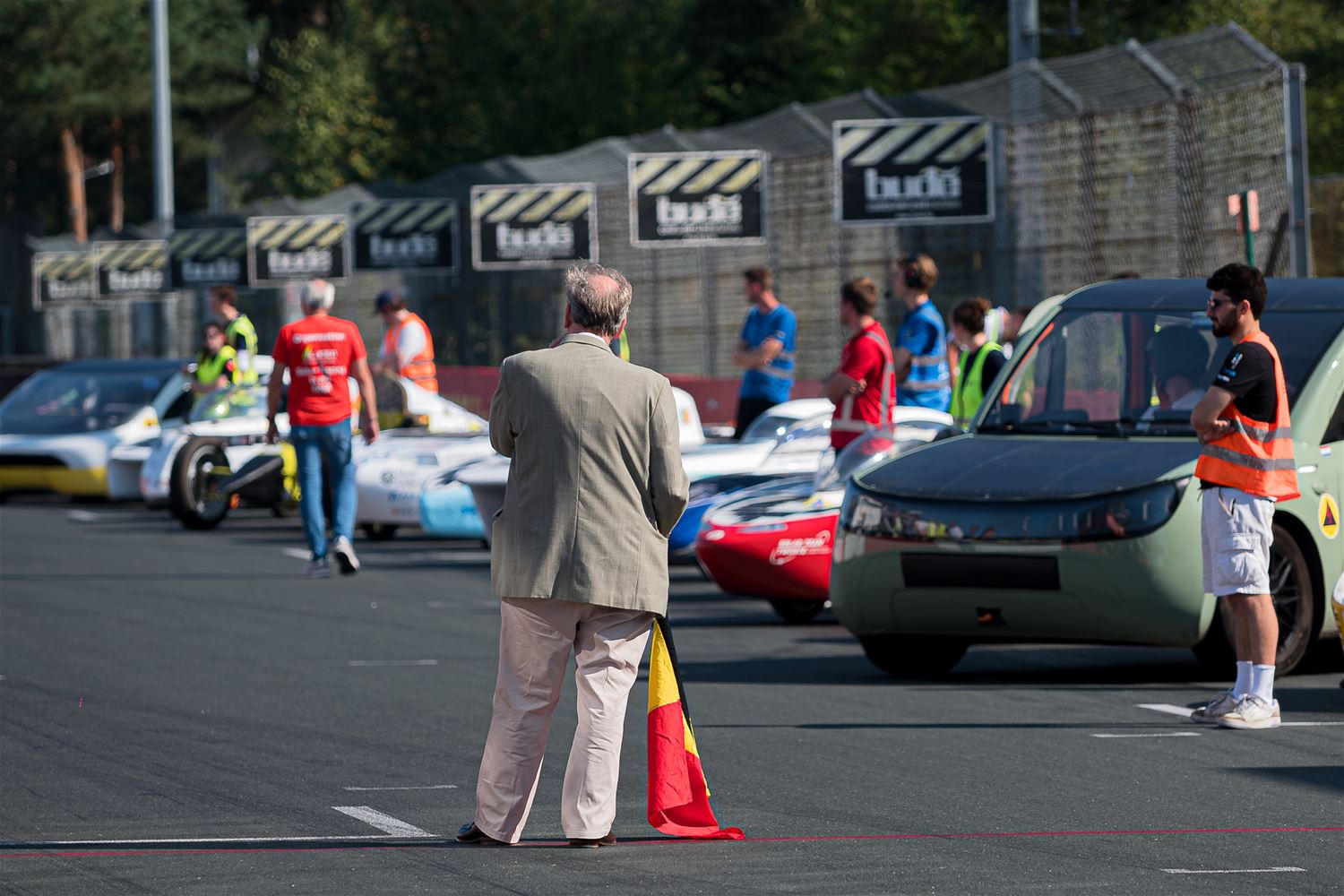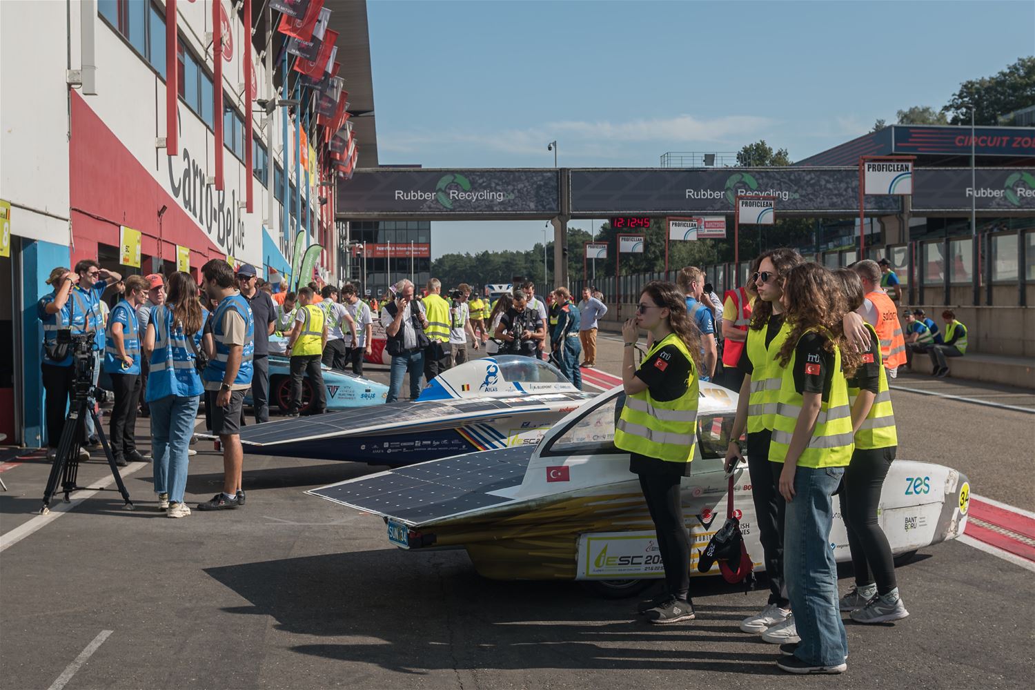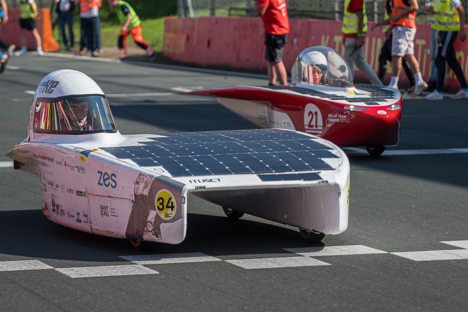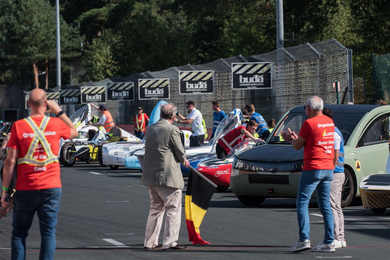 17 teams hebben vanmiddag op Circuit Zolder de start genomen voor de Ilumen Solar Challenge 2024. Prins Laurent moest verstek geven omdat hij ziek was en dus werd het een start zonder prinselijke allures maar wel volledig in Le Mans stijl. De teams hebben het weer mee, want nog tot vanavond kunnen ze genieten van volop zon en dus moeten ze alleen de laadbeurten van vannacht wat plannen. En het Belgische Innoptus Team nam meteen de leiding en bleef die ook vasthouden tijdens het eerste deel van de race. Na bijna 5 uur race telde het Leuvens team 72 rondes, één meer dan Zonnewagen Achen en 5 meer dan Zonnewagen Aachen 2. Voor de rest zijn er deelnemers uit Nederland, Duitsland, Engeland, Zwitserland, Zweden, Turkije, Roemenië en Polen. In de marge van de race komen ook heel wat bedrijven uit aanverwante sectoren contacten leggen of zich voorstellen en zijn er elektrische wagens te zien. Er zijn vandaag ook veel meer supporters en toeschouwers aanwezig dan bij andere edities. (foto’s Roman Martyka)83099