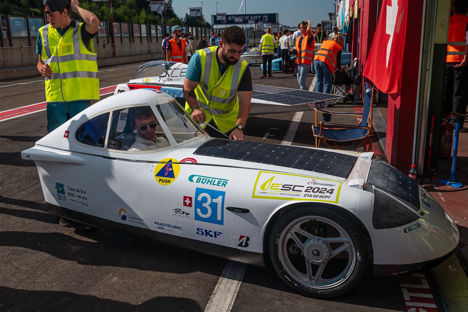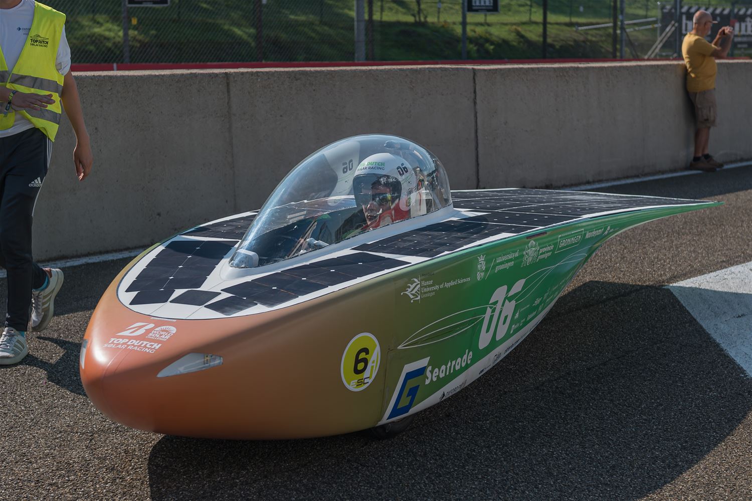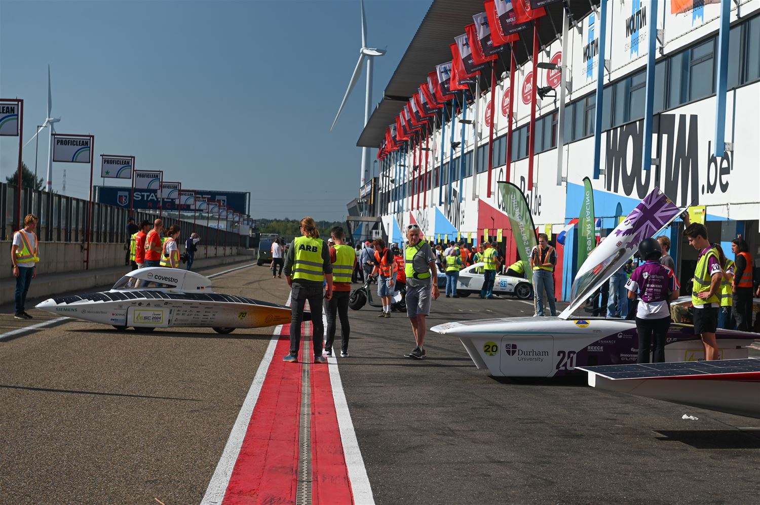 17 teams hebben vanmiddag op Circuit Zolder de start genomen voor de Ilumen Solar Challenge 2024. Prins Laurent moest verstek geven omdat hij ziek was en dus werd het een start zonder prinselijke allures maar wel volledig in Le Mans stijl. De teams hebben het weer mee, want nog tot vanavond kunnen ze genieten van volop zon en dus moeten ze alleen de laadbeurten van vannacht wat plannen. En het Belgische Innoptus Team nam meteen de leiding en bleef die ook vasthouden tijdens het eerste deel van de race. Na bijna 5 uur race telde het Leuvens team 72 rondes, één meer dan Zonnewagen Achen en 5 meer dan Zonnewagen Aachen 2. Voor de rest zijn er deelnemers uit Nederland, Duitsland, Engeland, Zwitserland, Zweden, Turkije, Roemenië en Polen. In de marge van de race komen ook heel wat bedrijven uit aanverwante sectoren contacten leggen of zich voorstellen en zijn er elektrische wagens te zien. Er zijn vandaag ook veel meer supporters en toeschouwers aanwezig dan bij andere edities. (foto’s Roman Martyka)83099
