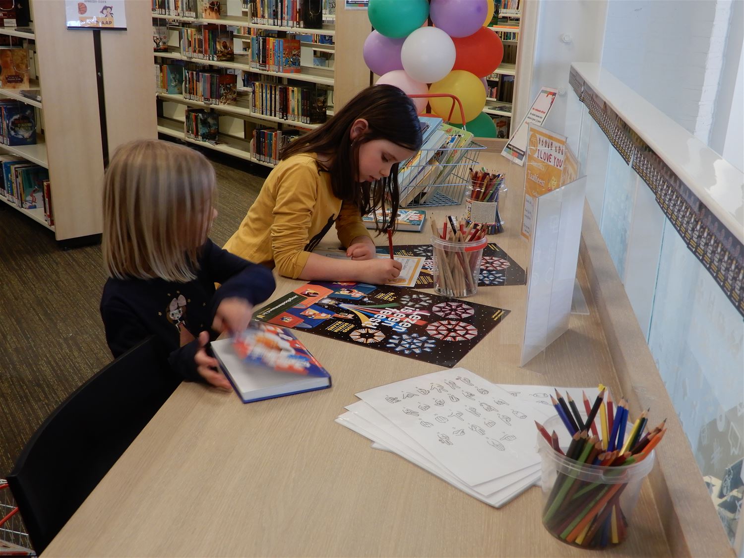 De Jeugdboekenmaand is deze week gestart en vooral op deze vrije woensdagnamiddag draaide ze al op volle toeren in de bib. Die is dan ook feestelijk en kleurrijk uitgedost, dat mag ook want de Jeugdboekenmaand viert haar 50ste verjaardag. En voor dit gouden jubileum hebben de bibmedewerkers een hoop activiteiten en animatie uitgewerkt. En ook de scholen worden daarin uiteraard betrokken. Zo worden kinderen gestimuleerd om samen met hun ouders naar de bib te gaan en te lezen. Daarvoor krijgen ze een rupskaart en het is nu afwachten welke school op die manier de langste rups maakt. Een leesrups als het ware. De AAP was vandaag ook van de partij om de jonge bezoekers te verwelkomen en wegwijs te maken. Wie er vandaag niet was, niet getreurd, de maand is nog maar pas gestart. (foto's Julien Maebe)67811
