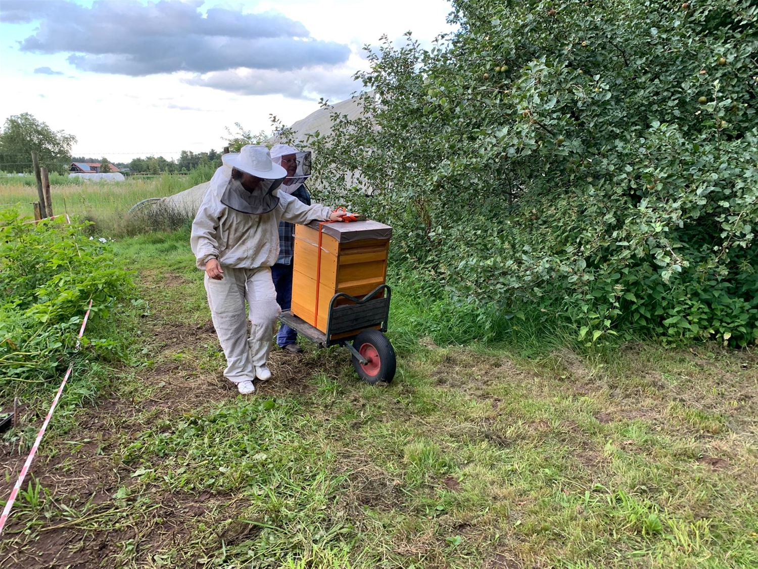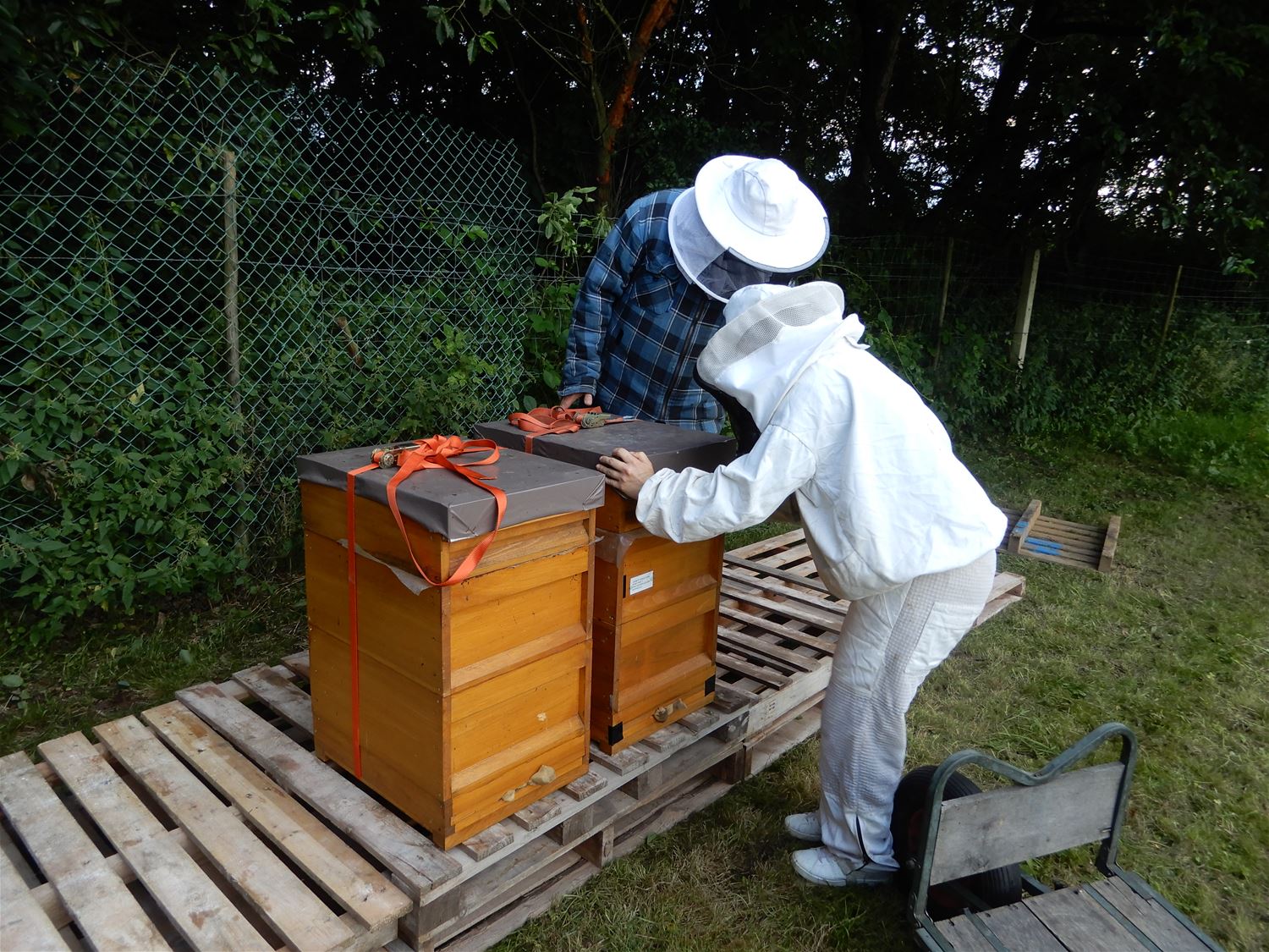 De bijenkolonie van Liesbeth Vancluysen was ontheemd door de werkzaamheden aan het Woutershof. Maar ze kregen asiel aangeboden bij de Dorpstuintjes Heusden-Zolder. En dus kwam Liesbeth vanavond haar korven daar plaatsen. De bijtjes kunnen er bijzonder nuttig werk verrichten en tegelijk heel wat honing verzamelen in de Vallei van de Mangelbeek. De dorpstuinders voorzien bovendien tegen volgende lente een bloemenstrook zodat de bijen er zich snel thuis zullen voelen. Schepen van leefmilieu Yasin Gül kwam aan de verhuizing nog een officieel karakter geven. (foto's Julien Maebe)