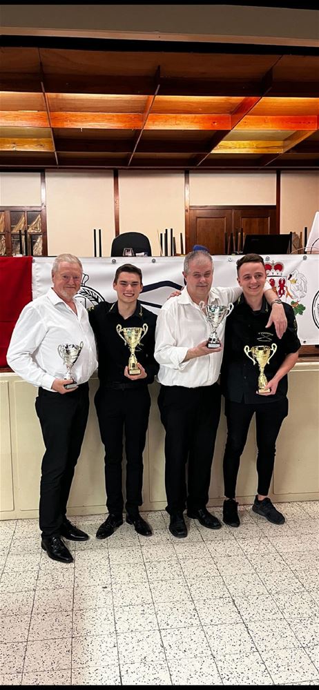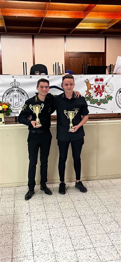 Golfbiljart is een sport die niet zo vaak in de picture komt, maar nu hebben we hier kersverse kampioenen: Brian Gerits en Luca Doop - beiden aangesloten bij SV-Zolder Café Vijfershof - wonnen de titel in het duo hoog LGB. Ze speelden daarbij ervaren spelers één voor één naar huis en versloegen in de finale Guy Vandevoort en Frank Spirtius. Brian is trouwens ook de zoon van de uitbaters van 't Vijvershof en leeft dus bijna letterlijk tussen de golfbiljarts. 72876