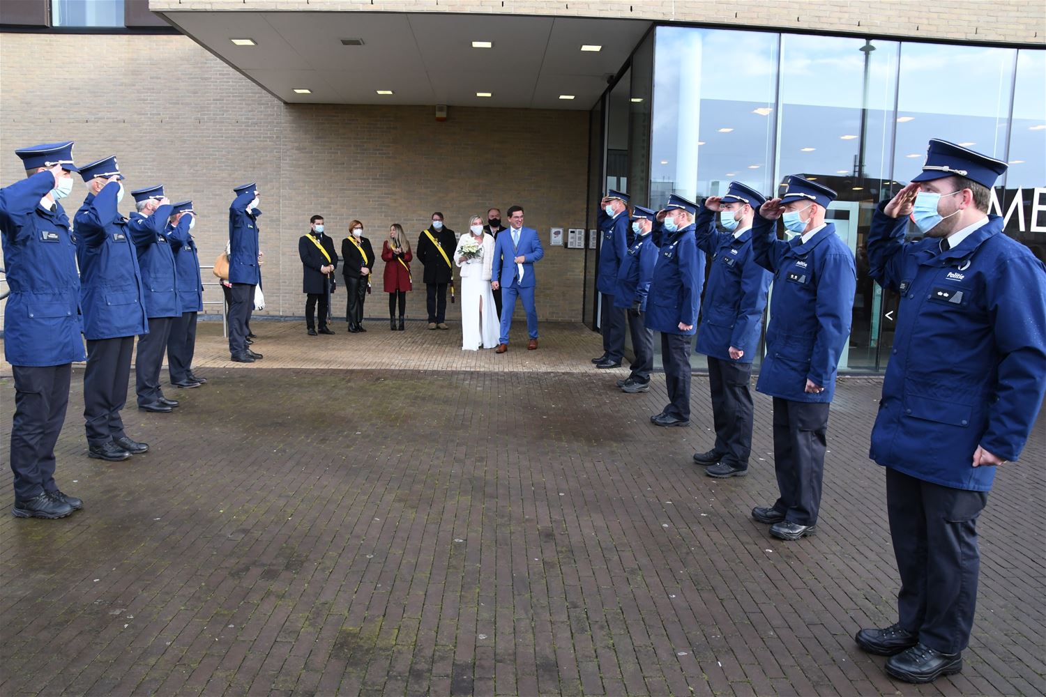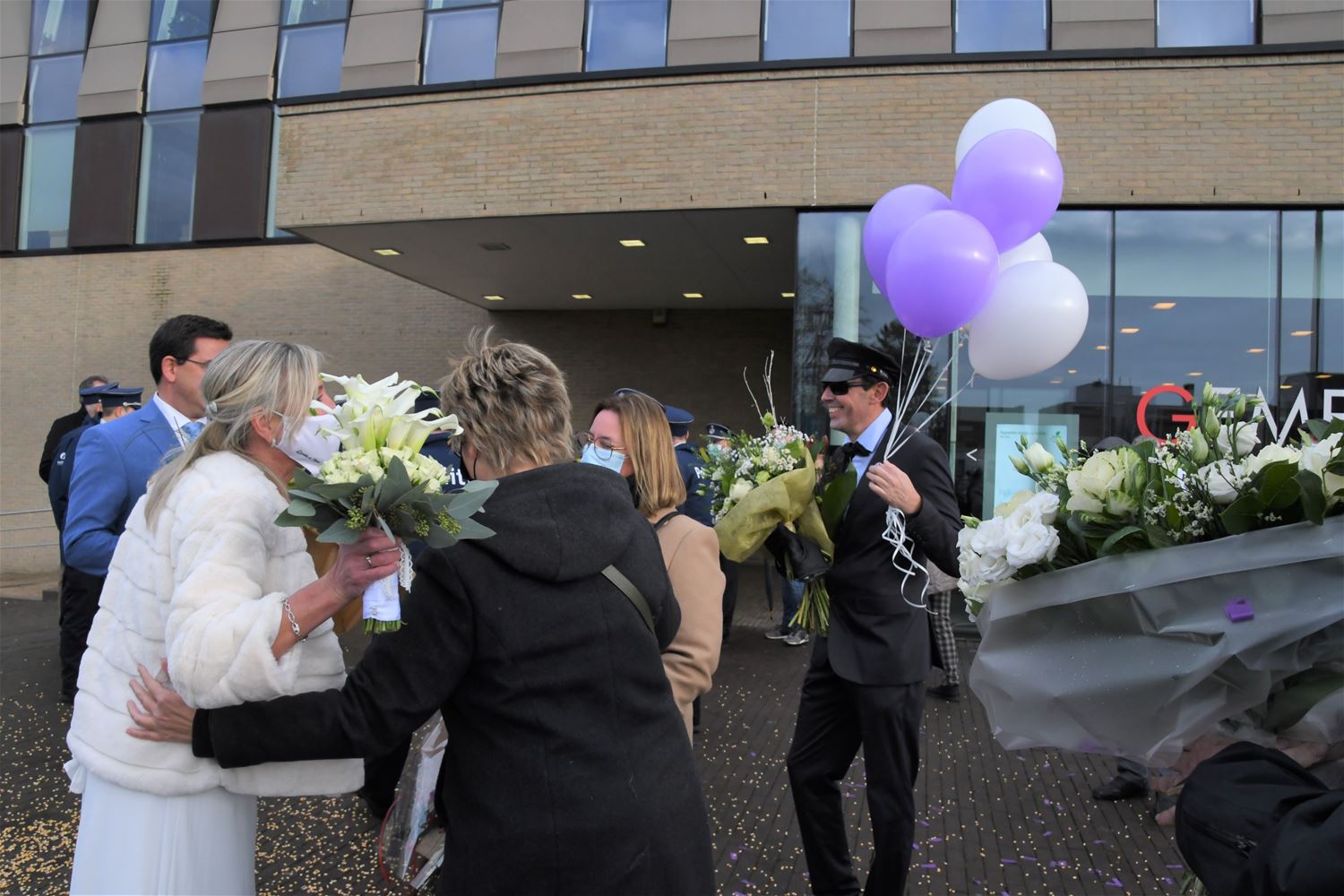Onder grote belangstelling is burgemeester Mario Borremans vanmiddag in het huwelijksbootje gestapt met politieinspecteur Daniëlle Suekers. De officiële plechtigheid werd geleid door schepen Marleen Hoydonckx en opgeluisterd met live muziek door We Two. De andere leden van het schepencollege vormden een erehaag net als het politiekorps . Voor de rest waren er heel wat partijgenoten, sympathisanten en gemeentepersoneelsleden aanwezig. Buiten werd het kersverse paar letterlijk bevolven onder de maïs en figuurlijk onder de bloemen en attenties. Het huwelijksfeest is omwille van de coronasituatie uitgesteld, de aanwezigen kregen aan de achterzijde van het gemeentehuis in openlucht een drink aangeboden. 71574