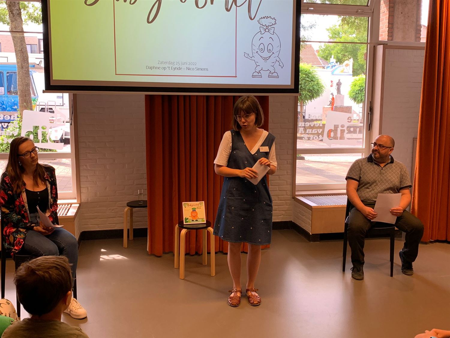 In de bibliotheek stelde Daphne Op ’t Eynde, afkomstig uit Heusden-Zolder, vanmorgen haar eerste prentenboek “Babywortel gaat op avontuur” voor. Daarmee maakt ze een jeugddroom waar, ze schreef het verhaal als 11-jarige en werkte het nu verder uit. Buurman Nico Simons - beiden wonen in Koersel - zorgde voor de illustraties. 't Was een leuke voorstelling met kinderspelletjes en een kleurwedstrijd. (foto's Julien Maebe)73462