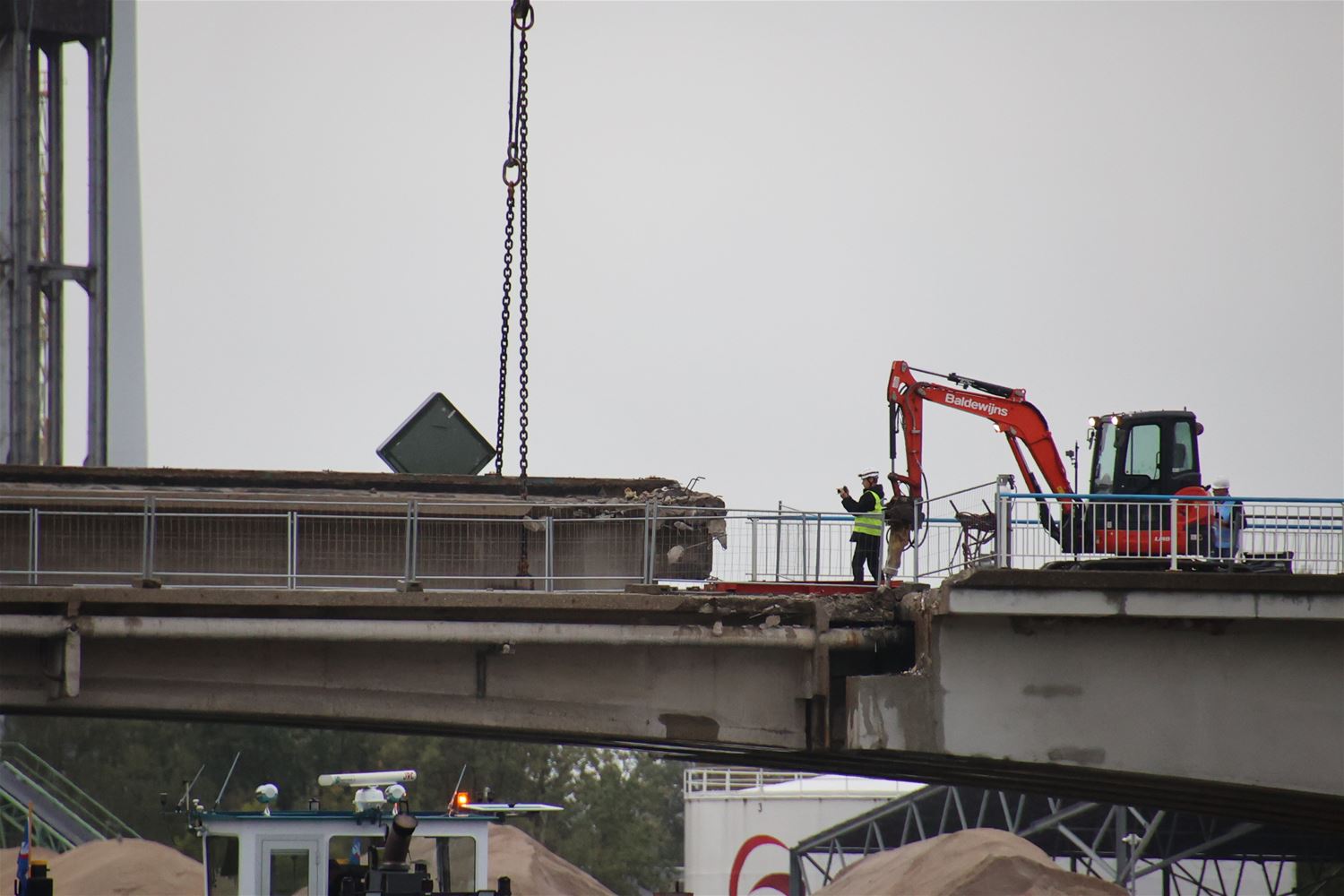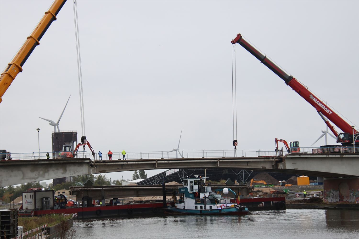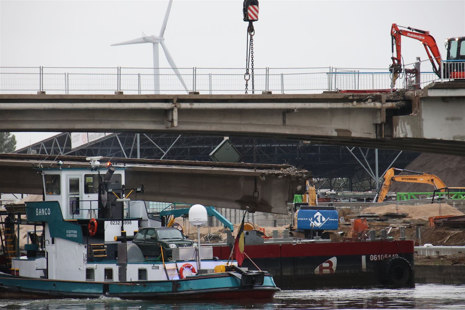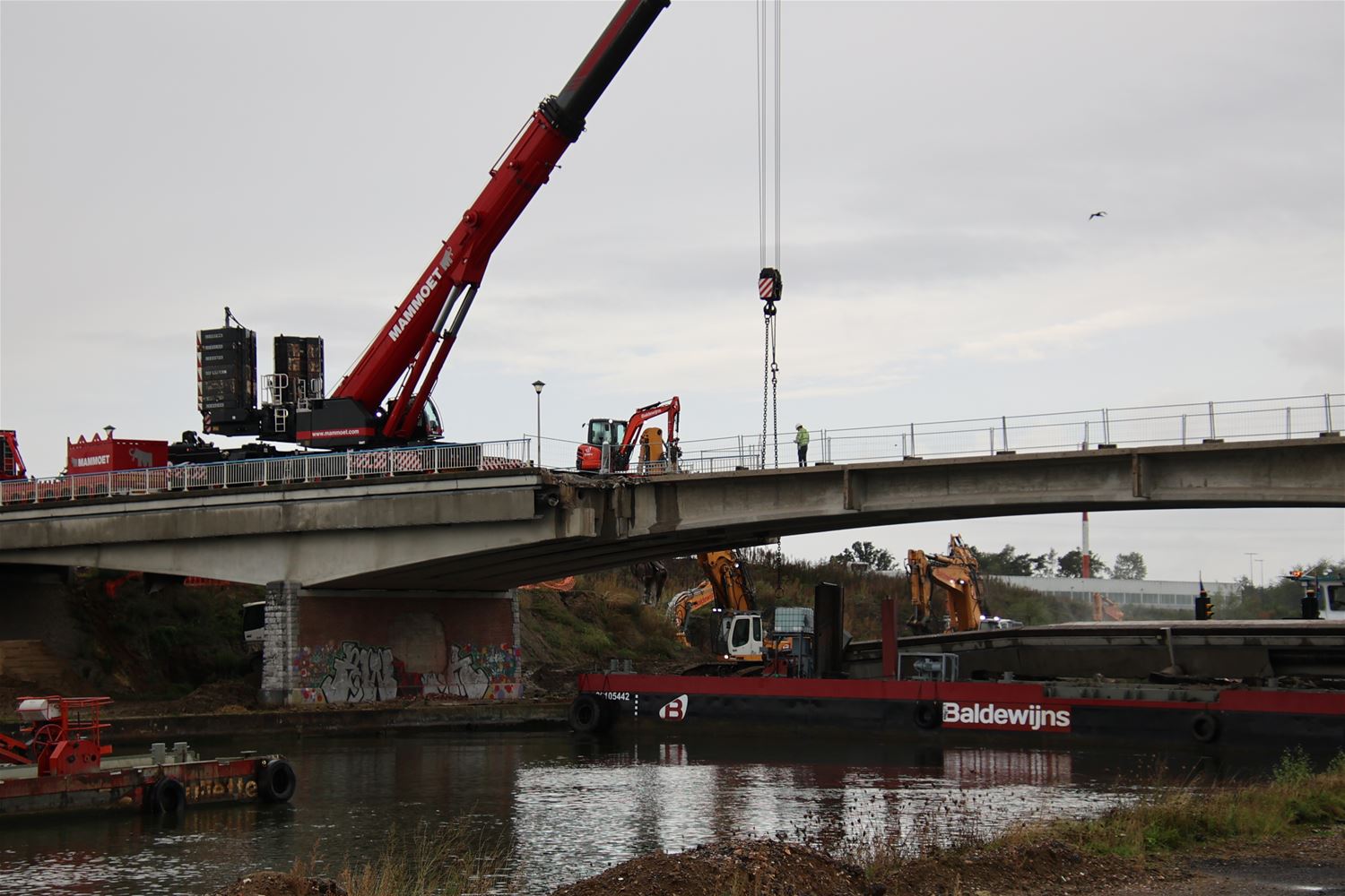 Vanmorgen vroeg zijn arbeiders en ingenieurs gestart met de afbraak van de kanaalbrug in Viversel. Stuk voor stuk worden de elementen weggennomen, onder de brug zorgt een ponton voor de opvang van brokstukken. Vanochtend ging de tweede brugpijler eraan en even later lag alleen nog het wegdek op zijn plaats. 75395