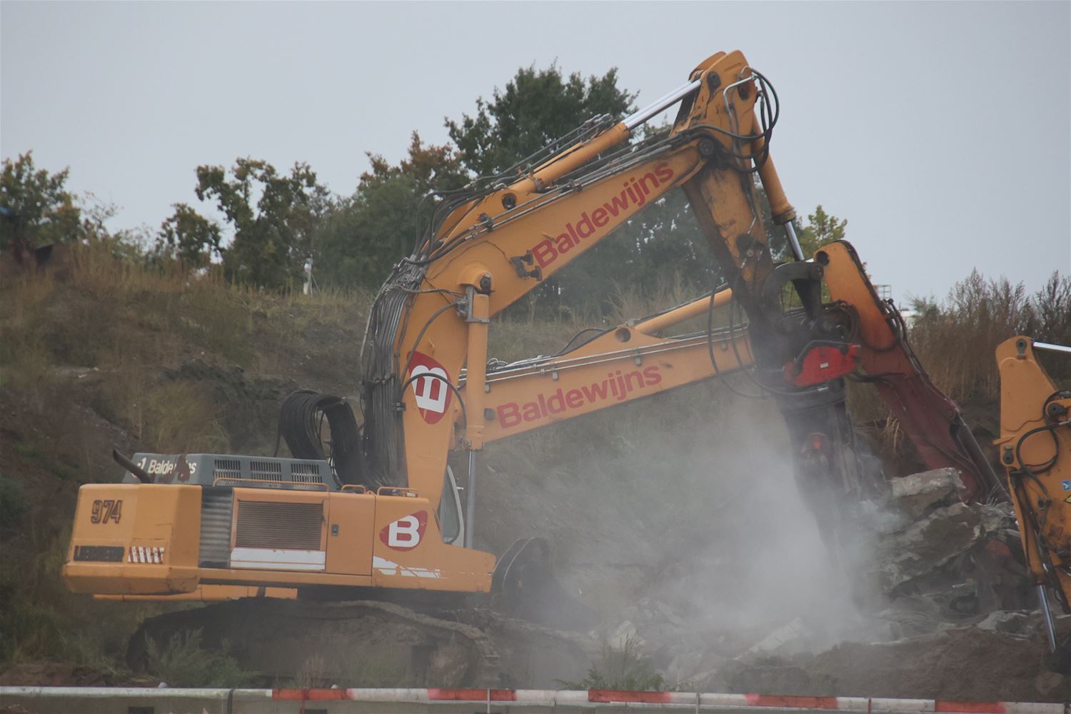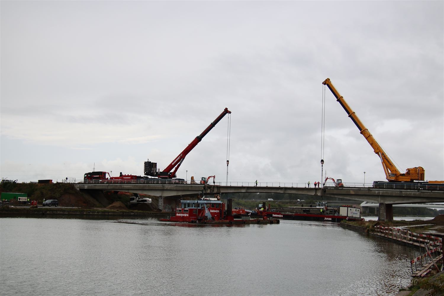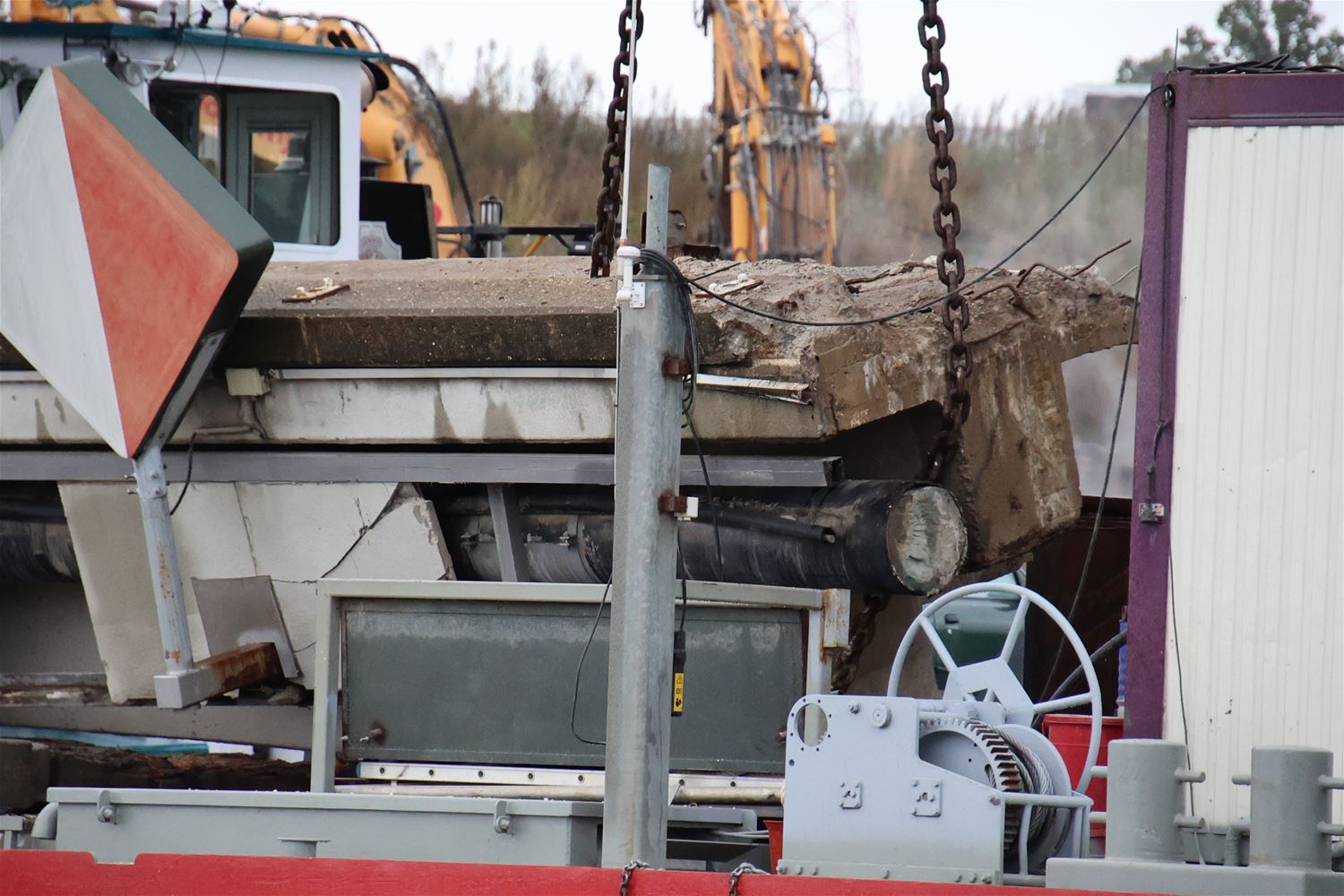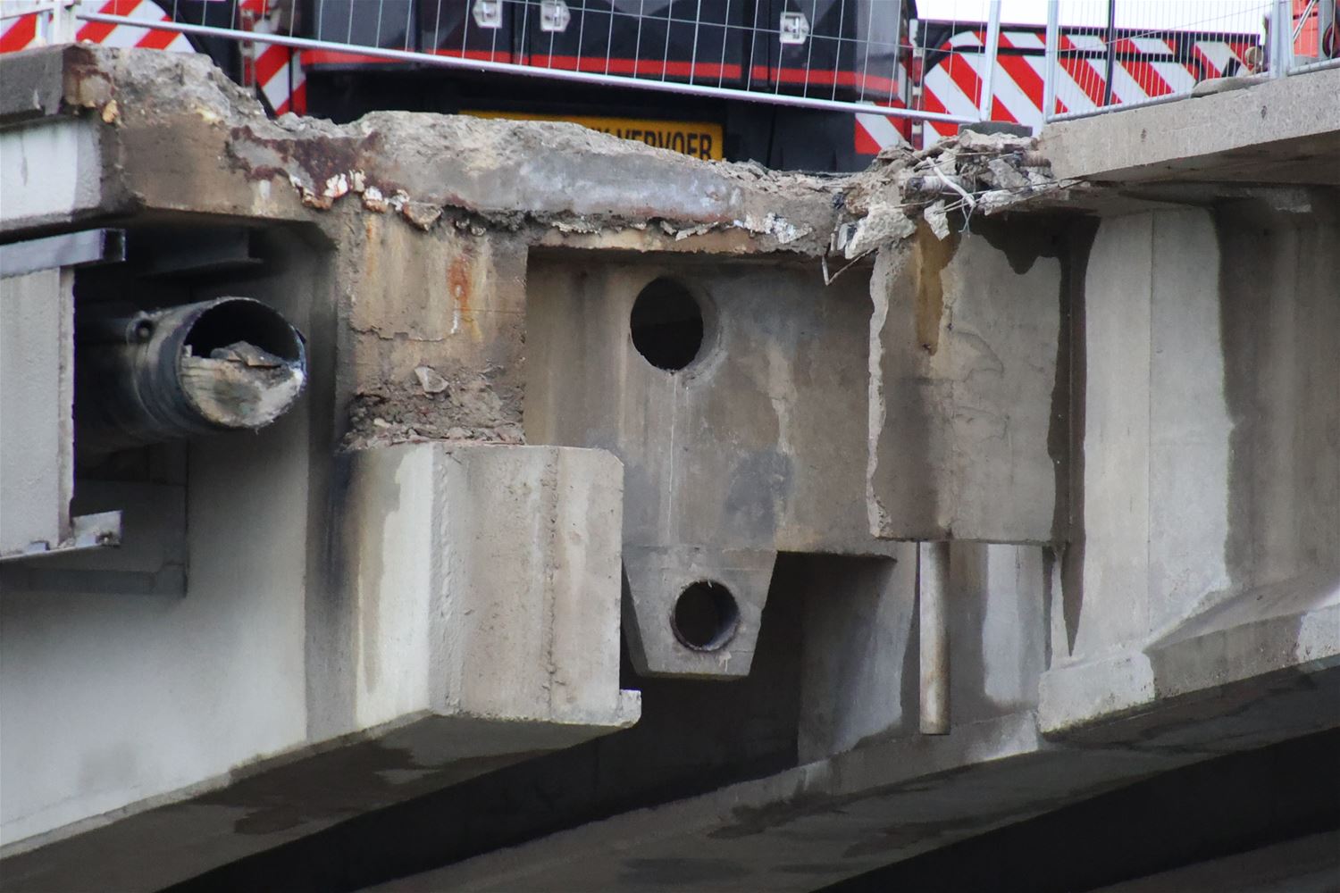 Vanmorgen vroeg zijn arbeiders en ingenieurs gestart met de afbraak van de kanaalbrug in Viversel. Stuk voor stuk worden de elementen weggennomen, onder de brug zorgt een ponton voor de opvang van brokstukken. Vanochtend ging de tweede brugpijler eraan en even later lag alleen nog het wegdek op zijn plaats. 75395