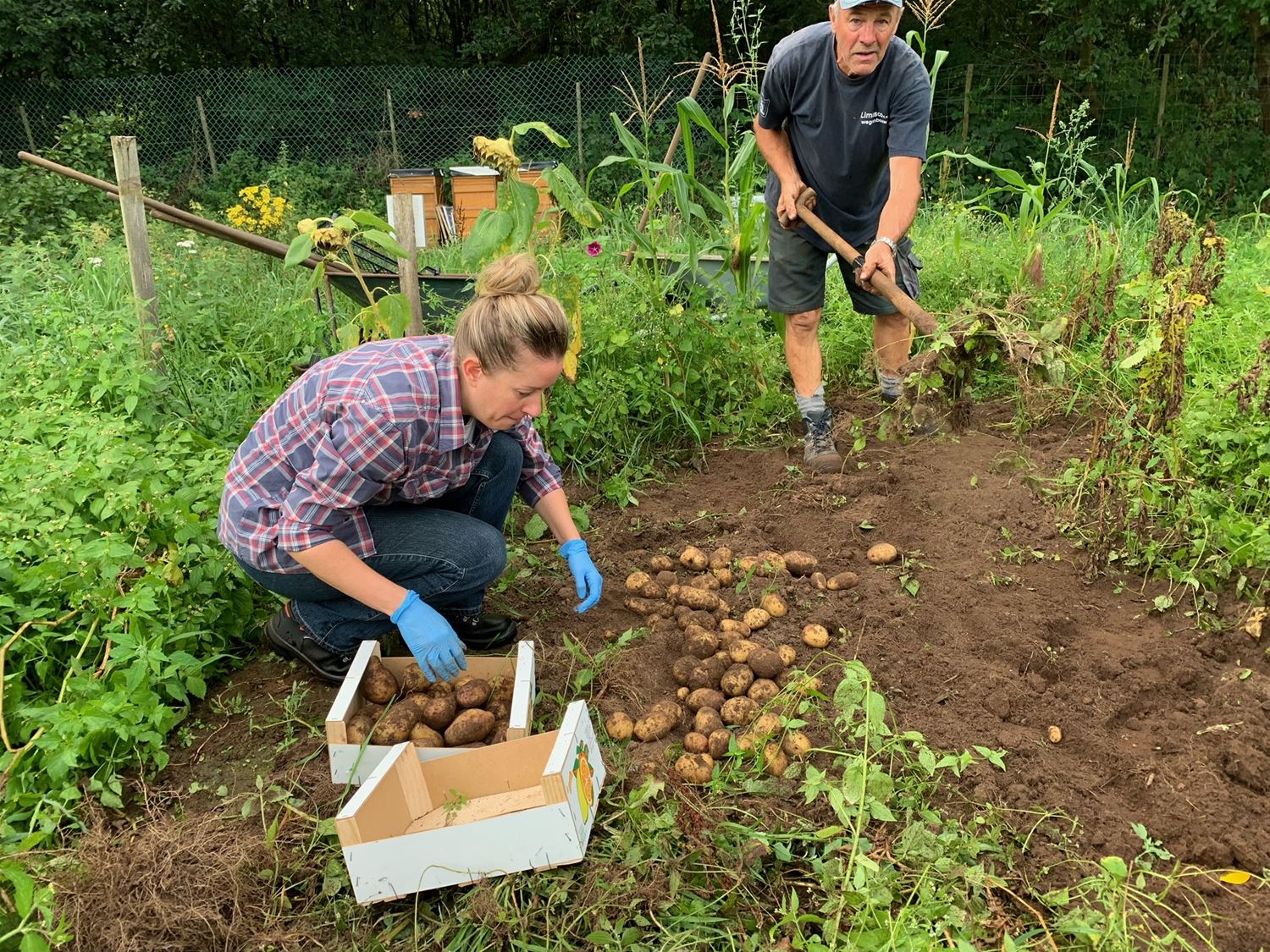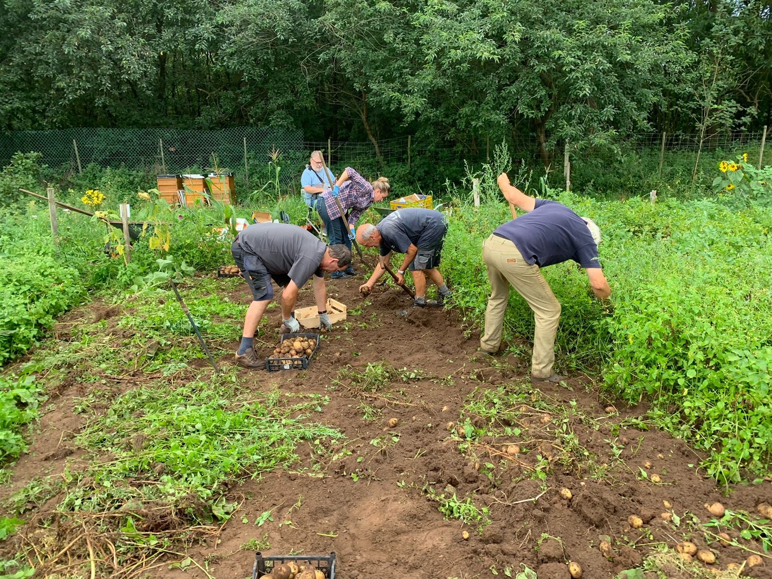 Het was vandaag een belangrijke dag in de dorpstuintjes. Daar werden de Carolus-bioaardappelen gerooid. Ook hebben de tuinders het onkruid gewied in de Sevilla-aardappelen die ze later oogsten. "Samen tuinen" luidt overigens het devies. En de koffiepauze met zelfgebakken cake is daar een wezenlijk onderdeel van. (foto's Julien Maebe)78340