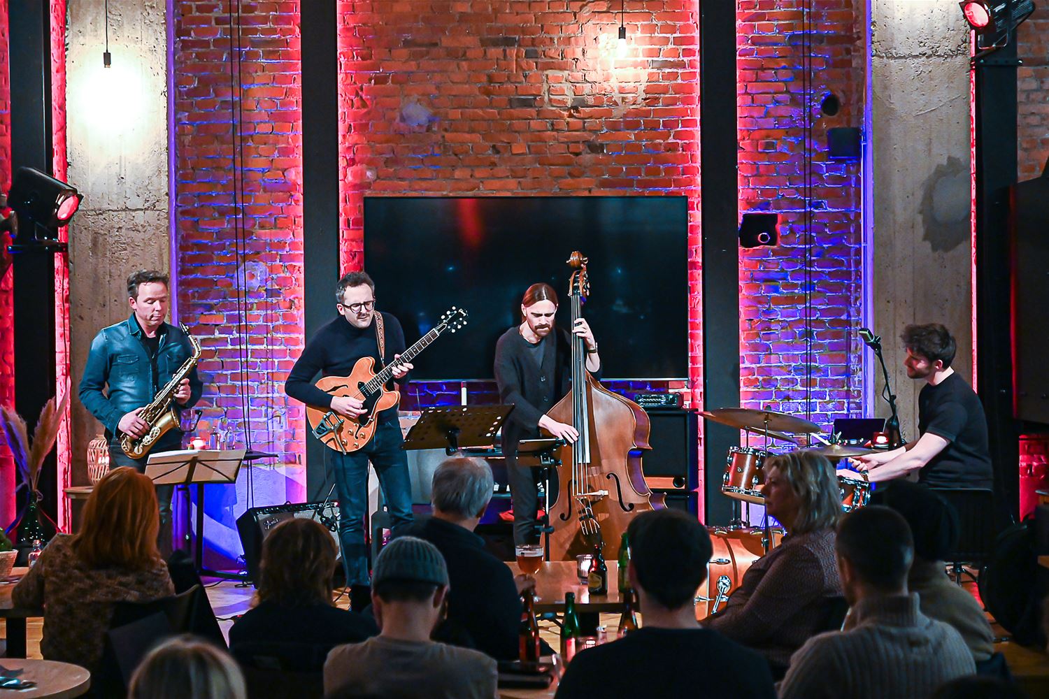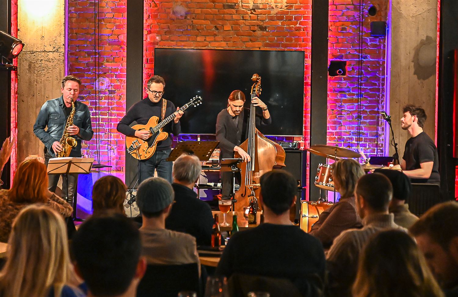 De eerste zondag van de maand betekent ... jazz in het MuzeCafé. Deze keer had MJO Rob Vanspauwen geïnviteerd. De contrabassist bracht saxofonist Daniël Daemen, gitarist Tim Finoulst en drummer Gert-Jan Dreessen mee. Samen creëren ze een eigen sound opgehangen aan open, monder, traditioneel en ... kamermuziek. (foto's Roman Martyka)76884