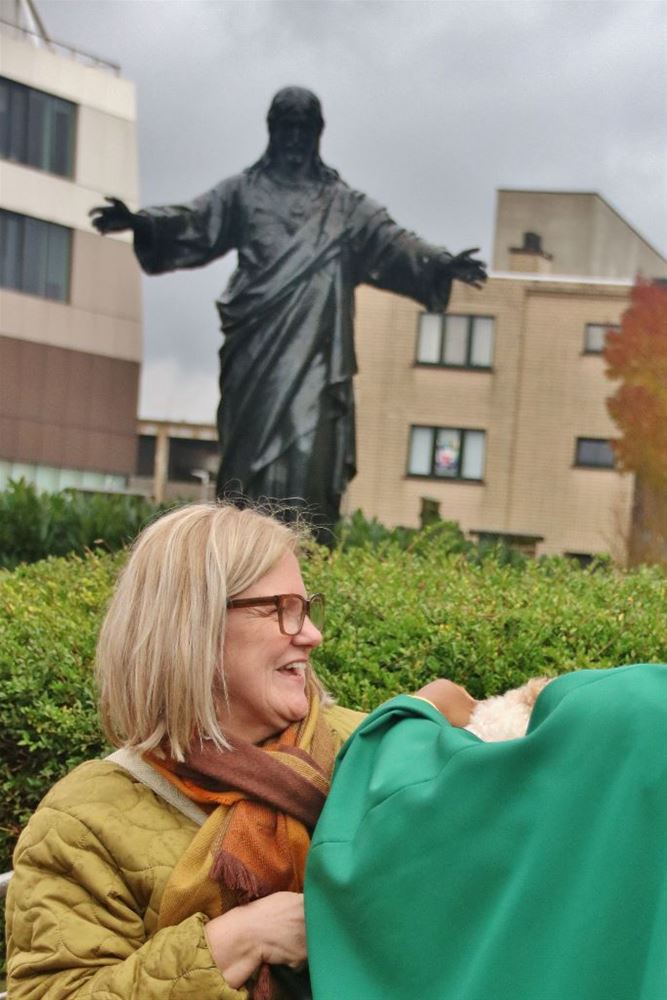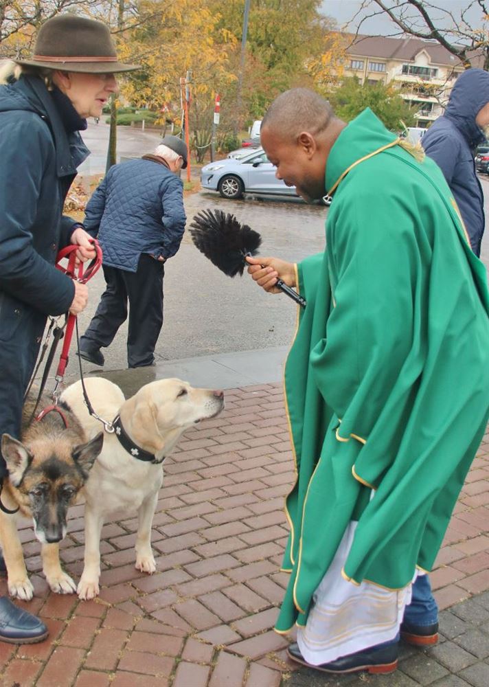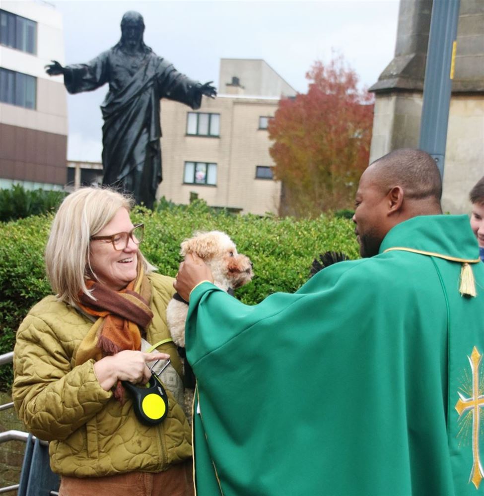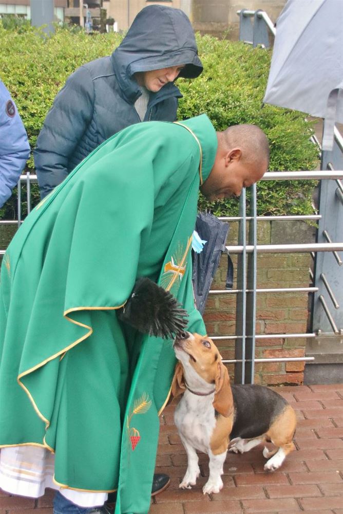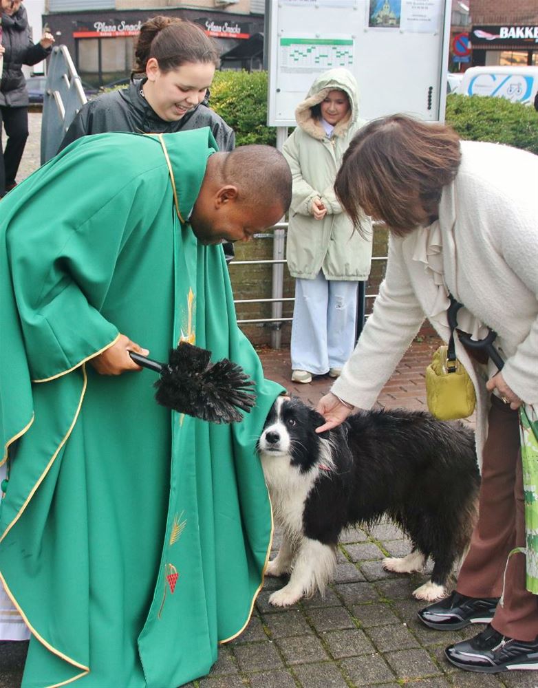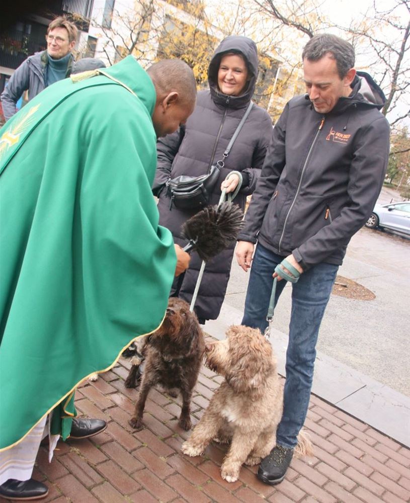Zolder-Centrum vierde vandaag één van zijn patroonheiligen: Sint-Hubertus. Dat gebeurde eerst met een eucharistieviering waarin het Sint-Hubertusbrood werd gezegend en uitgedeeld. Aansluitend had de ondertussen traditionele dierenzegening plaats voor de ingang van de kerk. Heel wat baasjes waren daar met hun honden naartoe gekomen. Ze kregen allemaal de zegen van pastoor Ghislain Agognon. En ondertussen probeerden heel wat viervoeters nieuwe vriendschappen te sluiten, slechts sporadisch was wat gegrom te horen. (foto's Tony Sempels)79036