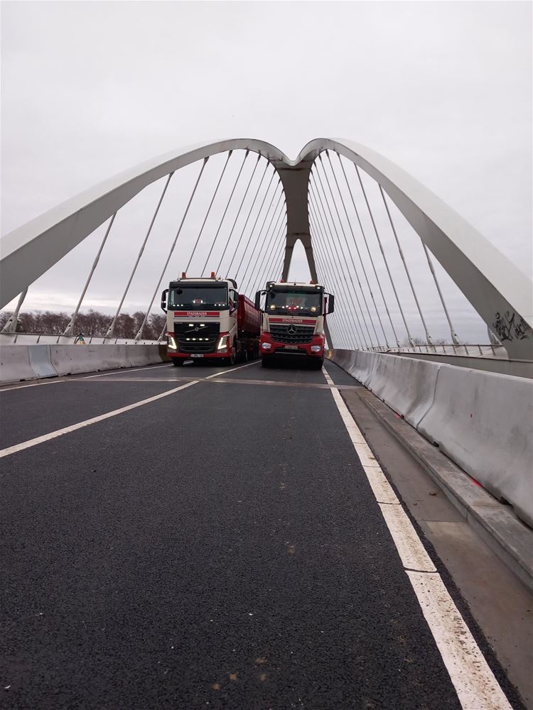 Met 16 stevige vrachtwagens voert de firma Stadsbader vanmorgen een belastingproef uit op de nieuwe brug in Viversel. Dat moet duidelijk maken hoever de brug doorbuigt onder zware belasting. Maar het ziet ernaar uit dat alles in orde is en dat de diensten van De Vlaamse Waterweg deze namiddag de brug zullen openstellen voor het verkeer. En dan kan iedereen vlot en veilig het Albertkanaal oversteken. (foto's Vlaamse Waterweg)76236