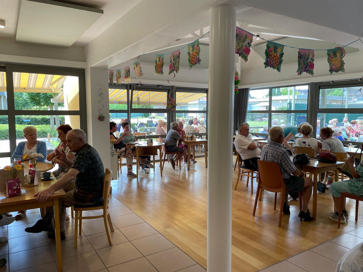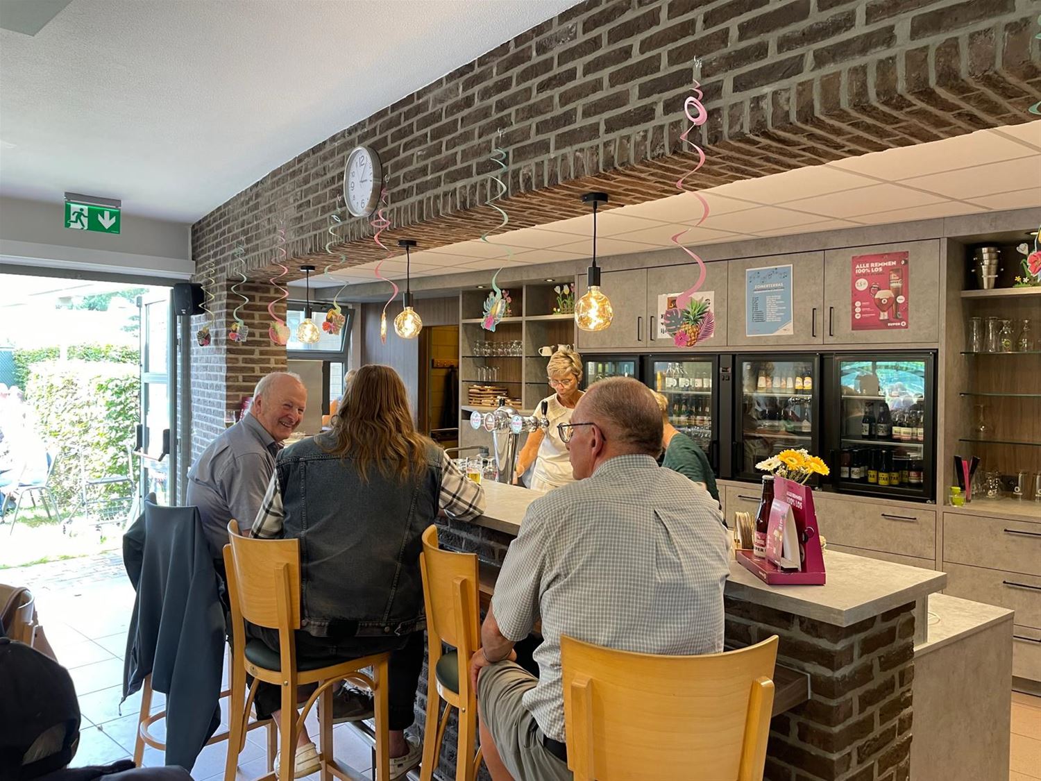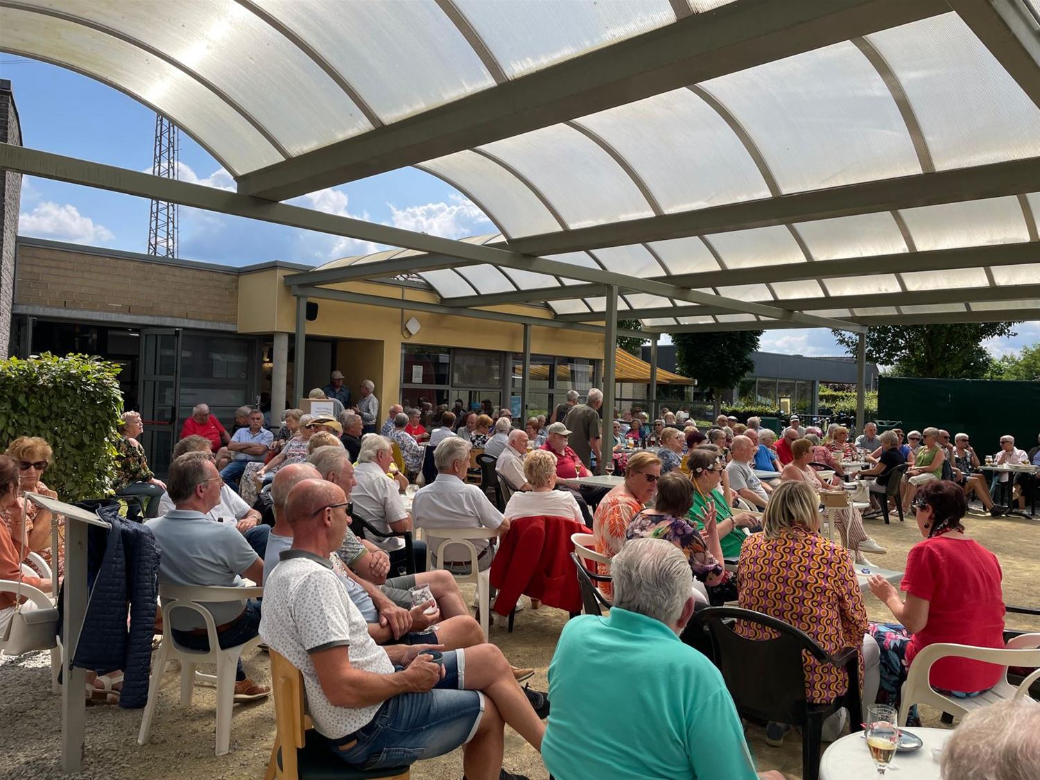 Tijdens de zomermaanden is er aan De Zandloper elke woensdag een live-optreden. Vandaag speelden daar de Mixties, zij vertolkten vooral dansmuziek uit de sixties. Samen met het mooie weer bracht dat heel wat volk op de been, naar schatting een 200-tal aanwezigen namen plaats op een vol terras, in de cafetaria en aan de toog. De sfeer zat er goed in.82549