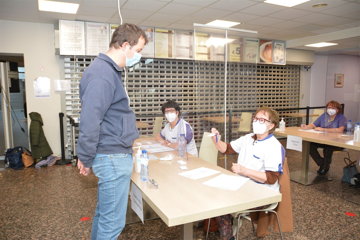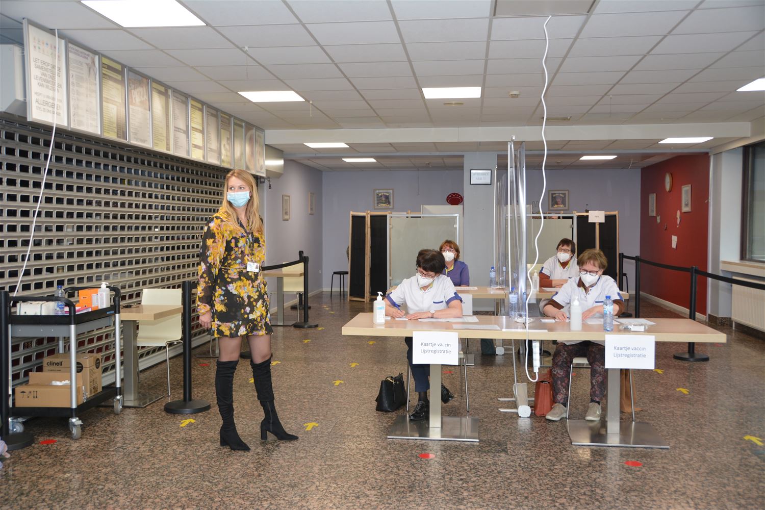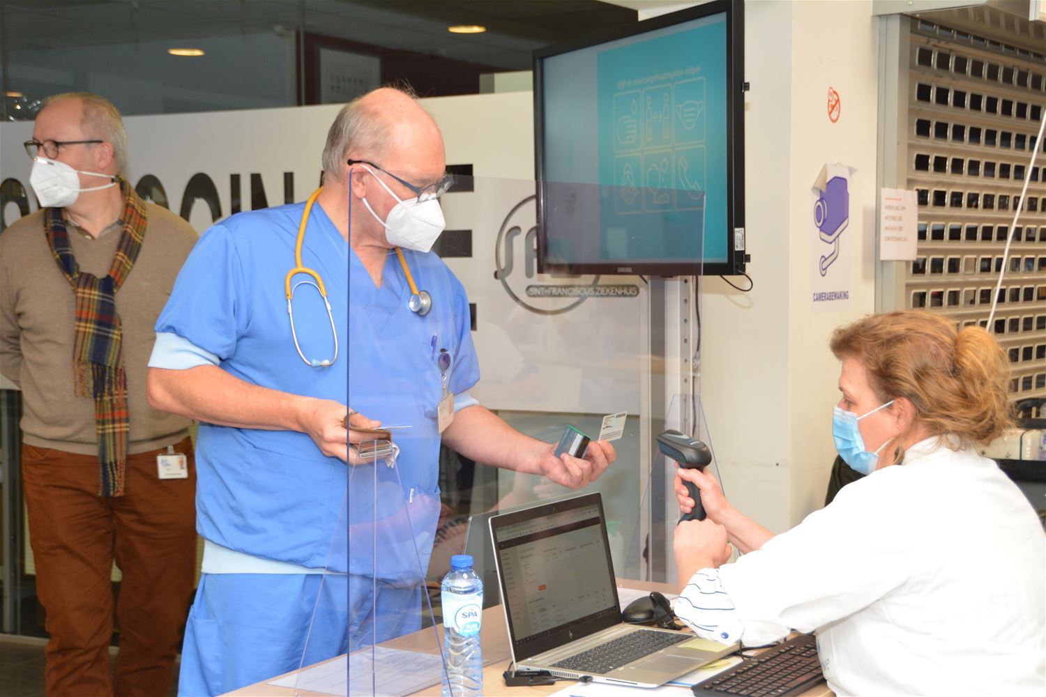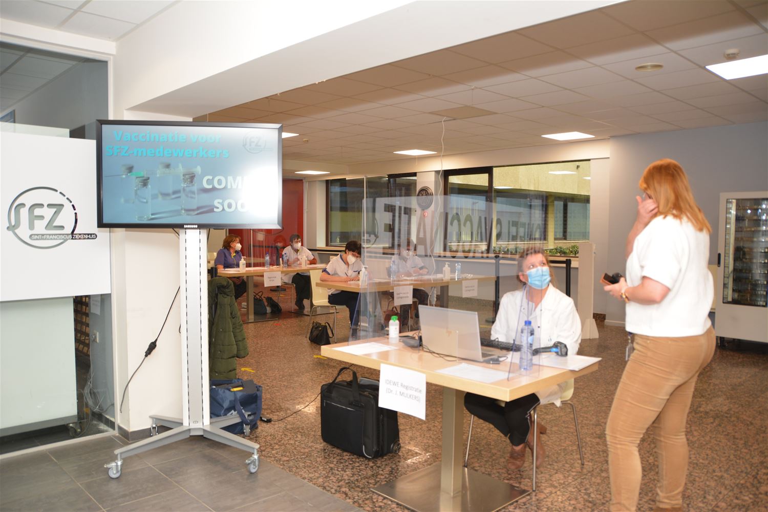 In het Sint-Franciscusziekenhuis zijn zojuist de eerste personeelsleden gevaccineerd tegen COVID-19. Ze kregen het Moderna- vaccin toegediend. Dat was pas vanmorgen op de luchthaven van Zaventem toegekomen. In het ziekenhuis was een hele 'vaccinatieparcours' uitgebouwd, zoals dat in de externe vaccinatiecentra ook gebeurt. Gepensioneerde medewerkers waren als vrijwilliger opgekomen om daarbij te helpen. De vaccinaties werden toegediend door voormalig hoofdgeneesheer Luc Geutjens en voormalig pediater Marie-Thérèse Van Damme. In het totaal krijgen vandaag minstens 100 van de 1010 personeelsleden hun vaccin, onder meer medewerkers van spoed en intensieve. (foto's Marina Poelmans)