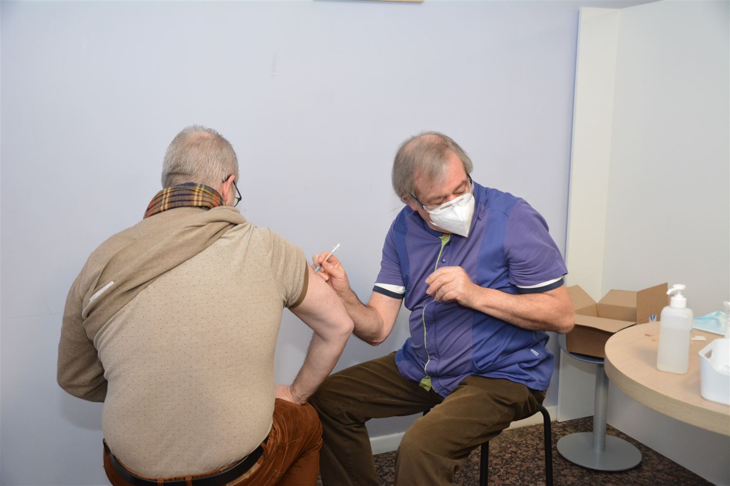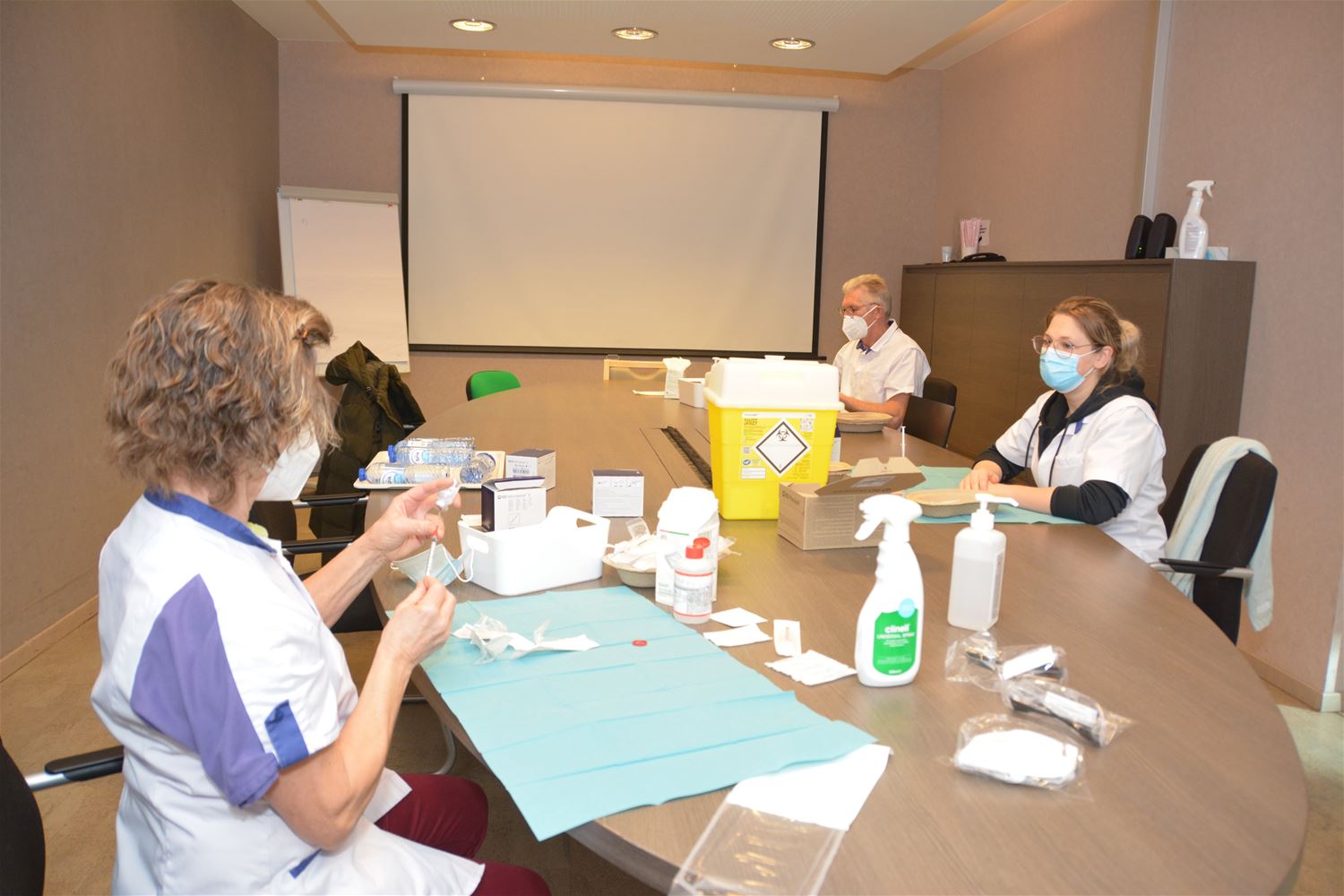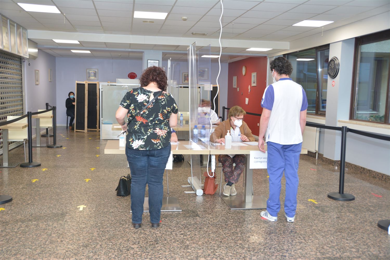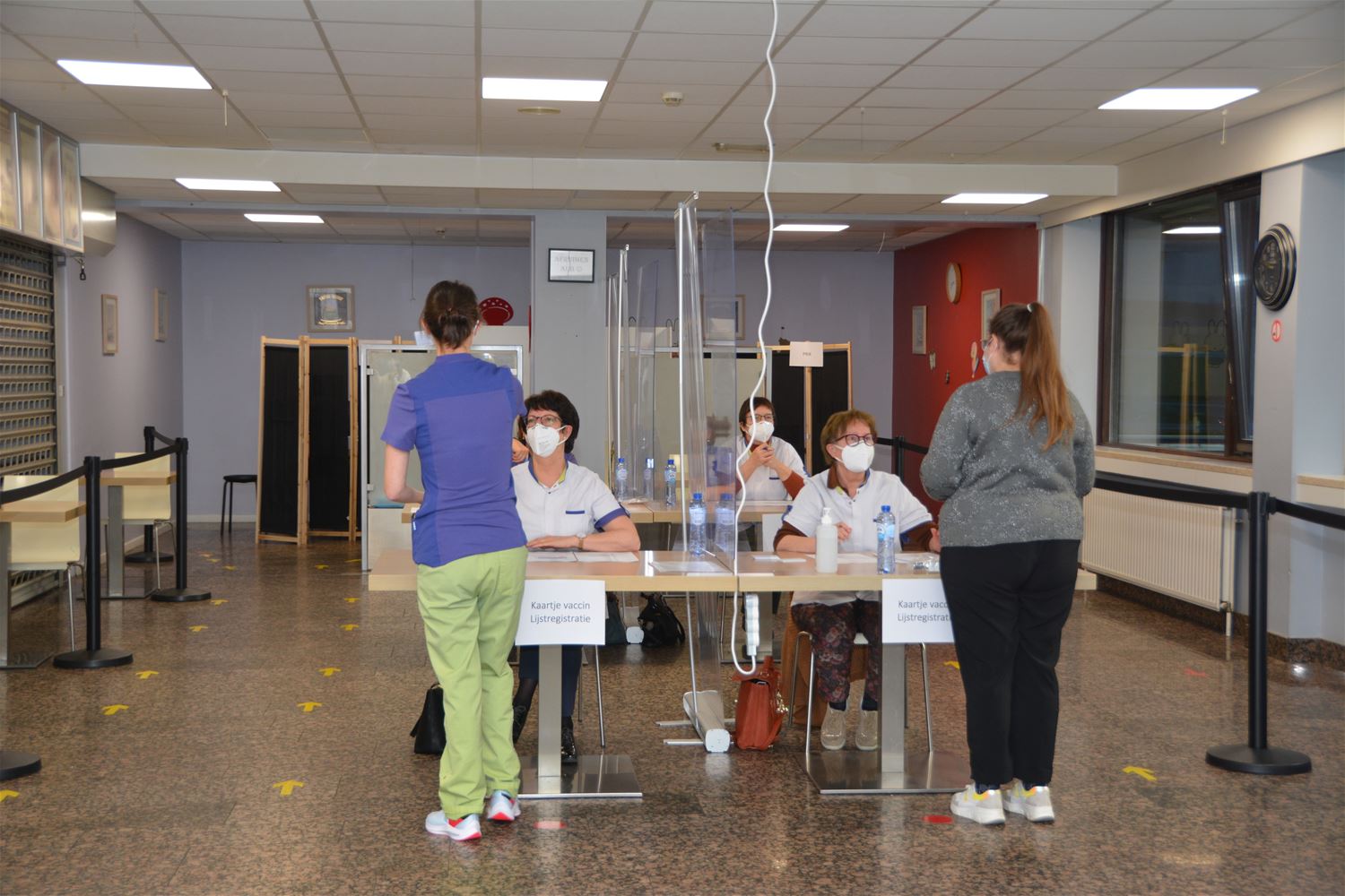 In het Sint-Franciscusziekenhuis zijn zojuist de eerste personeelsleden gevaccineerd tegen COVID-19. Ze kregen het Moderna- vaccin toegediend. Dat was pas vanmorgen op de luchthaven van Zaventem toegekomen. In het ziekenhuis was een hele 'vaccinatieparcours' uitgebouwd, zoals dat in de externe vaccinatiecentra ook gebeurt. Gepensioneerde medewerkers waren als vrijwilliger opgekomen om daarbij te helpen. De vaccinaties werden toegediend door voormalig hoofdgeneesheer Luc Geutjens en voormalig pediater Marie-Thérèse Van Damme. In het totaal krijgen vandaag minstens 100 van de 1010 personeelsleden hun vaccin, onder meer medewerkers van spoed en intensieve. (foto's Marina Poelmans)