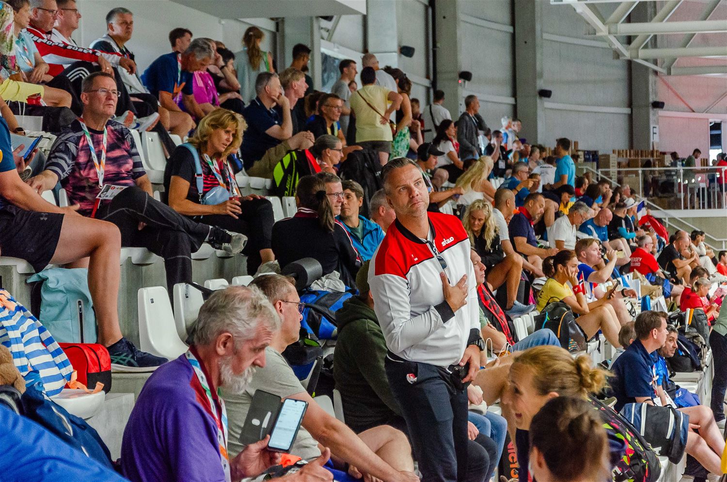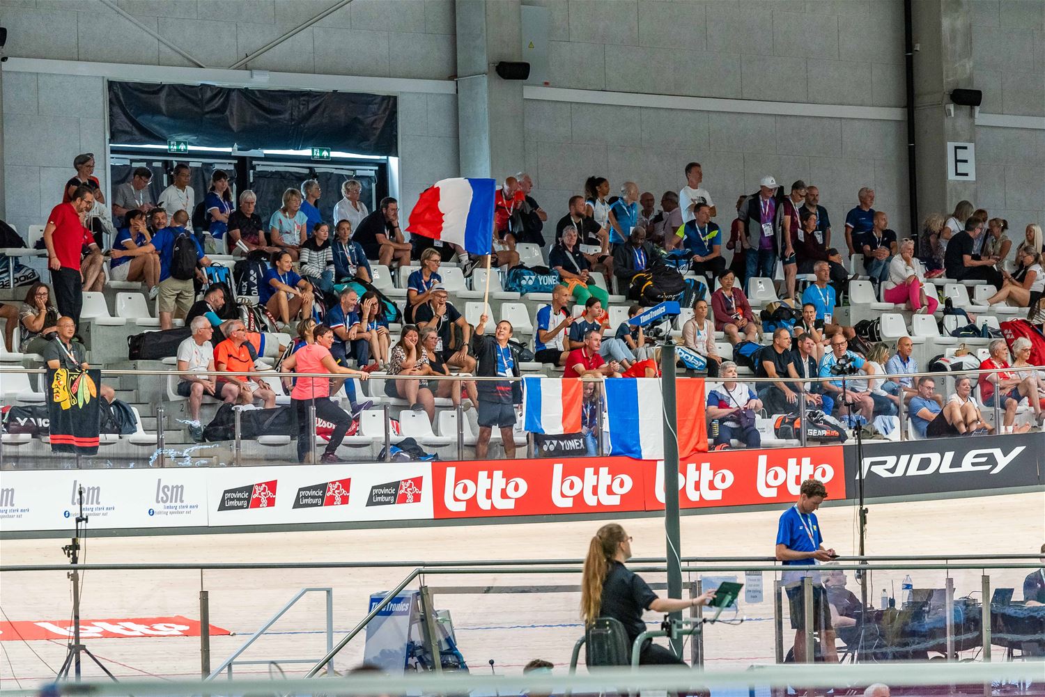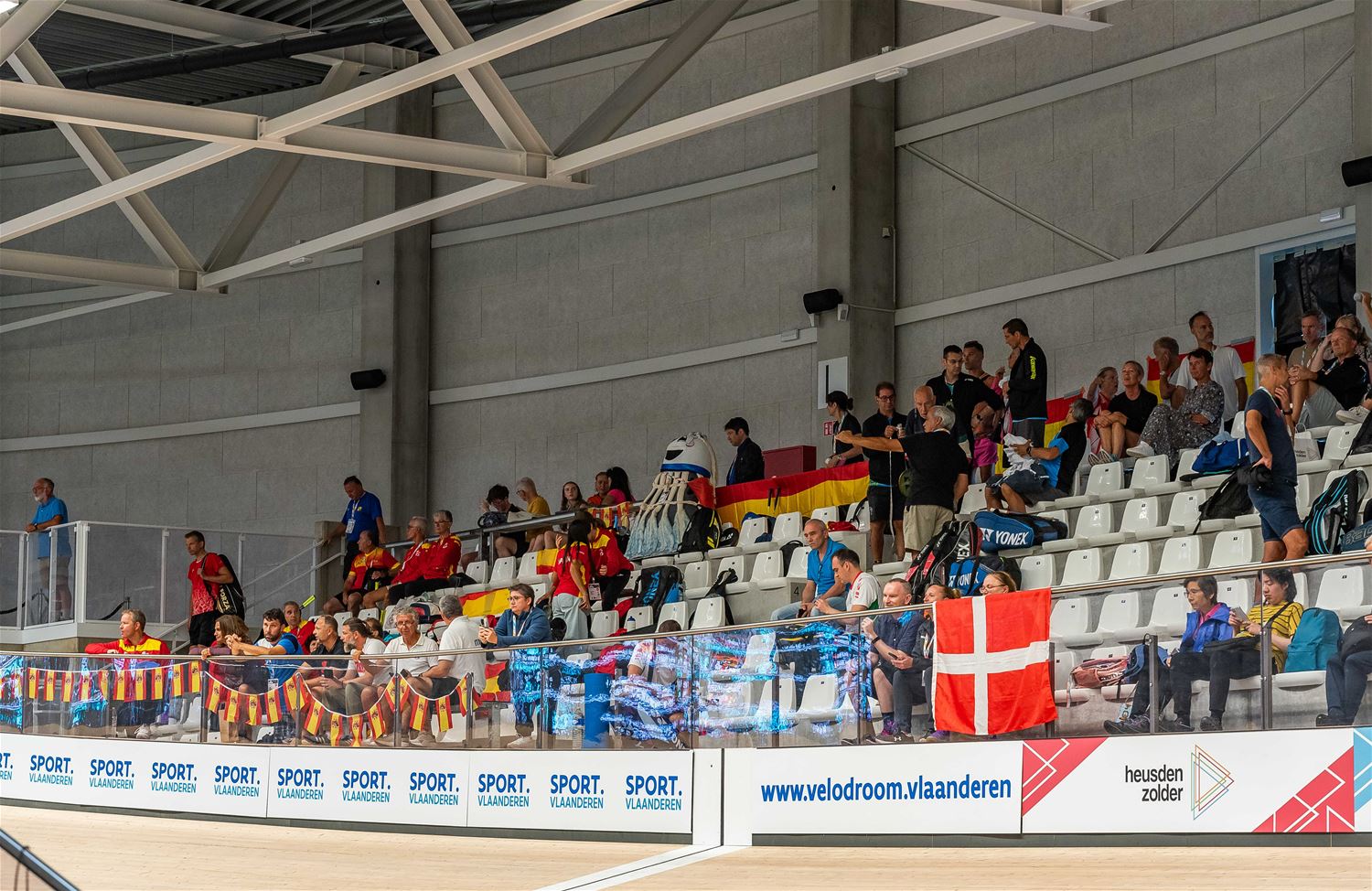 Er was heel wat belangstelling vandaag voor de eerste wedstrijden op het EK badminton. Een kleurrijk gebeuren ook met veel vlaggen en andere nationale attributen die de verschillende delegaties mee op de tribune hebben gebracht. Elk moedigde zijn eigen spelers extra aan, ook de lokale topper Marleen Loos kreeg de nodige steun. (foto's Ann Jordens)82794