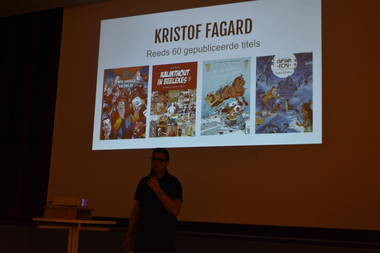 Striptekenaar Kristof Fagard - alias Fagard, bekend van de reeks Kiekeboe - was vandaag te gast bij KWB-Overdag. Hij heeft al 60 titels op zijn naam staan. Hij vertelde hoe een verhaal wordt opgebouwd: eerst de voorstelling van de hoofdfiguren, daarna de risico’s en de gevaren die op de loer liggen, de crisismomenten en dan wordt het verhaal naar een climax gestuwd, om te eindigen met een afronding. Fagard ontrafelde heel het productieproces. Ons land is trouwens nog altijd toonaangevend in de stripwereld. (foto's Ludo Deleux)76782
