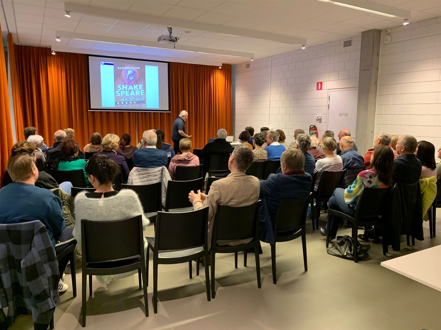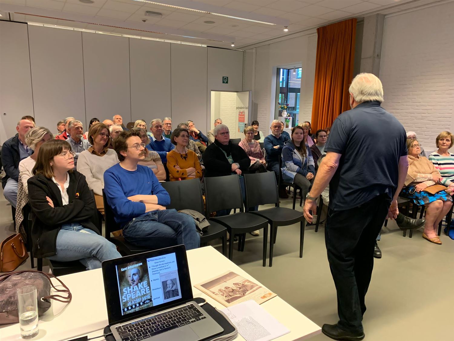 Liefst 40 belangstellenden waren vanavond naar de bibliotheek afgezakt voor de lezing van Karel Deburchgrave over 'Shakespeare in scène gezet' dat hij zopas in boekvorm heeft uitgebracht. Heel wat mensen uit de streek hebben destijds aan het college in Berkenbos nog Engels gekregen van Karel Deburchgrave. Tegelijk bracht hij toen al zijn passie voor film aan de leerlingen over, onder meer ook door filmuitstappen naar de toenmalige Trioscoop te organiseren. Ook nu nog is hij filmrecensent en docent en zit geregeld in de jury van buitenlandse filmfestivals. Maar hij is ook een Shakespeareliefhebber en kent alle films over de Engelse toneelschrijver of de verfilmingen van zijn werk. Die beide passies hebben elkaar gevonden in dit werk. Het boek is gelardeerd met citaten en fragmenten en zelf leidt de auteur de lezer door de vragen, mysteries en anekdotes die al eeuwen meegaan met de figuur van William Shakespeare. Het was dan ook met veel vuur en passie dat hij vanavond in de bib zijn verhaal bracht voor een publiek dat aan zijn lippen gekluisterd zat. Het boek 'Shakespeare in scène gezet' van Karel Deburchgrave is uitgegeven door Ertsberg, het telt 229 bladzijden (inclusief namenregister) en kost € 27,50. (foto's Julien Maebe)77469