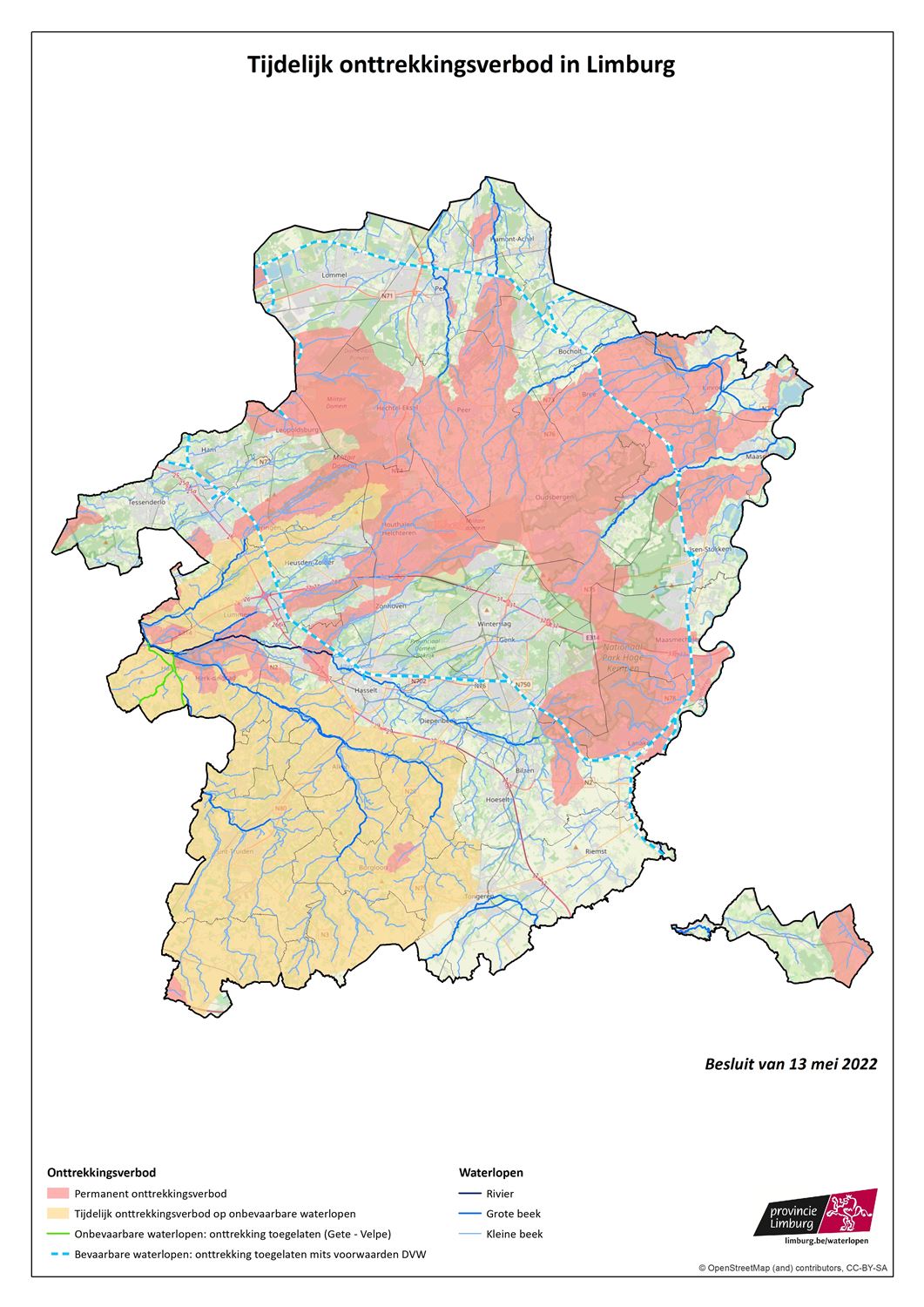 Na een Limburgs droogteoverleg heeft de gouveneur beslist om het onttrekkingsverbod uit rivieren en waterlopen uit te breiden. Dat heeft te maken met de aanhoudende droogte en het feit dat er de komende twee weken geen verbetering wordt verwacht. Sinds 1 januari dit jaar mag sowieso al geen water gepompt worden uit de meest kwetsbare waterlopen. Vanaf morgen komt daar nog een tijdelijk verbod bij door drie stroomgebieden. Daarbij zit ook het volledige stroomgebied van de Zwarte Beek in de gemeenten Houthalen-Helchteren, Beringen, Heusden-Zolder, Lummen, Herk-de Stad en Halen. Er zijn enkele uitzonderingen zoals voor de brandweer en het drenken van vee. Het besluit blijft van kracht zolang de droogte aanhoudt.73037