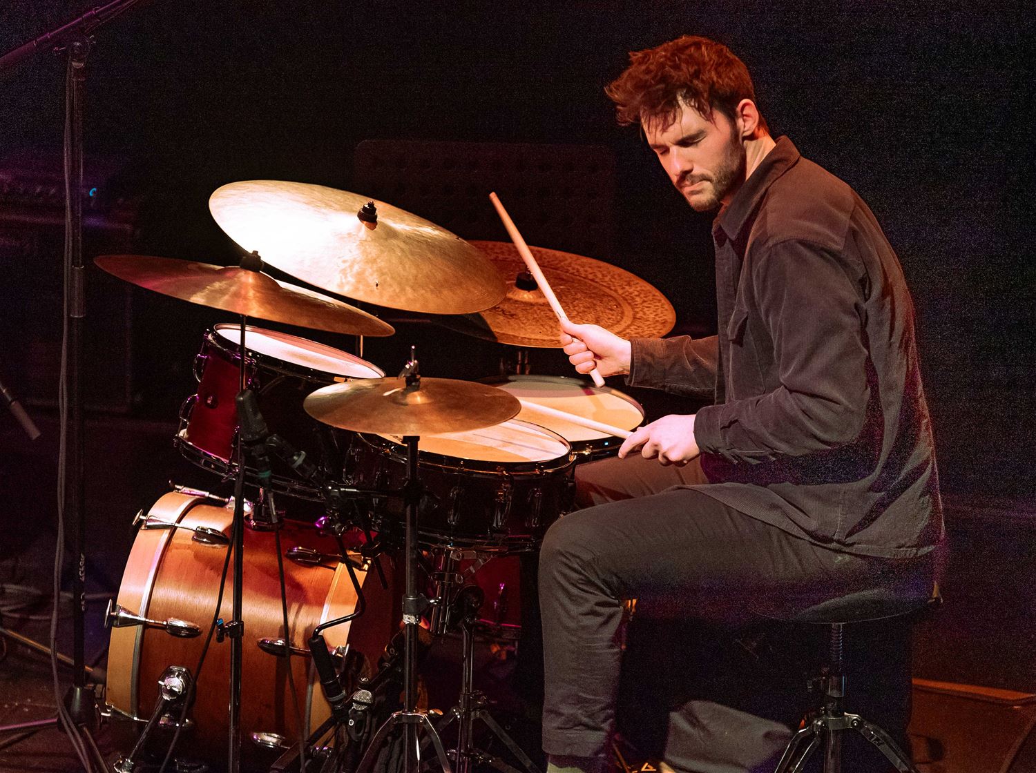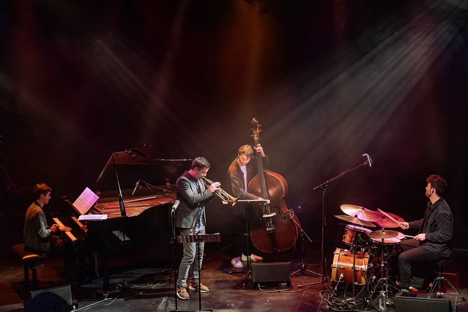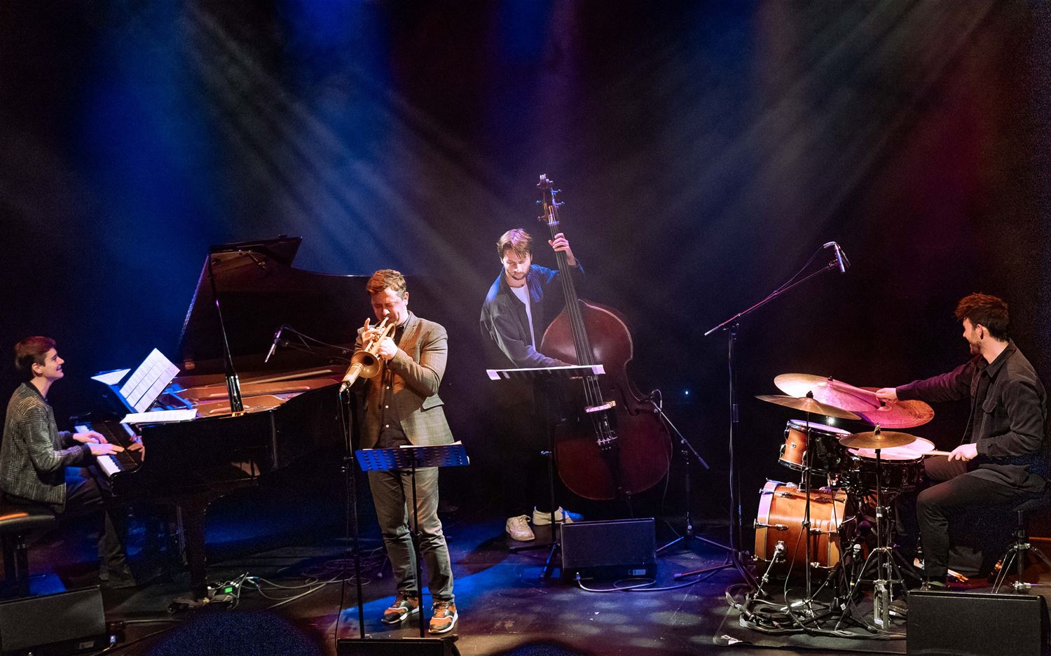Drummer Gert-Jan Dreesen was al vaker aan het werk te zien in CC Muze. Vrijdagavond stelde hij zijn eigen kwartet voor. Het is een akoestisch kwartet met pianist Bram De Looze, trompettist Jean-Paul Estiévenart en drummer Cyrille Obermüller. Het talrijke publiek genoot van zijn eigen jazzy composities. (foto's Ann Jordens)79252