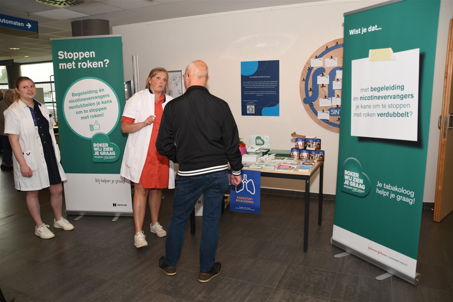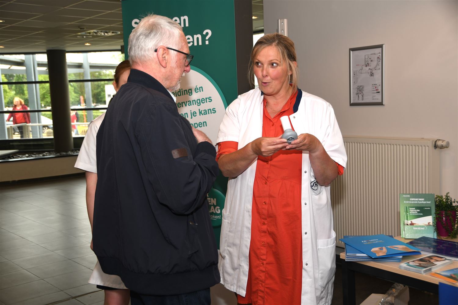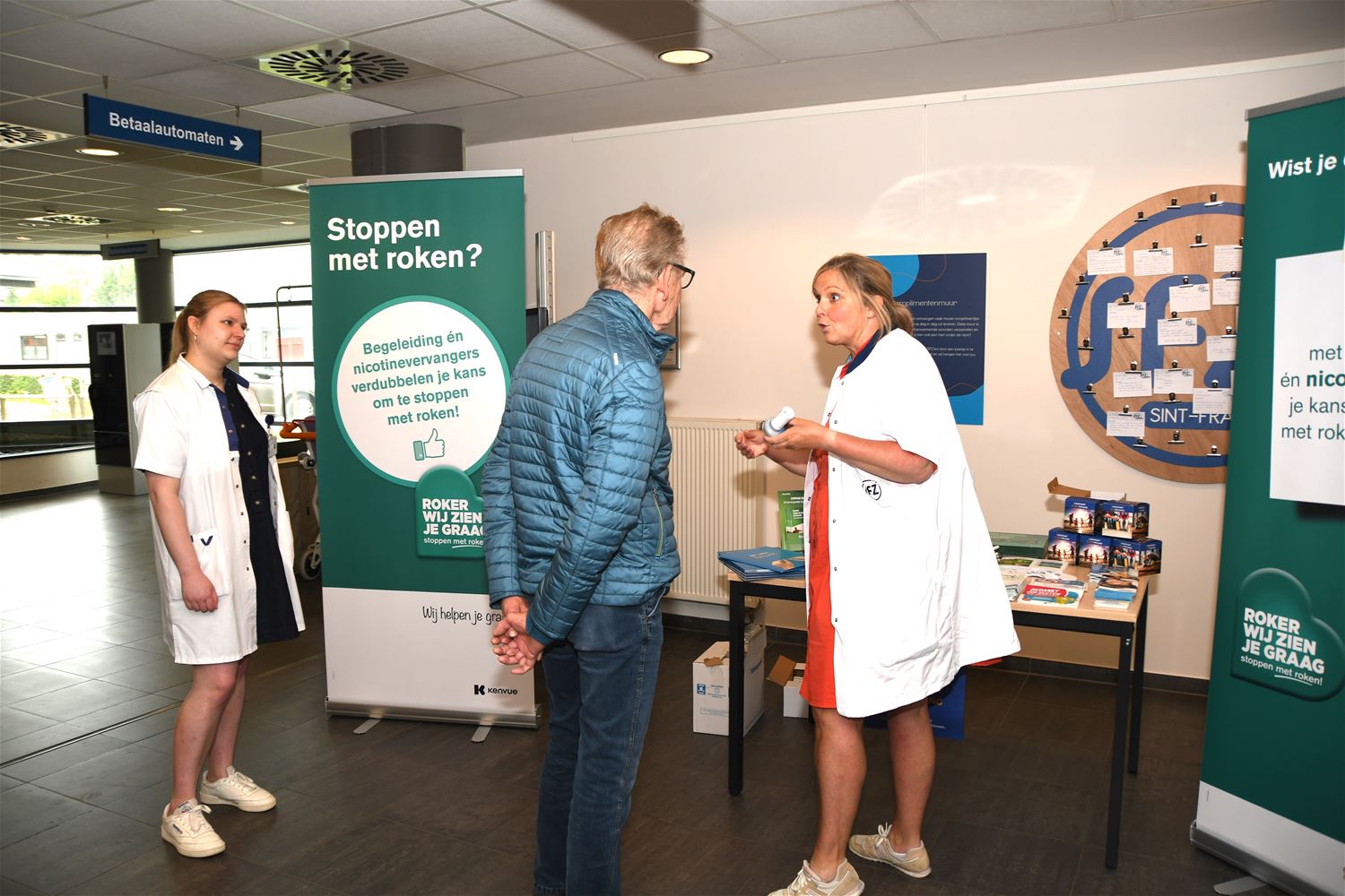 Op deze Werelddag zonder Tabak was er in het Sint-Franciscusziekenhuis heel wat belangstelling voor de infostand waar je je longleeftijd kon laten testen. Vooral mannen met een zekere leeftijd waren zelfs speciaal daarvoor naar de inkomhal van het ziekenhuis afgezakt. Ze kregen uitleg en tips van een enthousiaste Ellen Wendt, de tabacologe van het ziekenhuis. Opvallend ook, bij de personen die zich lieten testen waren er veel die al een aantal jaren gestopt waren met roken. Hun resultaten waren uiteenlopend. Maar er was bijvoorbeeld een man die al 11 jaar gestopt was en bij wie deze test geen schade kon vaststellen. "Het is dan ook nooit te laat om te stoppen met roken", geeft Ellen als belangrijke boodschap mee aan de bezoekers. Nog tot 11.30 uur kun je terecht in de inkomhal van het ziekenhuis.81081