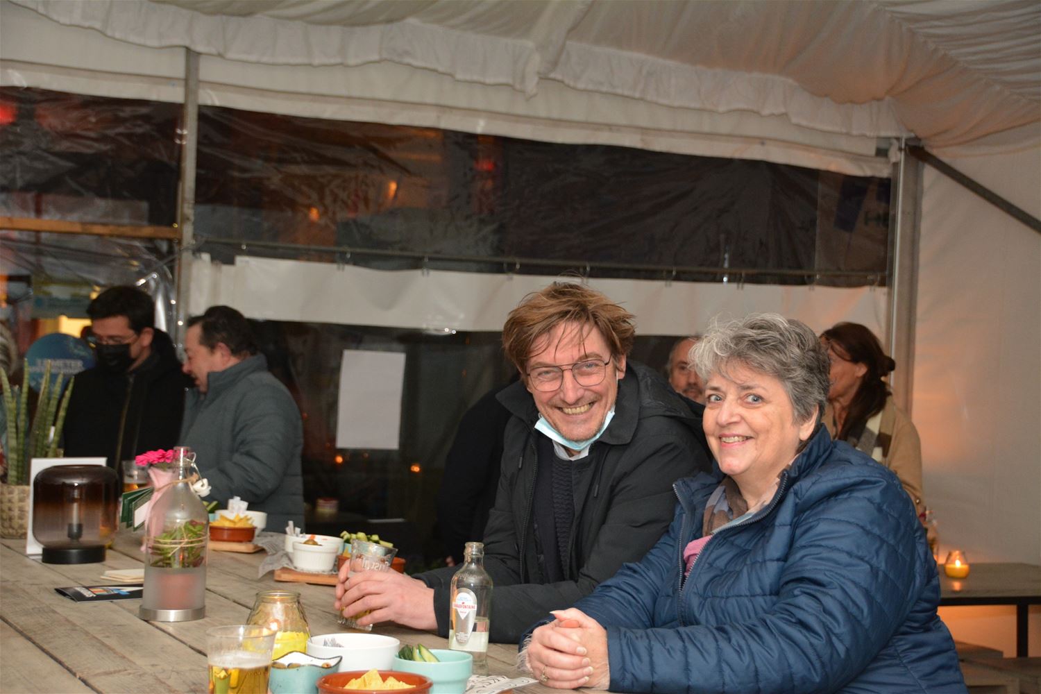 De Handelaars Heusden Dorp hielden vanavond alsnog een rececptie bij het begin van het nieuwe jaar. Daarvoor hadden ze de veilige omgeving van de tent bij Tennis- en Padelclub Heusden gekozen. Co-voorzitter Andy Vanhoudt stak zijn bewondering voor de collega's niet onder stoelen of banken omdat zij in de afgelopen twee jaar zijn blijven ondernemen en initiatieven nemen. Hij verwacht een goed ondernemersjaar. Het kleinschalige kerstevent in december vormde al een eerste aanzet . Voor zaterdag 25 juni - Heusden-kermis - kondigde hij een nieuwe editie aan van Heusden Bolt en er komt ook een mini-schlagerfestival met Laura Lynn, Sam Gooris en een coverband. Voorts zette hij zijn co-voorzitter Greta Feyen met haar niet aflatende inzet in de spreekwoordelijke bloemetjes. Schepen van Handel en Middenstand Isabelle Thielemans feliciteerde de HHD met hun inzet en creativiteit en wenste hen een succesvol jaar toe waarin handelaars en ondernemers weer kunnen doen waarvoor ze hebben gekozen.72132