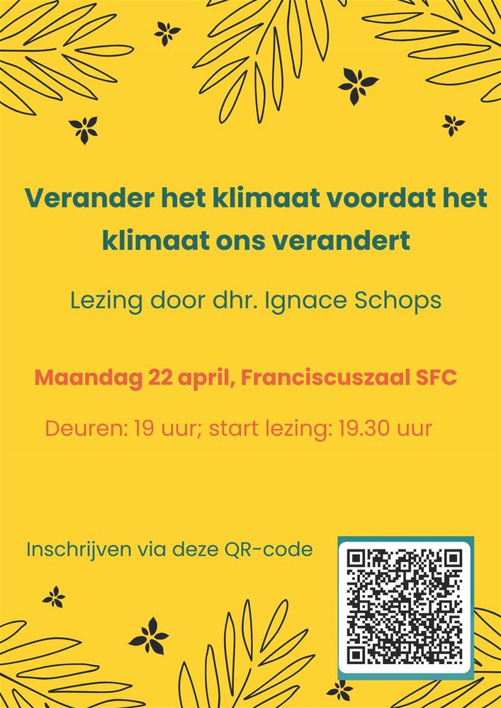 'Verander het klimaat, voordat het klimaat ons verandert'. Dat is het thema van een exclusieve lezing die Ignace Schops op maandag 22 april om 19.30 uur in de Franciscuszaal van het Sint-Franciscuscollege komt geven. Heusdenaar Ignace Schops is oud-leerling van het college. Hij is in binnen- en buitenland een gewaardeerd en gerenommeerd spreker over klimaat en natuur. Niet voor niets kreeg hij in 2008 de Goldman Environmental Prize of de Groene Nobelprijs en ontving hij een ere-doctoraat aan de UHasselt naast tal van andere onderscheidingen. Hij zal de aanwezigen meenemen in het verhaal van de klimaatverandering. De toegang is gratis, de opbrengst van de receptie achteraf en vrije giften wordt integraal geschonken aan de vzw Klimaatzaak. Vooraf inschrijven is noodzakelijk via de QR-code op de affiche hieronder.80671