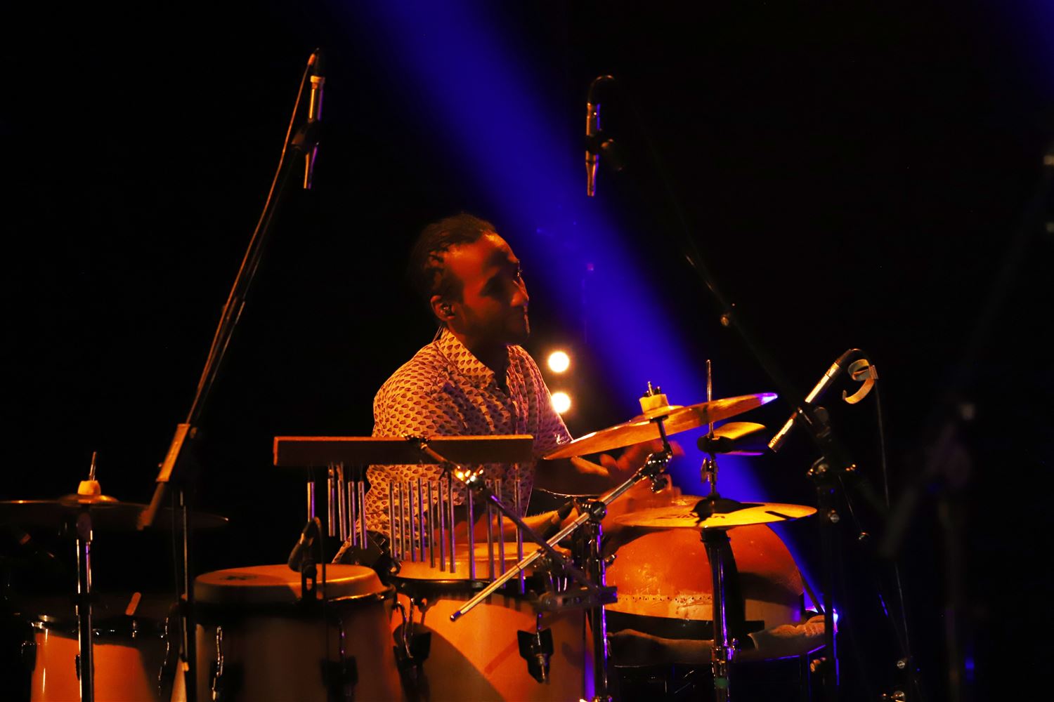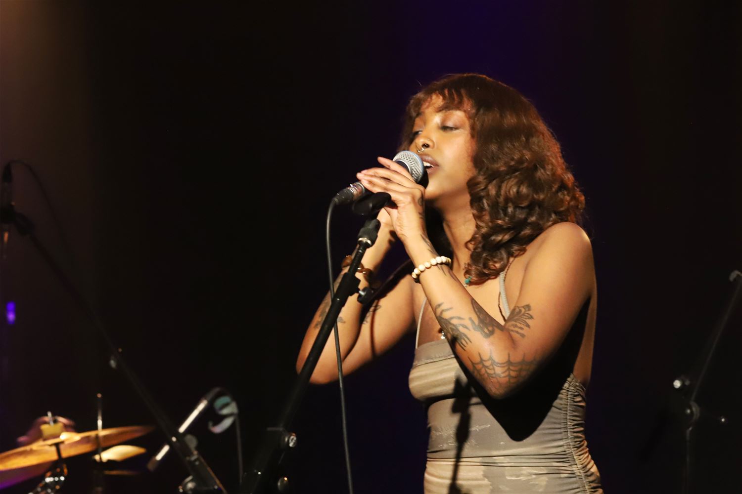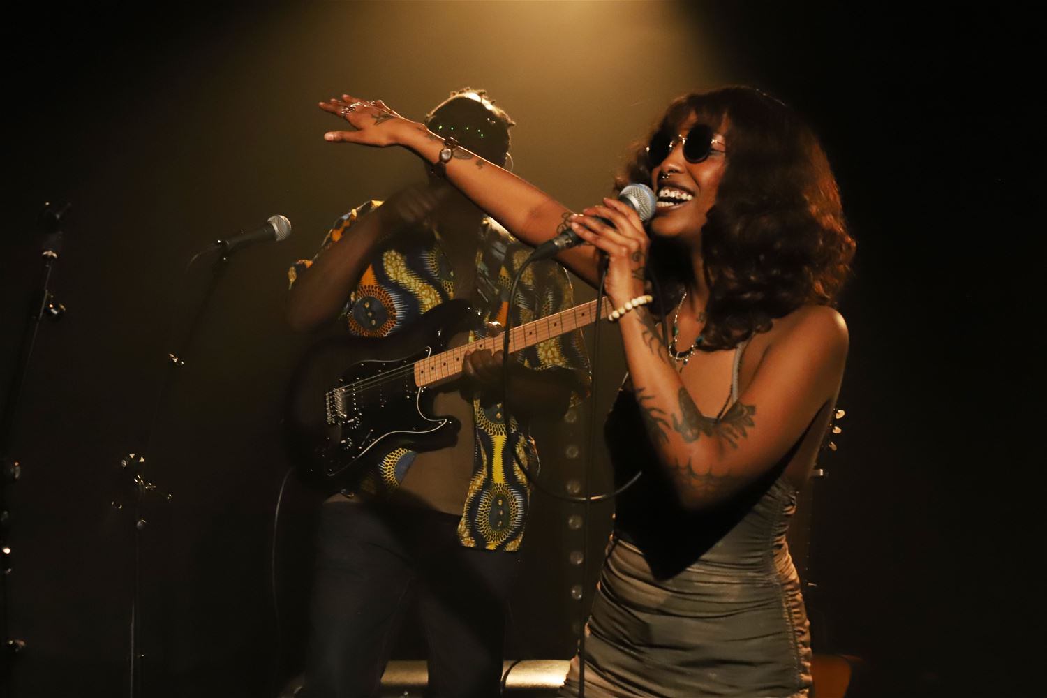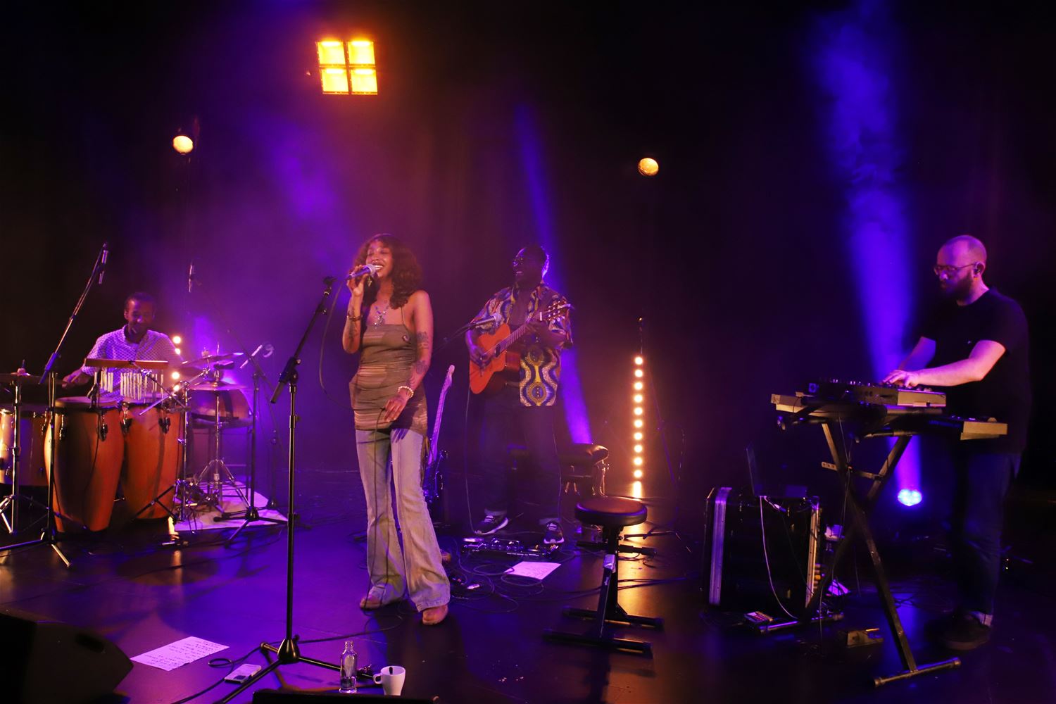 IKRAAAN bracht zaterdagavond in de zwarte zaal van Muze haar nieuwe programma ‘Schemerlicht’. Samen met haar muzikanten serveerde ze een hypnotiserende soul trap en straffe teksten die tot nadenken aansporen. Een fenomeen. (foto’s Herman Eerdekens)84410