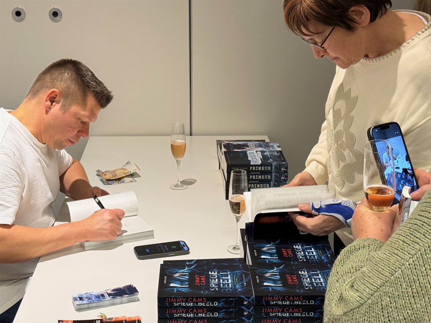 Heel wat belangstelling vanavond voor de boekvoorstelling van Jimmy Cams. ‘Spiegelbeeld’ is ondertussen al zijn vierde thriller en Jimmy begint met zijn spannende boeken een vast lezerspubliek op te bouwen. Ook in deze psychologische thriller houdt hij de spanning erin tot op het laatst, de dreiging hangt voortdurend boven het verhaal en heel wat geheimen worden moeizaam onthuld, … Na de voorstelling moest de auteur tal van boeken signeren, hopelijk durven de lezers achteraf nog naar hun eigen spiegelbeeld kijken. (foto’s Julien Maebe)87878