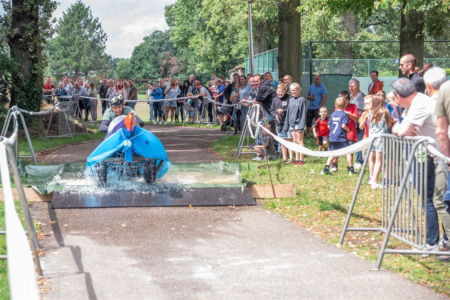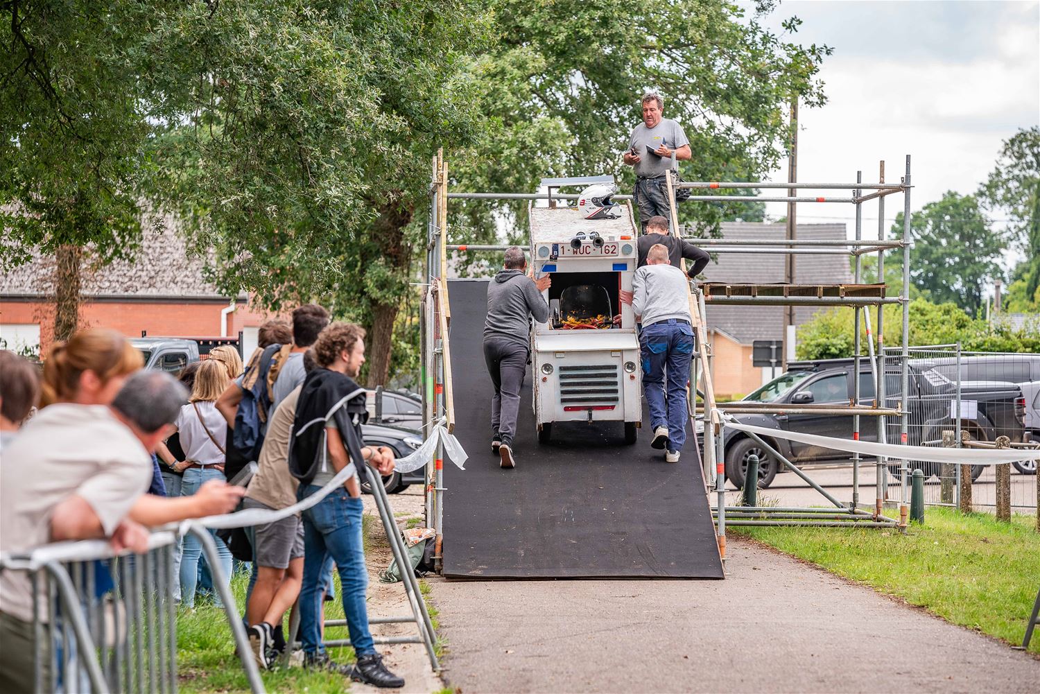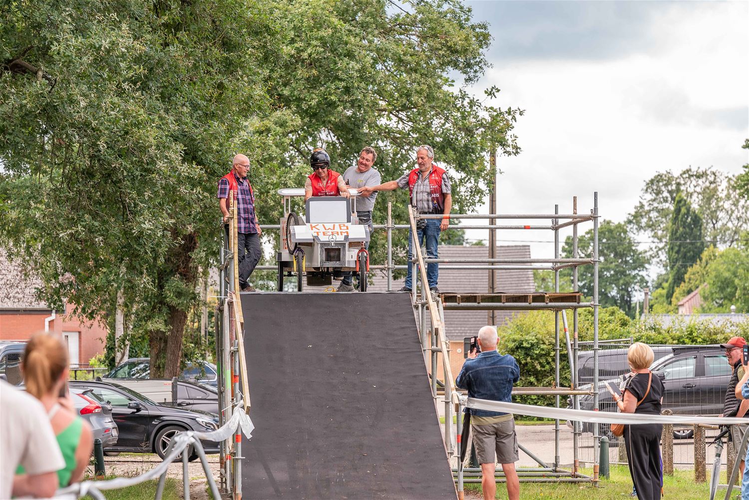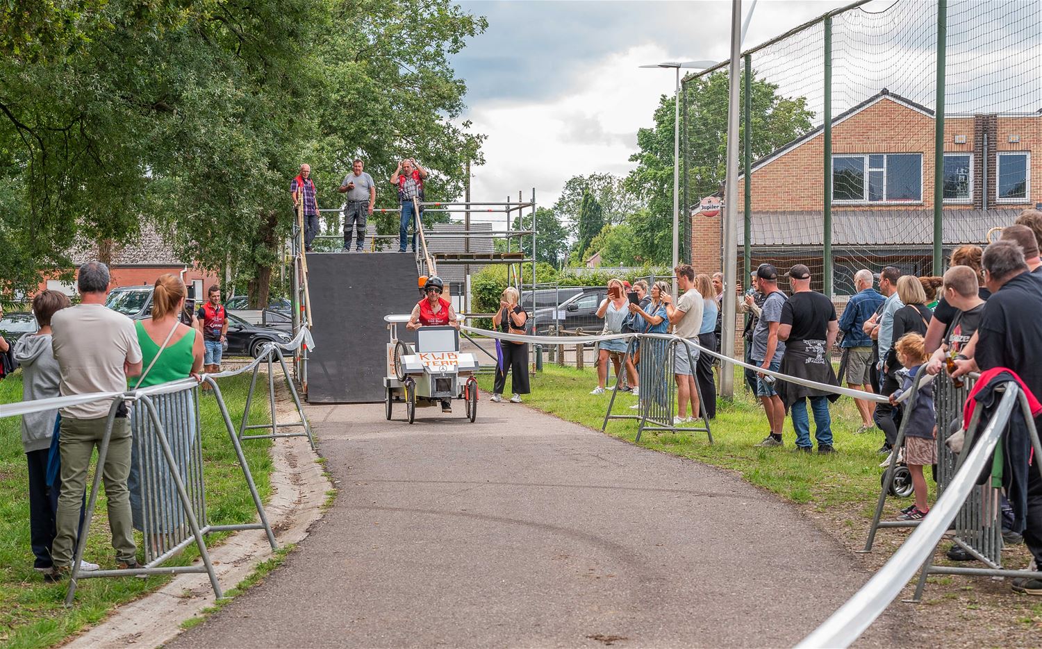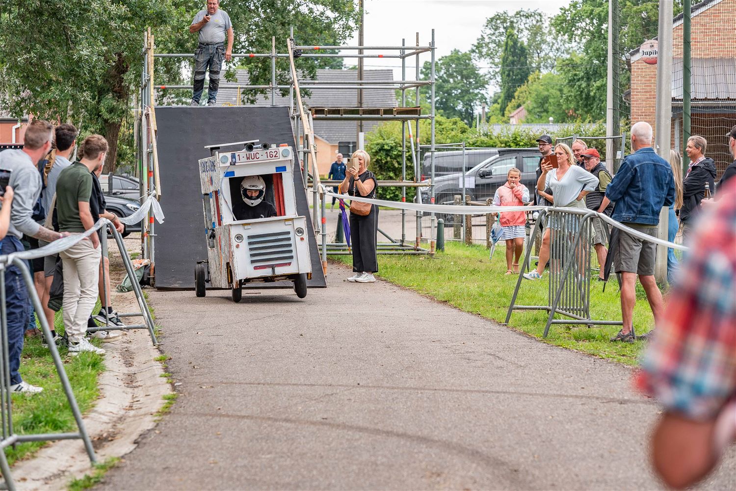 De parochiefeesten in Eversel mogen dan niet op schitterend weer rekenen, er was vandaag wel veel volk. En die toeschouwers kwamen vooral voor de eerste zeepkistenrace. Er waren weliswaar maar vijf deelnemers, maar die zorgden voor een ludiek spektakel waar iedereen veel plezier aan beleefde. Aan de jeugdlokalen was een 'ramp' gemaakt waar de zeepkisten een vliegende start namen, onderweg vormde een waterbak dan nog een hindernis. Elke team mocht drie pogingen ondernemen, maar voor heel wat toeschouwers had het nog wat langer mogen duren. Misschien beginnen anderen volgende week al te bouwen voor volgend jaar. (foto's Ann Jordens)78173