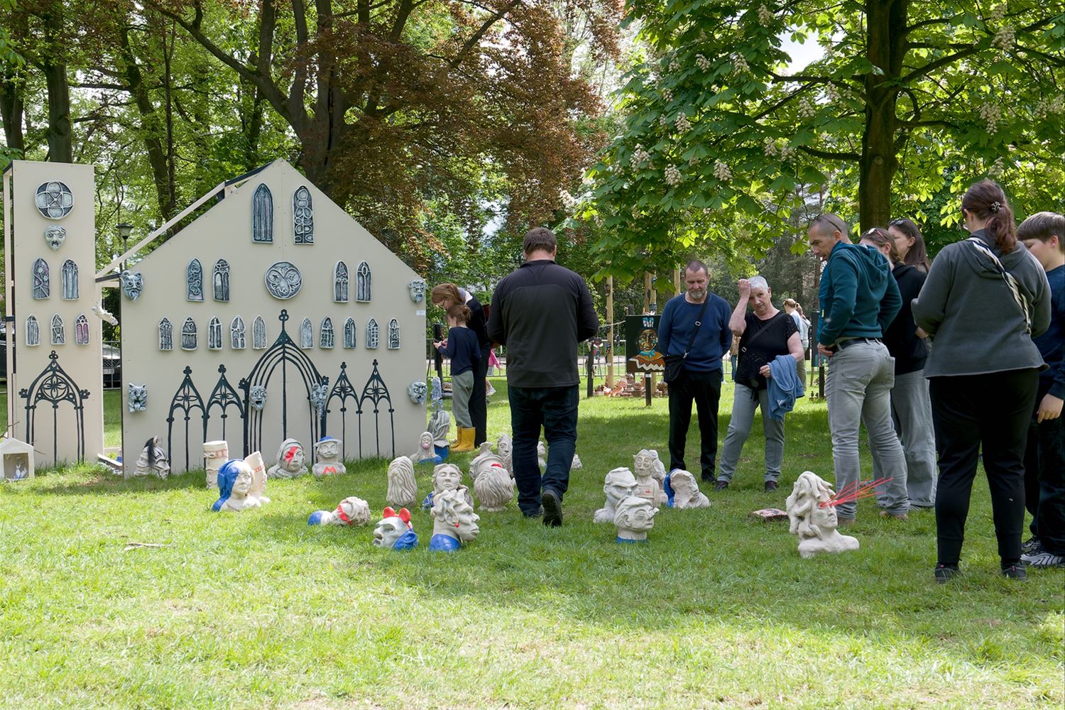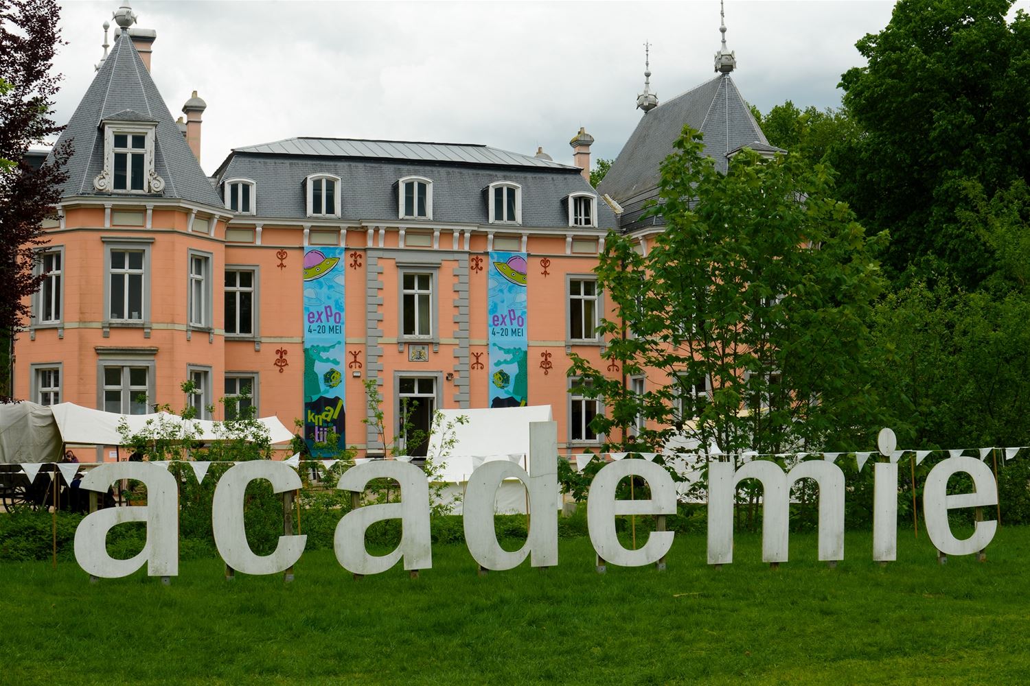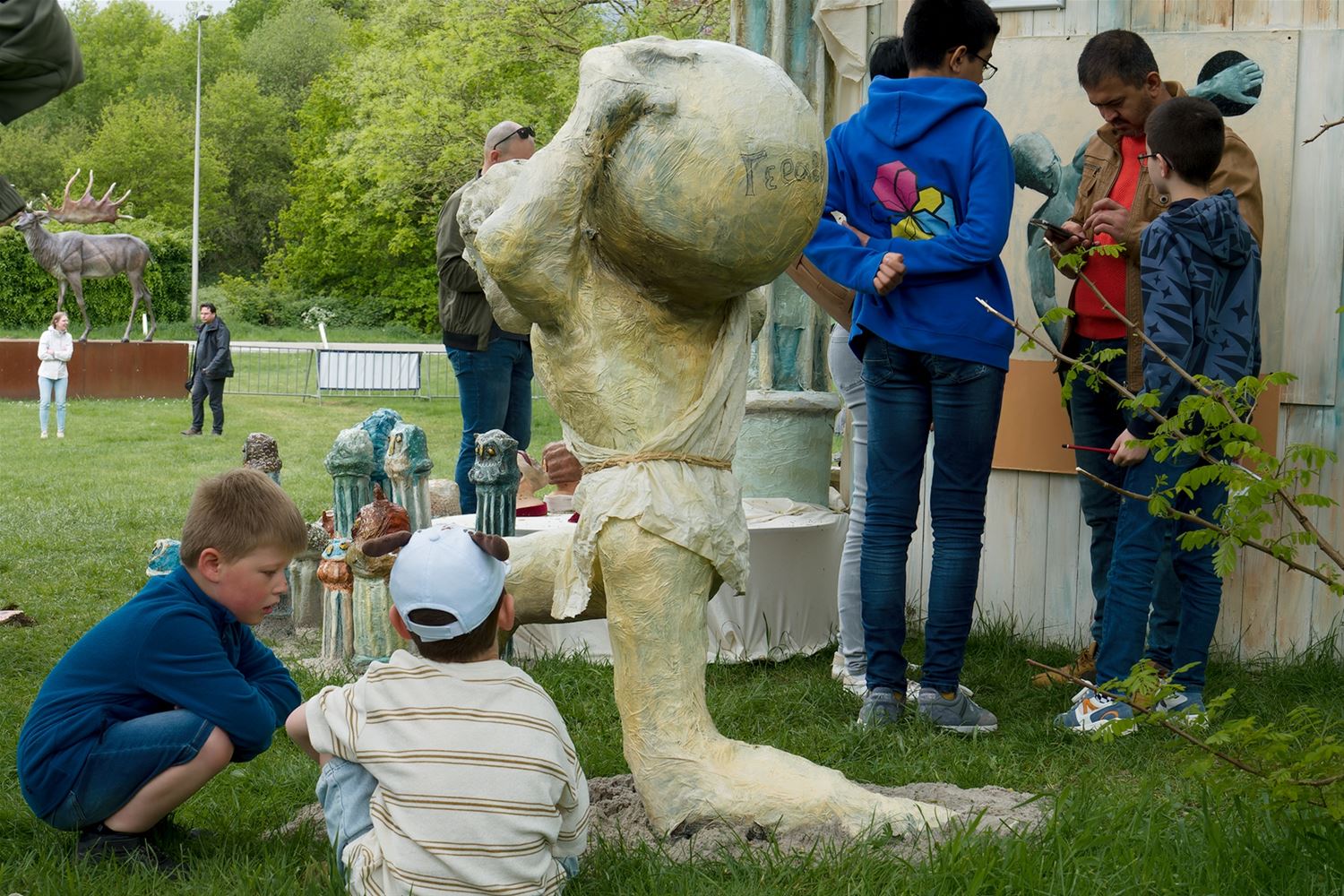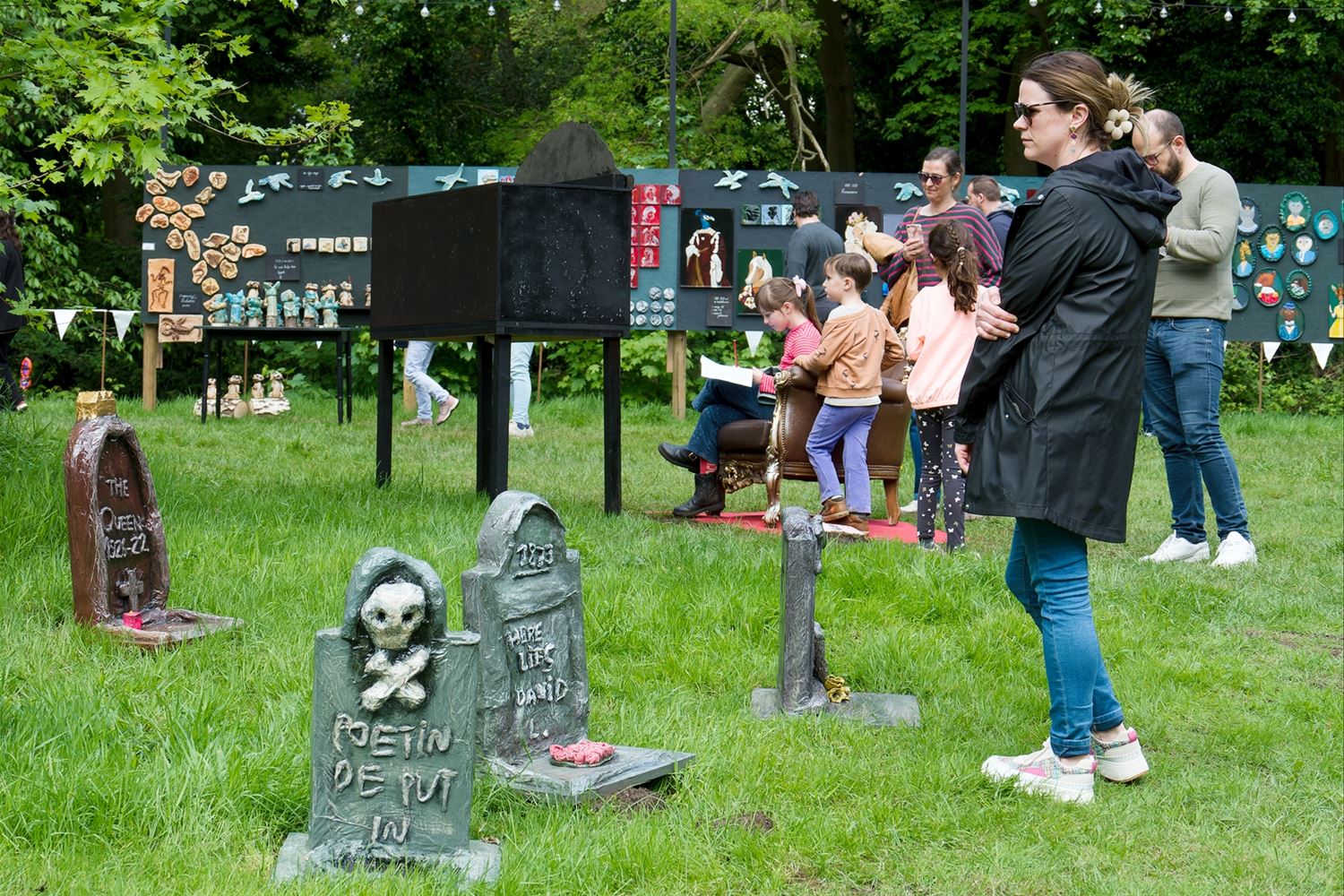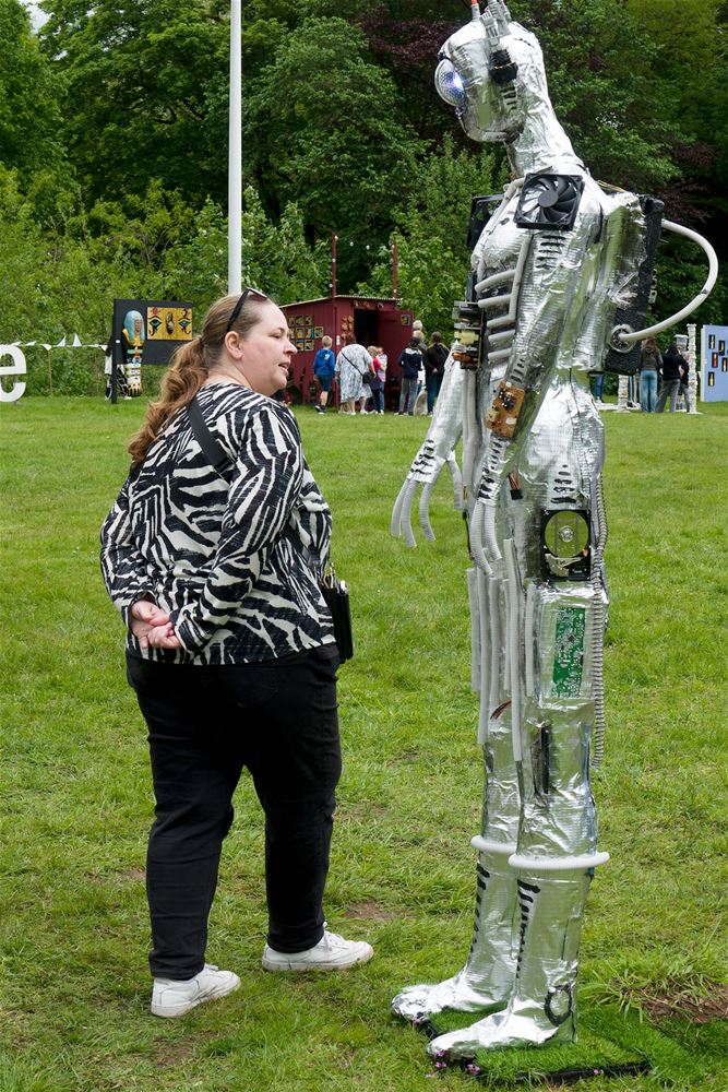 De weergoden waren in een artistieke bui vandaag want ondanks de mindere voorspellingen zijn de paraplu's het grootste deel van de dag overbodig geweest aan kasteel Meylandt. Er was dan ook veel belangstelling voor 'Knal in de Tijd' het kunstenfestival van de academie, waarin de jongste kunstenaars van alle afdelingen hun kunnen tonen. Ze gingen ver en minder ver terug in de tijd, van de tijd van de dino's tot nostalgische taferelen uit de jaren zestig. Zowaar een kerkhof van overleden artiesten waartussen ook Poetin wishfull-thinking-gewijs begraven lag. Het gaat om kleine kunstwerkjes, maar ook grote constructies zoals een fontein die langs alle zijden spuit. Er was op het terrein ook ludieke animatie, en muzikale optredens in de tent aan de achterzijde waar ook honger en dorst werden gestild. Morgen is er nog een eventdag met animatie, daarna kan de expo nog bezocht worden tot 20 mei. Een absolute aanrader. (foto's Robrecht Froyman)80845
