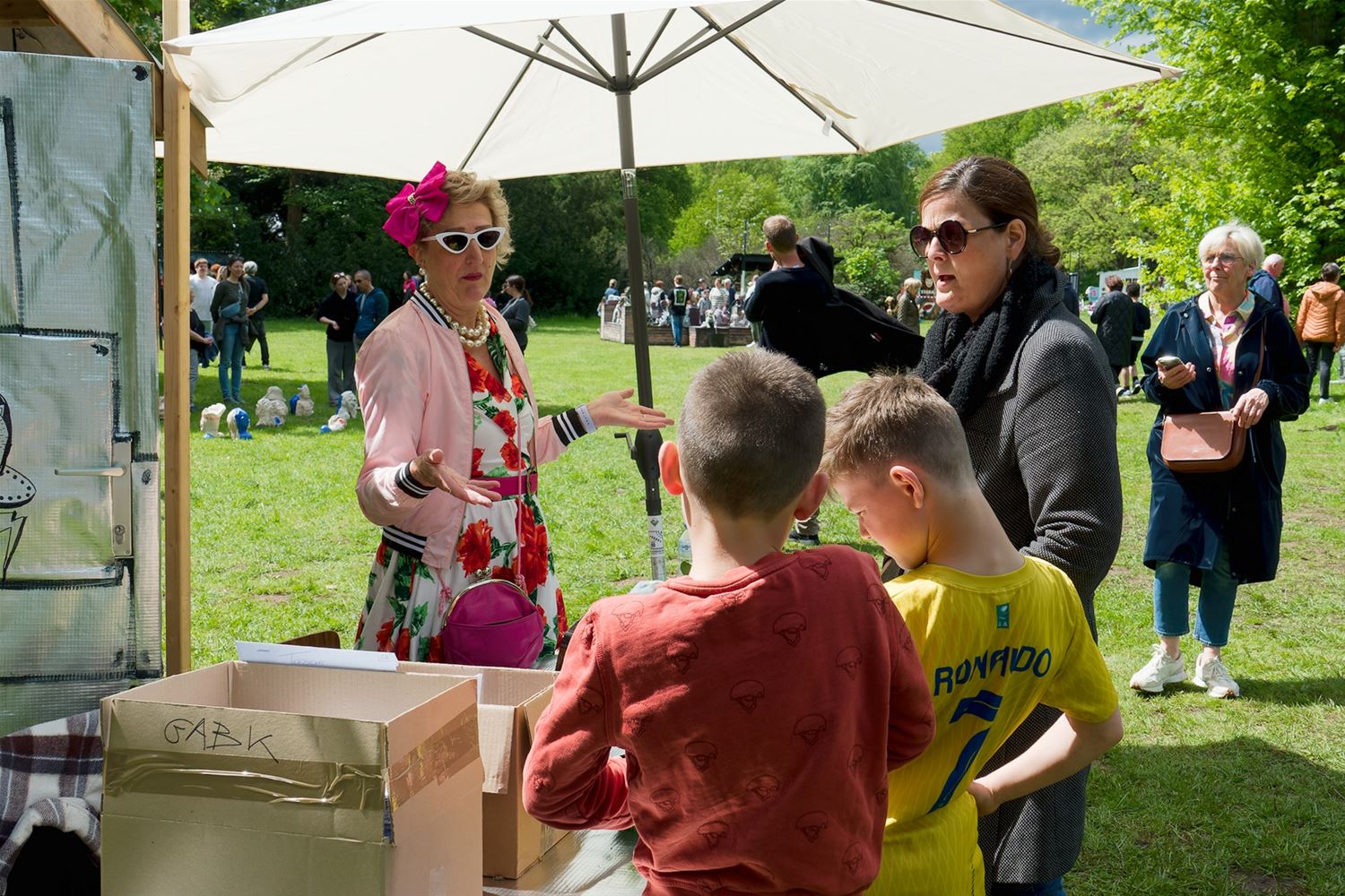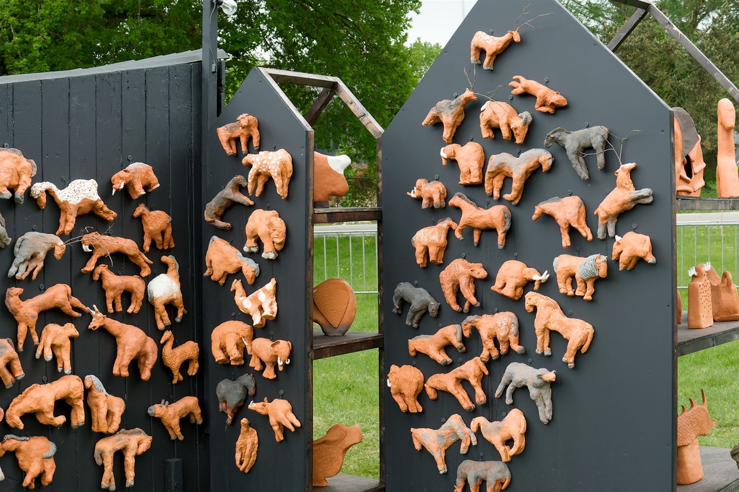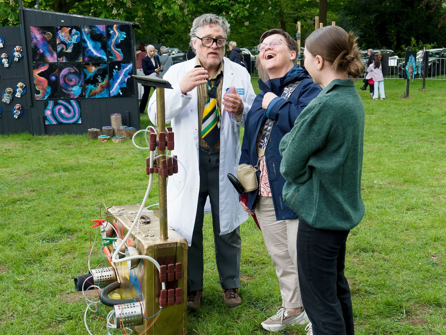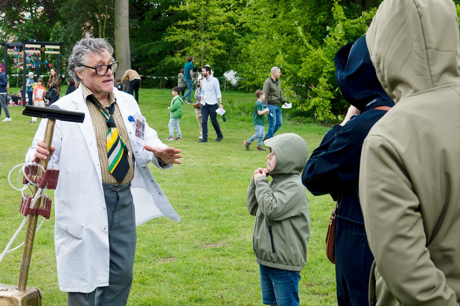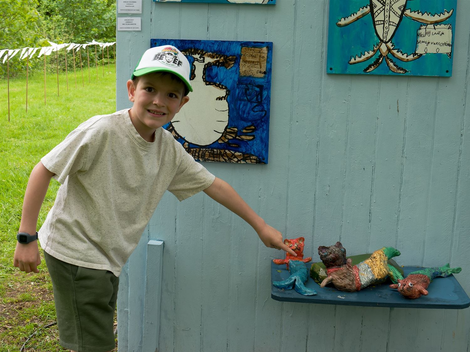 De weergoden waren in een artistieke bui vandaag want ondanks de mindere voorspellingen zijn de paraplu's het grootste deel van de dag overbodig geweest aan kasteel Meylandt. Er was dan ook veel belangstelling voor 'Knal in de Tijd' het kunstenfestival van de academie, waarin de jongste kunstenaars van alle afdelingen hun kunnen tonen. Ze gingen ver en minder ver terug in de tijd, van de tijd van de dino's tot nostalgische taferelen uit de jaren zestig. Zowaar een kerkhof van overleden artiesten waartussen ook Poetin wishfull-thinking-gewijs begraven lag. Het gaat om kleine kunstwerkjes, maar ook grote constructies zoals een fontein die langs alle zijden spuit. Er was op het terrein ook ludieke animatie, en muzikale optredens in de tent aan de achterzijde waar ook honger en dorst werden gestild. Morgen is er nog een eventdag met animatie, daarna kan de expo nog bezocht worden tot 20 mei. Een absolute aanrader. (foto's Robrecht Froyman)80845