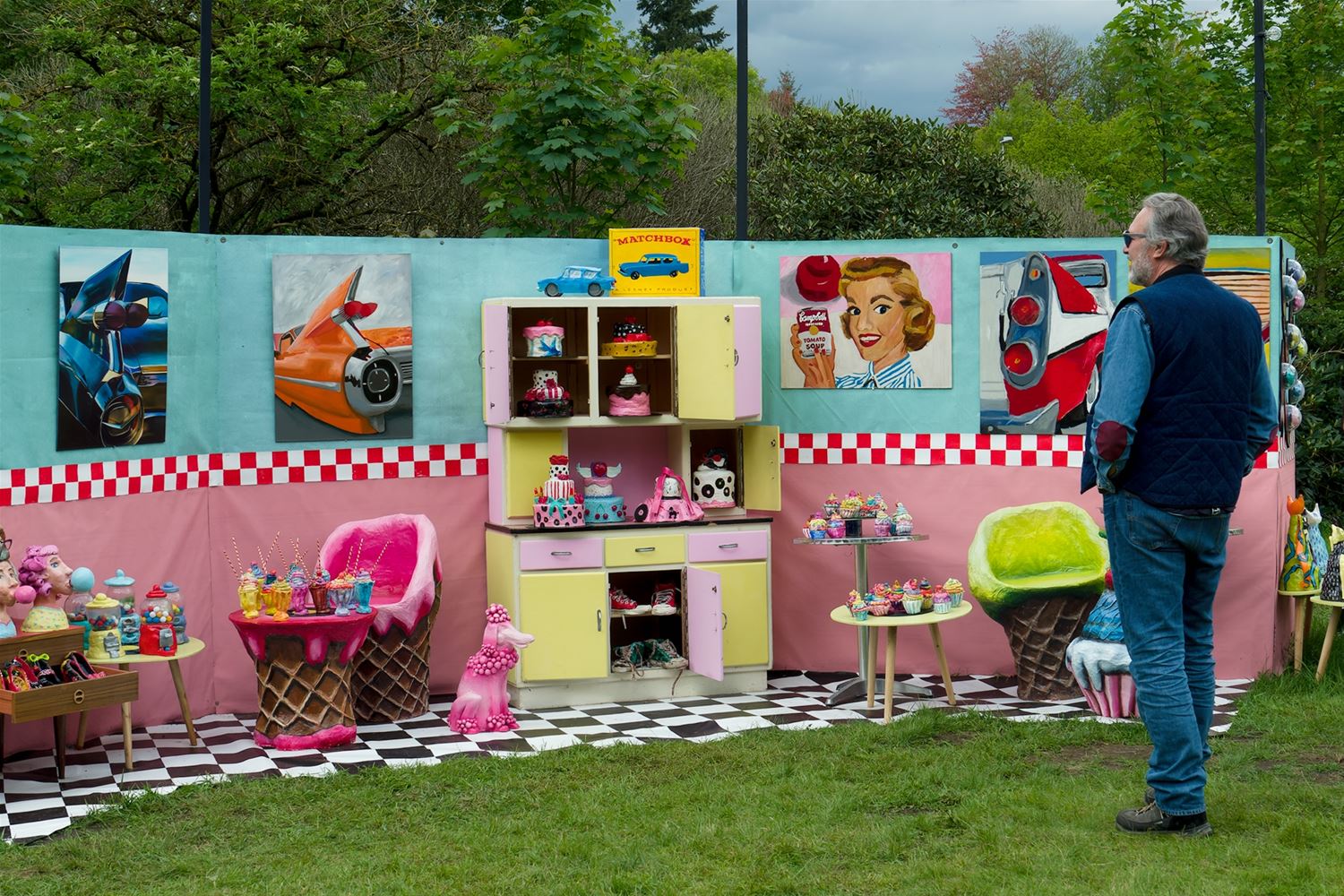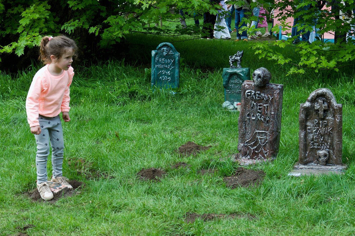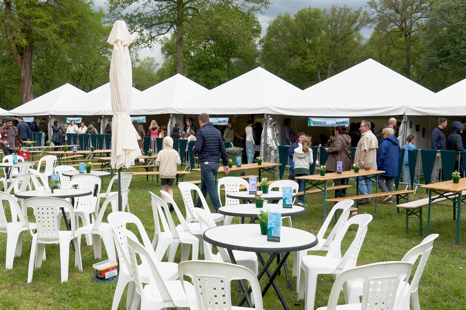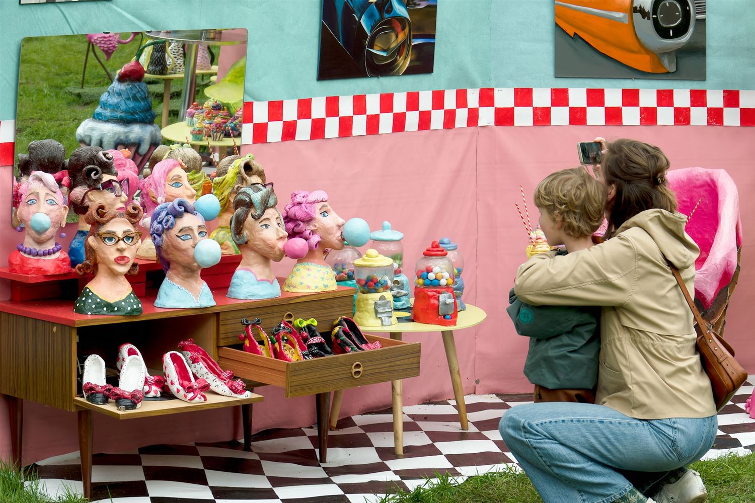De weergoden waren in een artistieke bui vandaag want ondanks de mindere voorspellingen zijn de paraplu's het grootste deel van de dag overbodig geweest aan kasteel Meylandt. Er was dan ook veel belangstelling voor 'Knal in de Tijd' het kunstenfestival van de academie, waarin de jongste kunstenaars van alle afdelingen hun kunnen tonen. Ze gingen ver en minder ver terug in de tijd, van de tijd van de dino's tot nostalgische taferelen uit de jaren zestig. Zowaar een kerkhof van overleden artiesten waartussen ook Poetin wishfull-thinking-gewijs begraven lag. Het gaat om kleine kunstwerkjes, maar ook grote constructies zoals een fontein die langs alle zijden spuit. Er was op het terrein ook ludieke animatie, en muzikale optredens in de tent aan de achterzijde waar ook honger en dorst werden gestild. Morgen is er nog een eventdag met animatie, daarna kan de expo nog bezocht worden tot 20 mei. Een absolute aanrader. (foto's Robrecht Froyman)80845