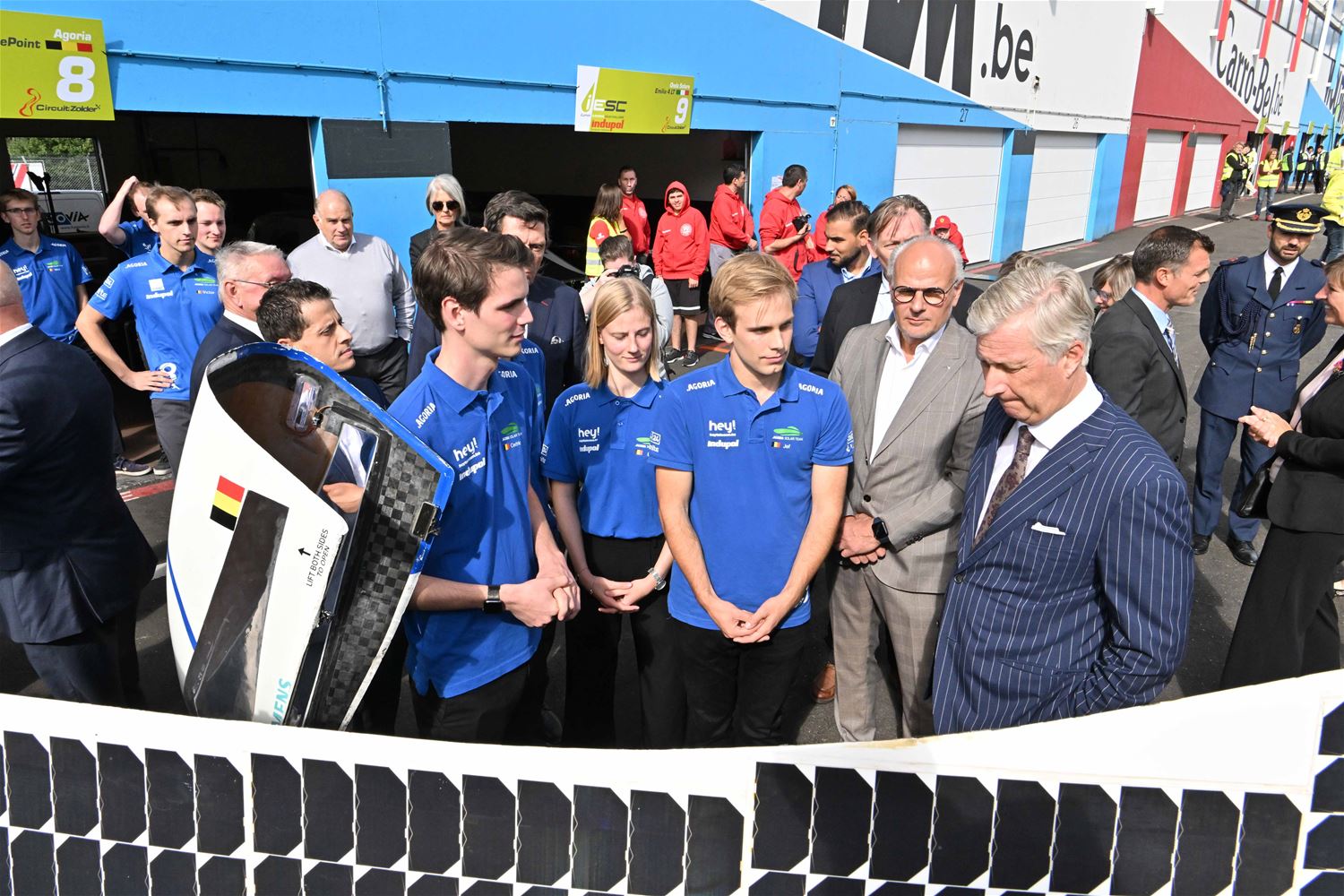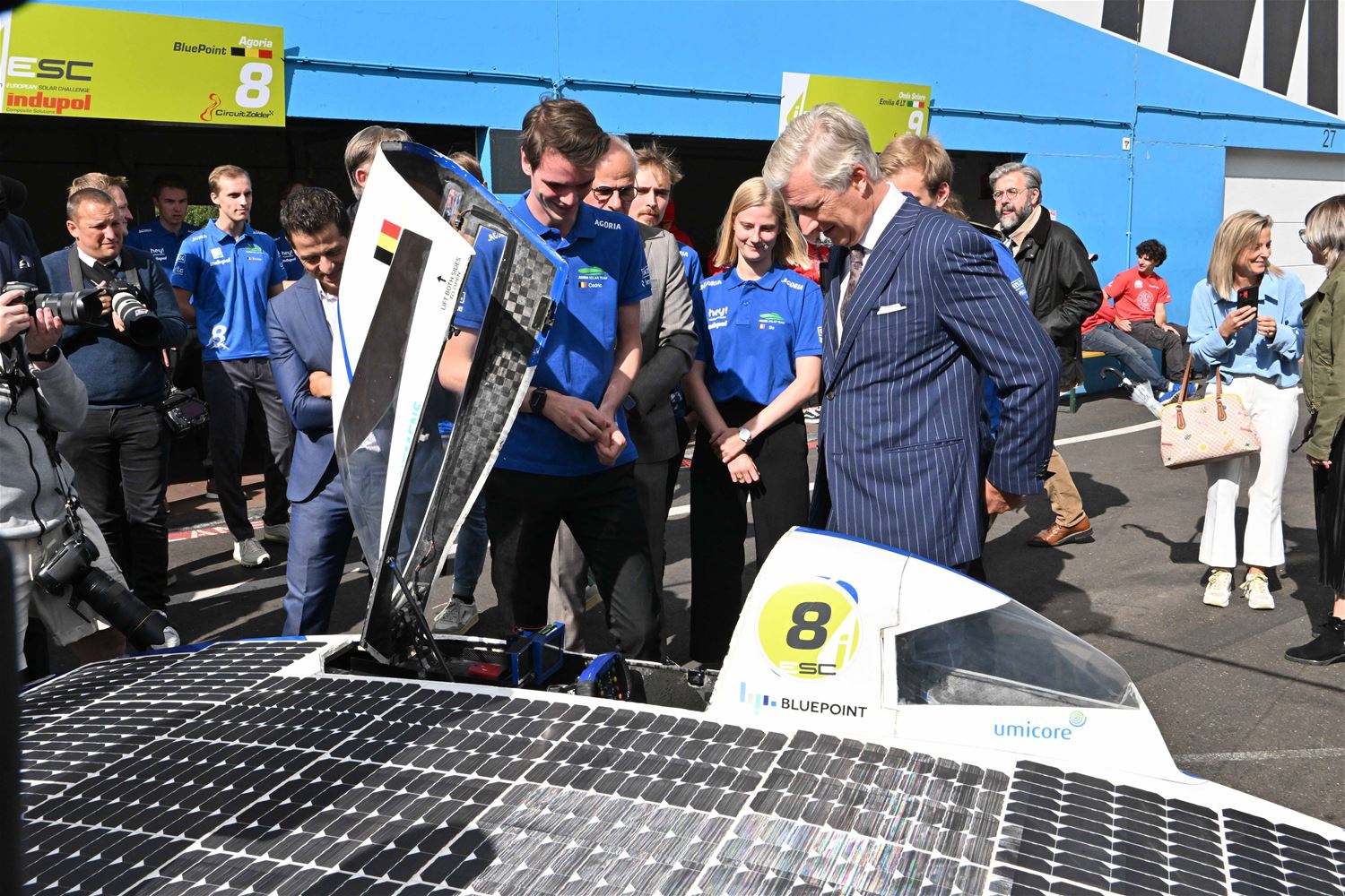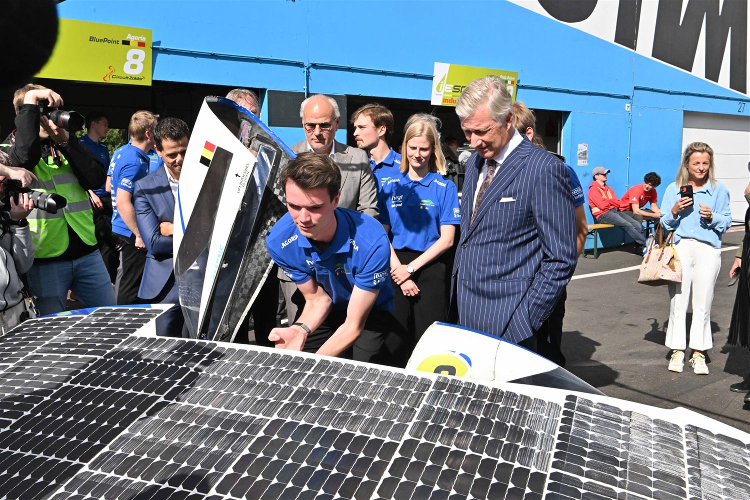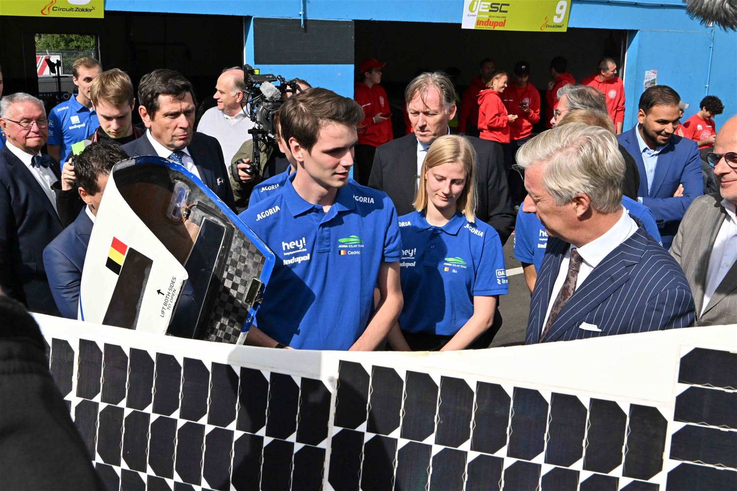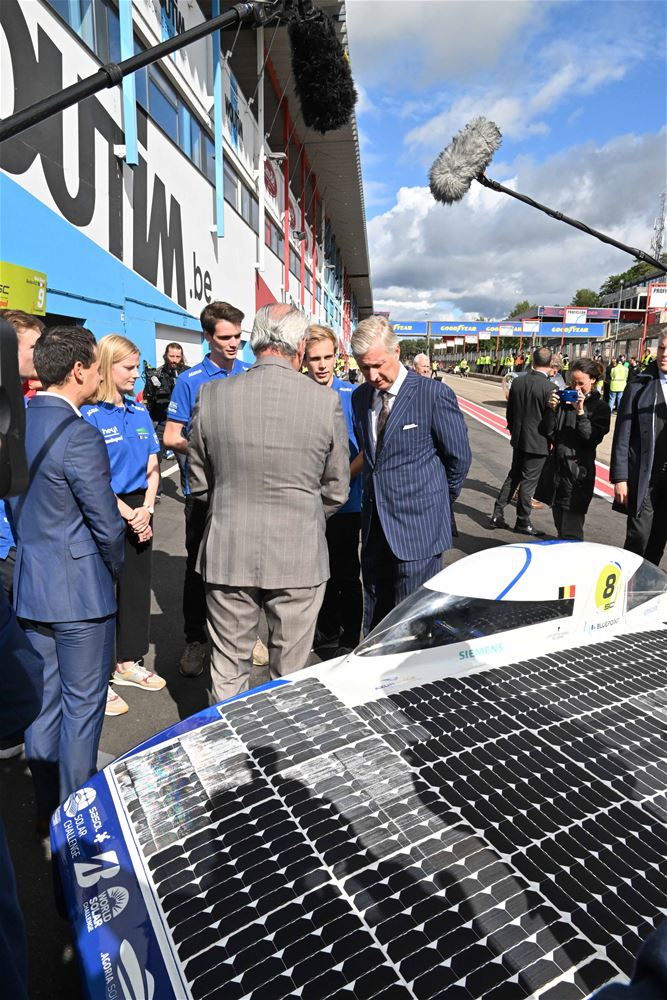 Koning Filip heeft deze namiddag zoals aangekondigd de deelnemers aan de iLumen European Solar Challenge bezocht. Morgen om 13 uur vertrekt een 20-tal zonnewagens voor de 24 uursrace. De koning werd toegejuicht door kinderen van onder meer de basisscholen Boekt en Viversel, hij ging hen ook even groeten, wat uiteraard zeer gesmaakt werd door de enthousiaste kinderen. De koning liet zich door de organisatoren van de race en verantwoordelijken van Circuit Zolder informeren over het hele gebeuren met de zonnenwagens. Hij was vooral geïnteresseerd hoe alles functioneerde en vooral hoe dit soort experimenten op termijn ook tot bredere toepassingen in het dagelijkse leven kunnen leiden. De koning ging op de foto met het Belgische Agoria-team met de Bluepoint en hij stapte in de Nederlandse bolide om een proefrondje te maken. Hij was erg onder de indruk van de mogelijkheden die de zonnewagens bieden. (foto's Hans Put)75225