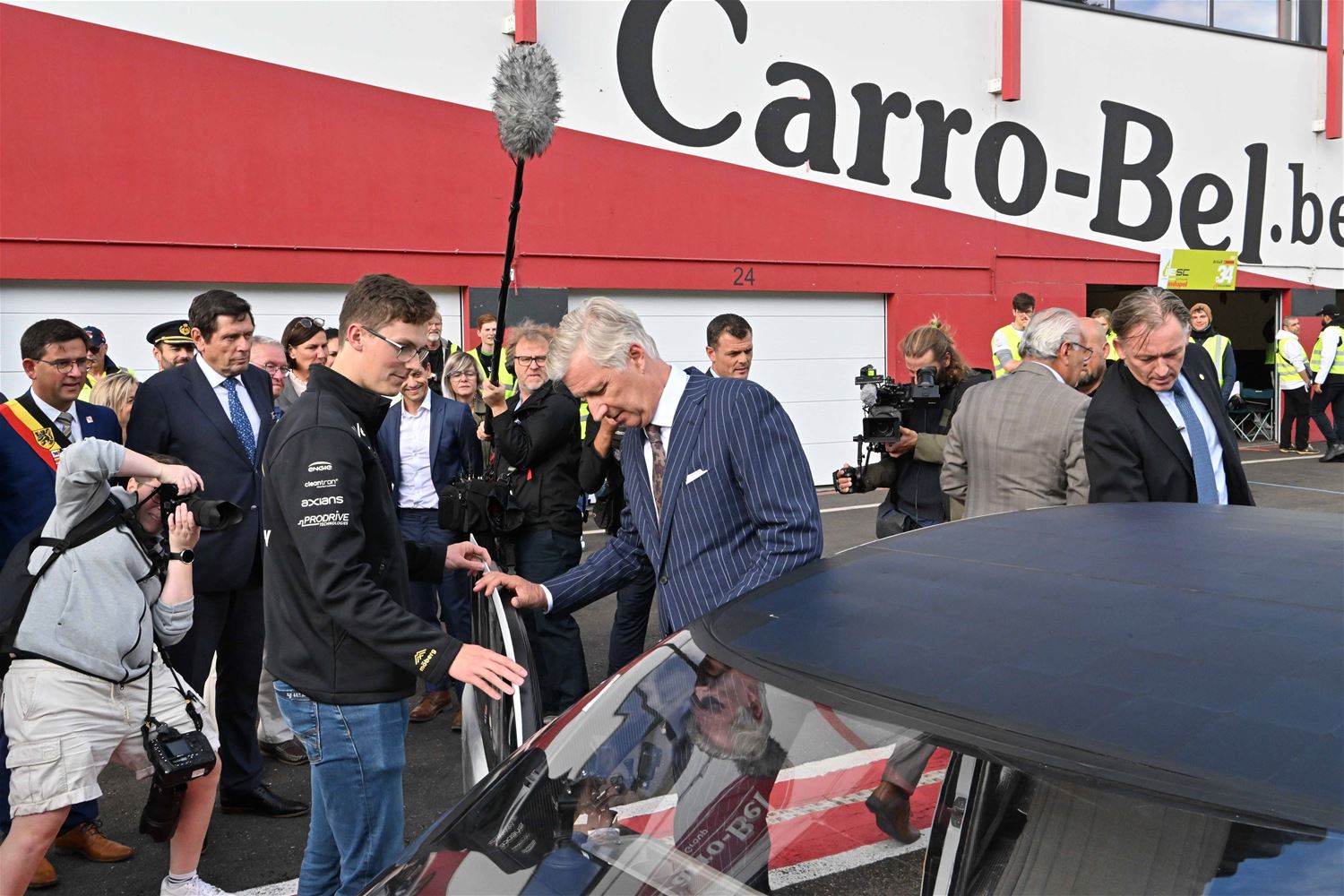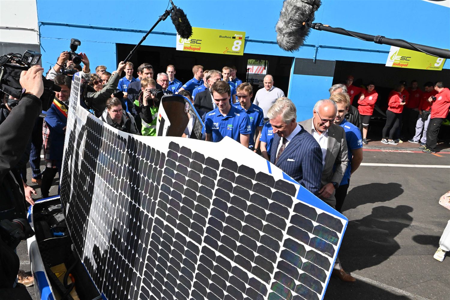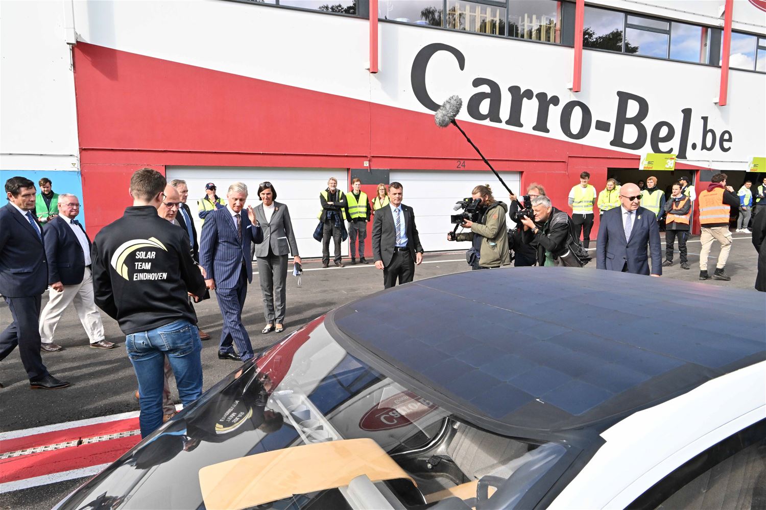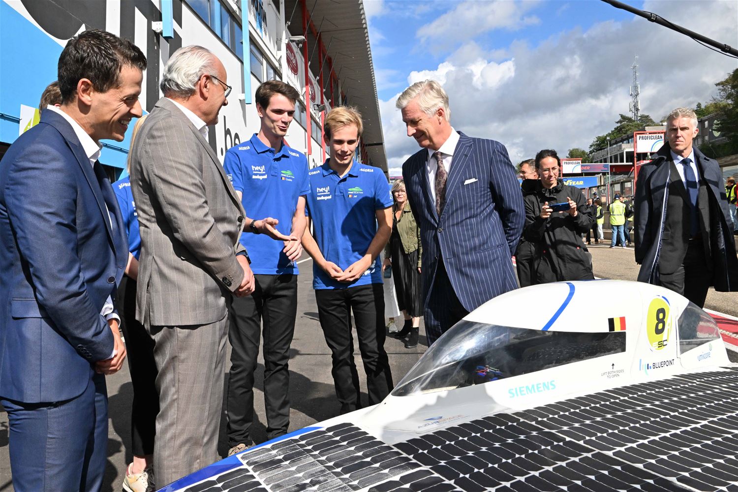 Koning Filip heeft deze namiddag zoals aangekondigd de deelnemers aan de iLumen European Solar Challenge bezocht. Morgen om 13 uur vertrekt een 20-tal zonnewagens voor de 24 uursrace. De koning werd toegejuicht door kinderen van onder meer de basisscholen Boekt en Viversel, hij ging hen ook even groeten, wat uiteraard zeer gesmaakt werd door de enthousiaste kinderen. De koning liet zich door de organisatoren van de race en verantwoordelijken van Circuit Zolder informeren over het hele gebeuren met de zonnenwagens. Hij was vooral geïnteresseerd hoe alles functioneerde en vooral hoe dit soort experimenten op termijn ook tot bredere toepassingen in het dagelijkse leven kunnen leiden. De koning ging op de foto met het Belgische Agoria-team met de Bluepoint en hij stapte in de Nederlandse bolide om een proefrondje te maken. Hij was erg onder de indruk van de mogelijkheden die de zonnewagens bieden. (foto's Hans Put)75225