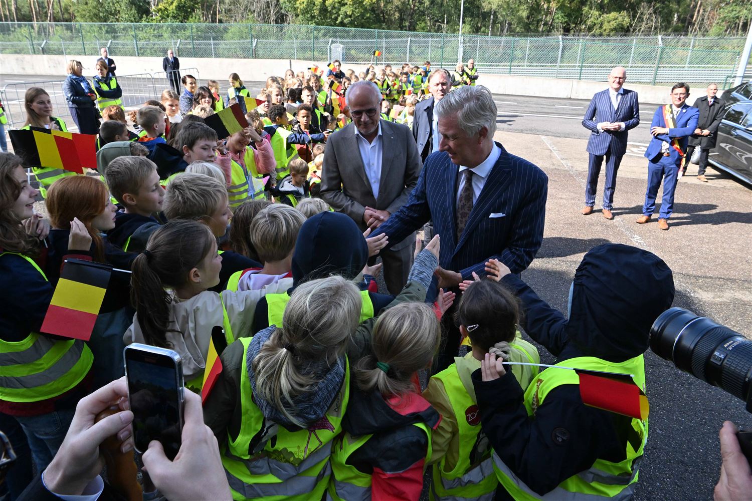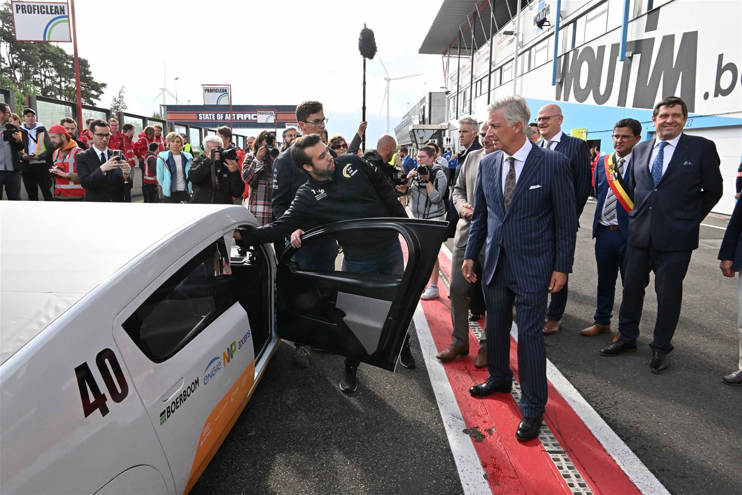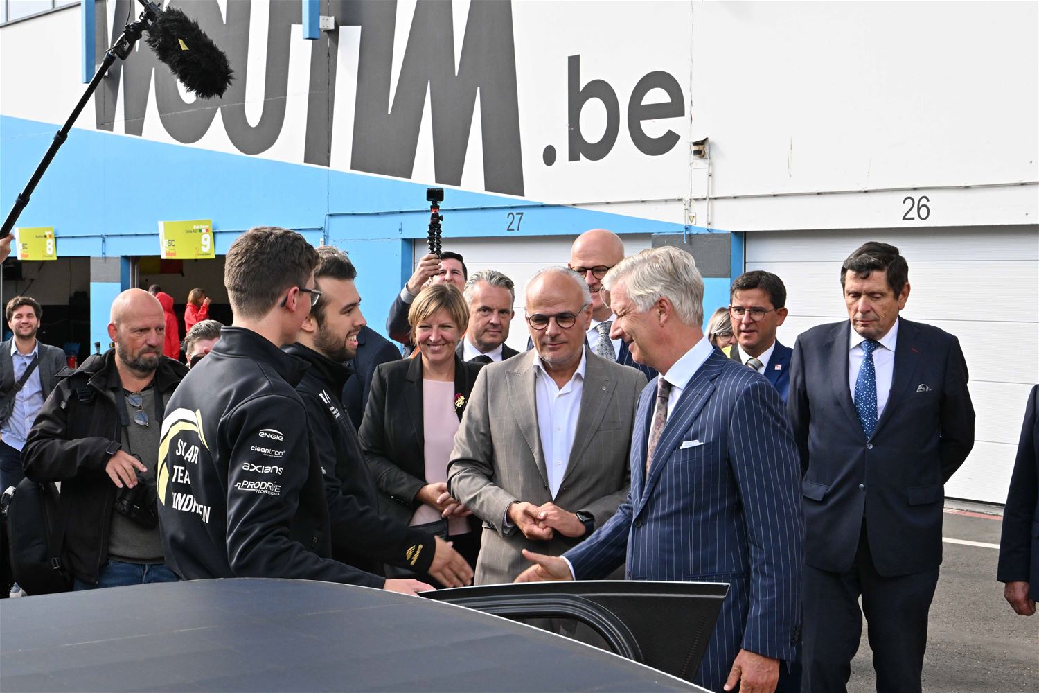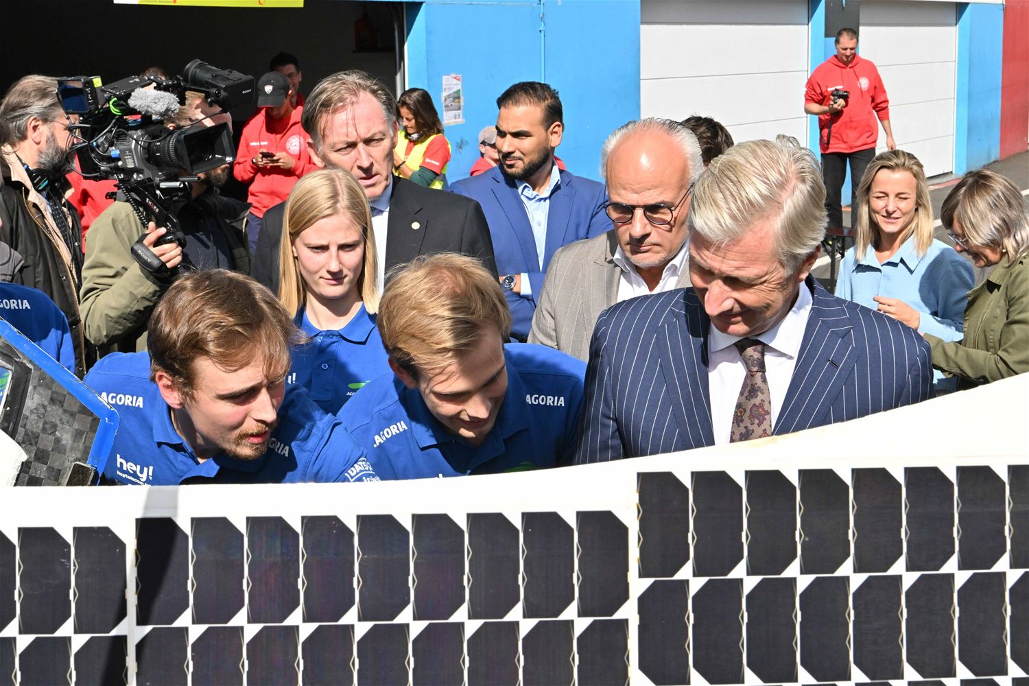 Koning Filip heeft deze namiddag zoals aangekondigd de deelnemers aan de iLumen European Solar Challenge bezocht. Morgen om 13 uur vertrekt een 20-tal zonnewagens voor de 24 uursrace. De koning werd toegejuicht door kinderen van onder meer de basisscholen Boekt en Viversel, hij ging hen ook even groeten, wat uiteraard zeer gesmaakt werd door de enthousiaste kinderen. De koning liet zich door de organisatoren van de race en verantwoordelijken van Circuit Zolder informeren over het hele gebeuren met de zonnenwagens. Hij was vooral geïnteresseerd hoe alles functioneerde en vooral hoe dit soort experimenten op termijn ook tot bredere toepassingen in het dagelijkse leven kunnen leiden. De koning ging op de foto met het Belgische Agoria-team met de Bluepoint en hij stapte in de Nederlandse bolide om een proefrondje te maken. Hij was erg onder de indruk van de mogelijkheden die de zonnewagens bieden. (foto's Hans Put)75225