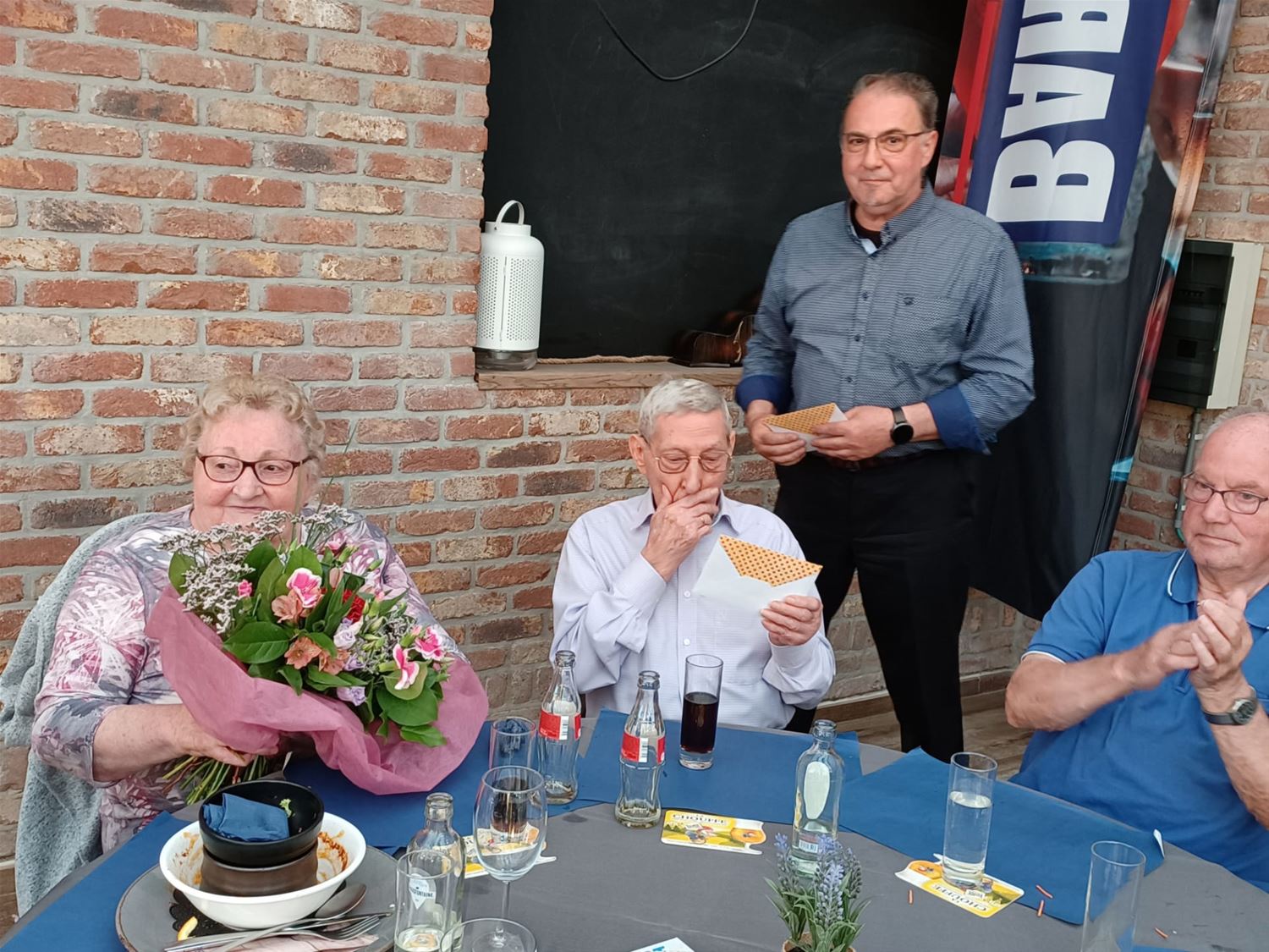KWB Berkenbos hield vrijdagavond een bestuursfeestje. Dat was een gelegeneheid om enkele bestuursleden/wijkmeesters in de bloemetjes te zetten samen met hun partner. Georges en Angele en Tommy en Janina kregen dus een bedankje. Ze zetten een stapje opzij voor de jongere generatie, Paul Claes komt er nu bij als nieuw bestuurslid en wijkmeester, laat Ludo Vanherle weten.73118