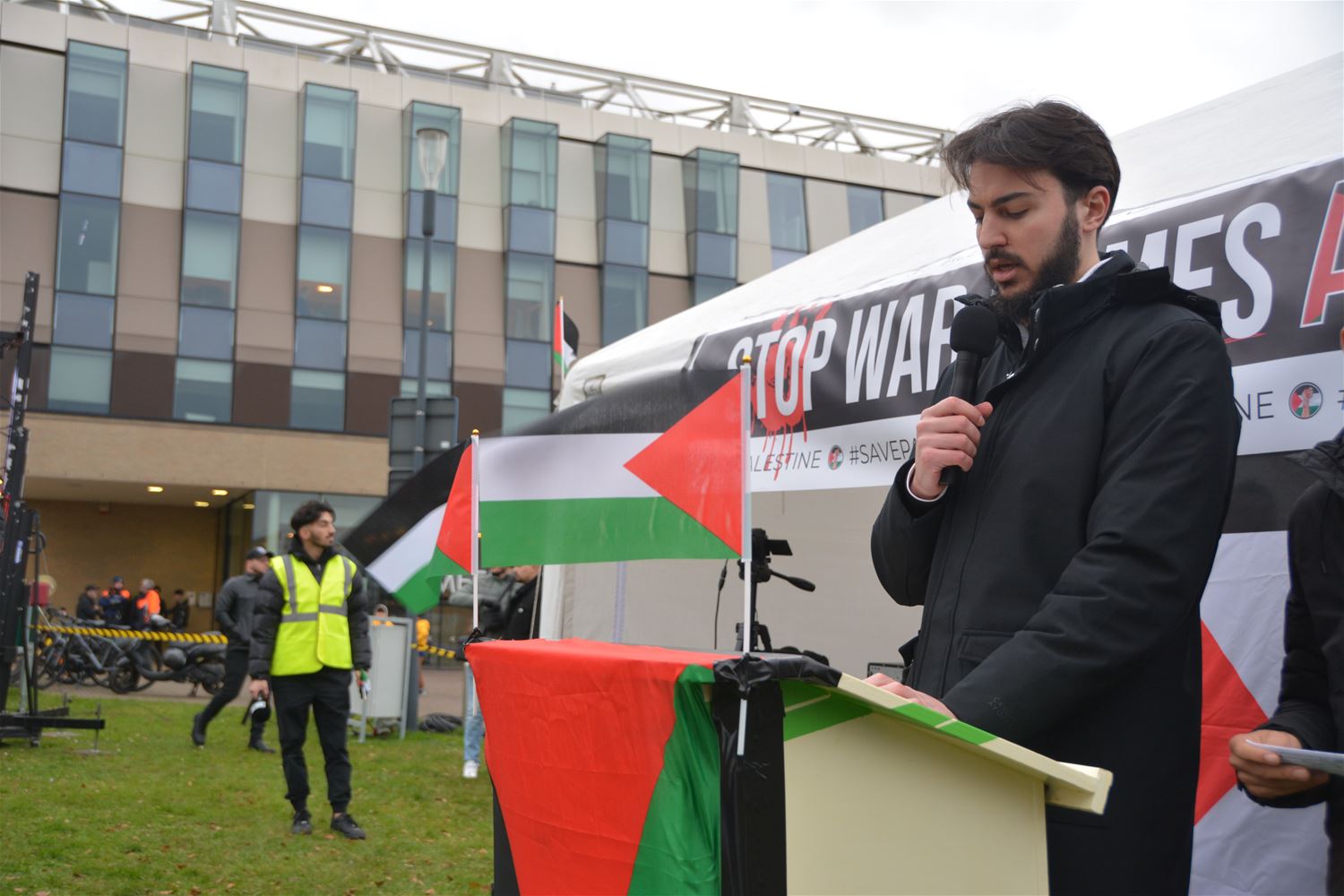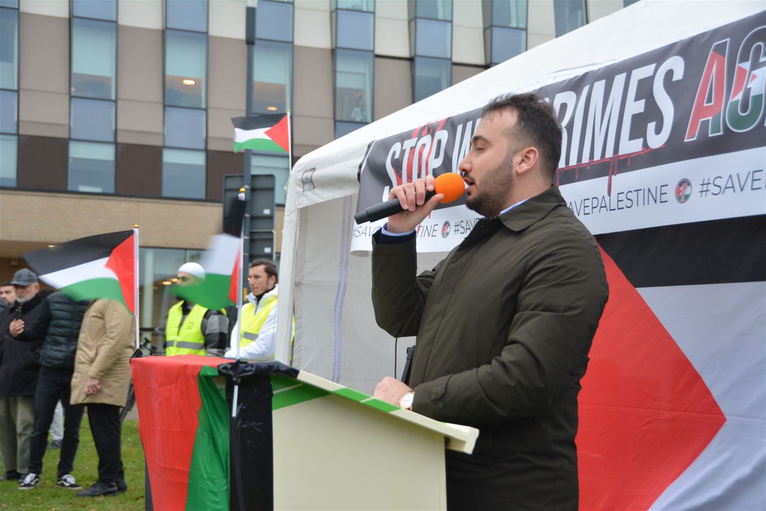 Mensenrechtenadvocate Ayse Elkilic, afkomstig uit Heusden-Zolder, hield een betoog over rechten die moeten dienen om mensen te beschermen en in vrijheid te laten leven. Ze verwees naar de Universele Verklaring van de Rechten van de Mens die na WO II is opgesteld om een herhaling van de genocide te voorkomen, maar telkens kan worden overtreden als het Internationaal Strafhof niet door alle staten wordt erkend. De VS en Israël erkennen het bijvoorbeeld niet. "Als het recht faalt, kan het bloedvergieten niet stoppen, nu al zijn bijna 20.000 mensen omgekomen, vooral vrouwen en kinderen. Maar in de loop van de Palestijnse geschiedenis spreken we over meer dan 100.000 doden", aldus Ayse Elkilic. Daarna bracht een meisje nog een gedicht waaruit haar machteloosheid ten opzichte van de situatie van de kinderen in Gaza bleek. Op de grote schermen kregen de aanwezigen nog een documentaire over Gaza van enkele jaren geleden te zien waaruit moest blijken dat de geschiedenis zich blijft herhalen. 79418