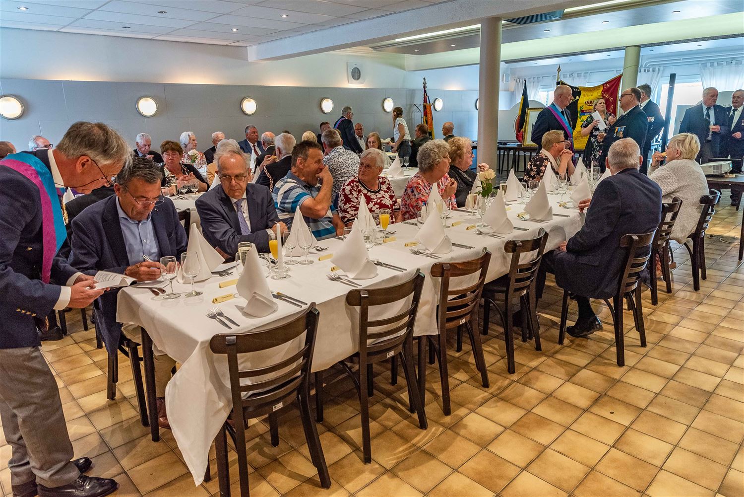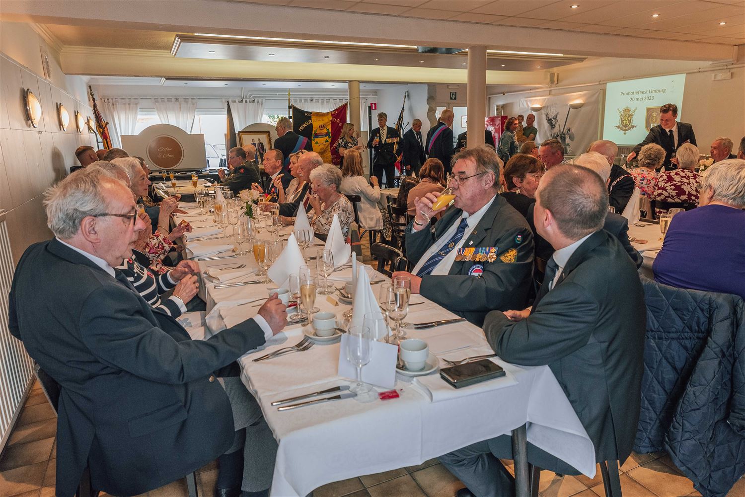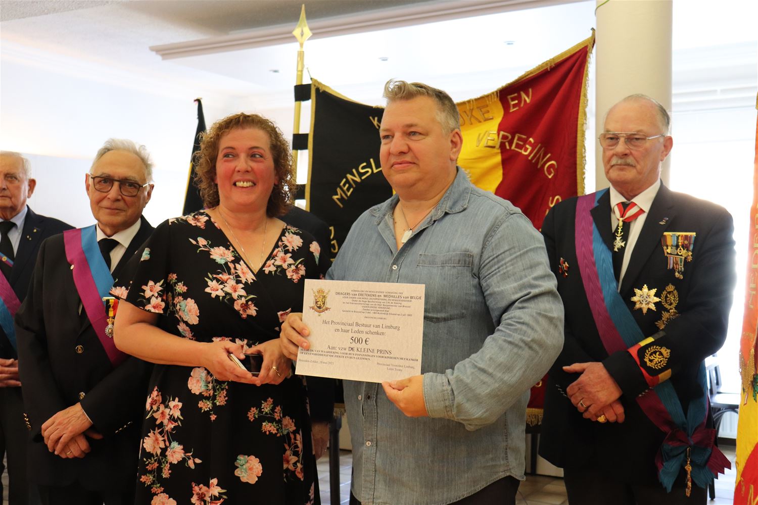 In feestzaal Vogelsanck had vandaag het jaarlijkse promotiefeest van de Koninklijke en Menslievende Vereniging van Dragers van Eretekens en Medailles van België plaats. Dat is nog altijd de oudste vereniging van het koninkrijk België. Er werd een aantal toespraken gehouden en de nieuwe bestuursstructuur voorgesteld met Heusdenaar Tim Francis als nieuwe voorzitter. Traditiegetrouw krijgen verschillende leden een ereteken. Bijzonder was dit jaar dat twee Nederlanders uit Geldrop - Karin en Bert De Jonge - het Ereteken voor Moed en Zelfopoffering kregen omdat ze nog steeds naar Wallonië trekken om de slachtoffers van de watersnood te ondersteunen. Zoals elk jaar werd ook een cheque voor een goed doel overhandigd. Deze keer mocht De Kleine Prins 500 euro in ontvangst nemen. Zoals bekend zet die vereniging zich in voor kinderen die getroffen worden door kanker. De leden van de vereniging en hun gasten praatten nadien nog na tijdens een feestmaal. (foto's Ann Jordens)77566