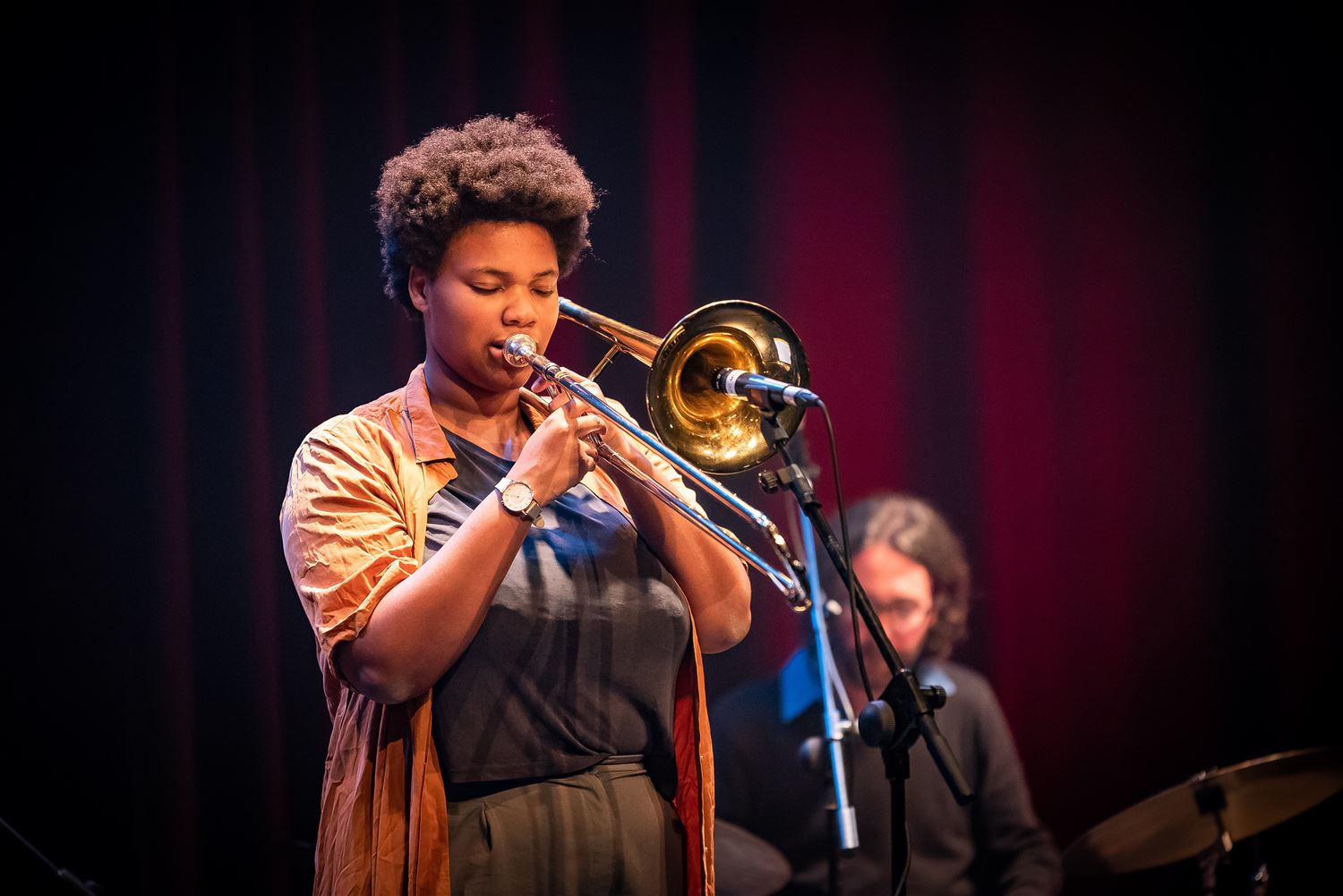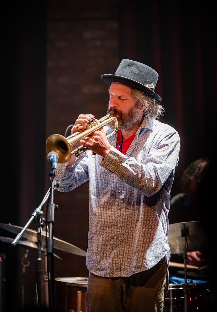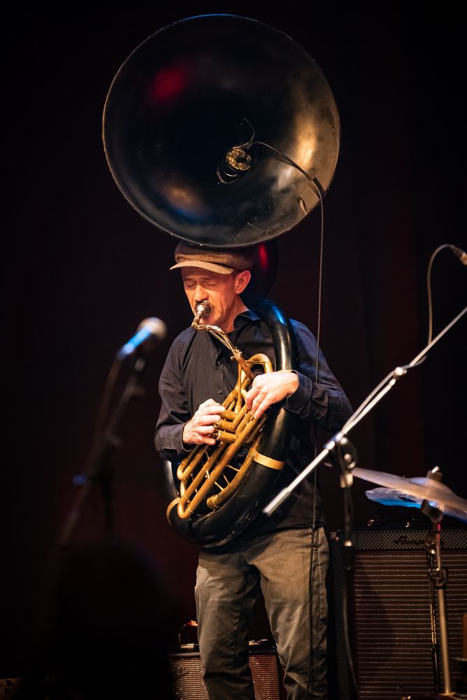 In de zwarte zaal van CC Muze kon je zondagavond van de New Oreans-sfeer proeven. Daarvoor tekende de Free Orleans Rebel Band. Een septet dat zich laat inspireren door de hoogdagen van pioniers als King Oliver, Johnny Dodds en vooral Louis Armstrong. Maar de Free Orlean Rebel band heeft zijn eigen aanpak, het begint meestal met een collectieve improvisatie waaruit de nummers dan geleidelijk structuur krijgen om vervolgens volop de zaal in te blazen. (foto's Ann Jordens)75550