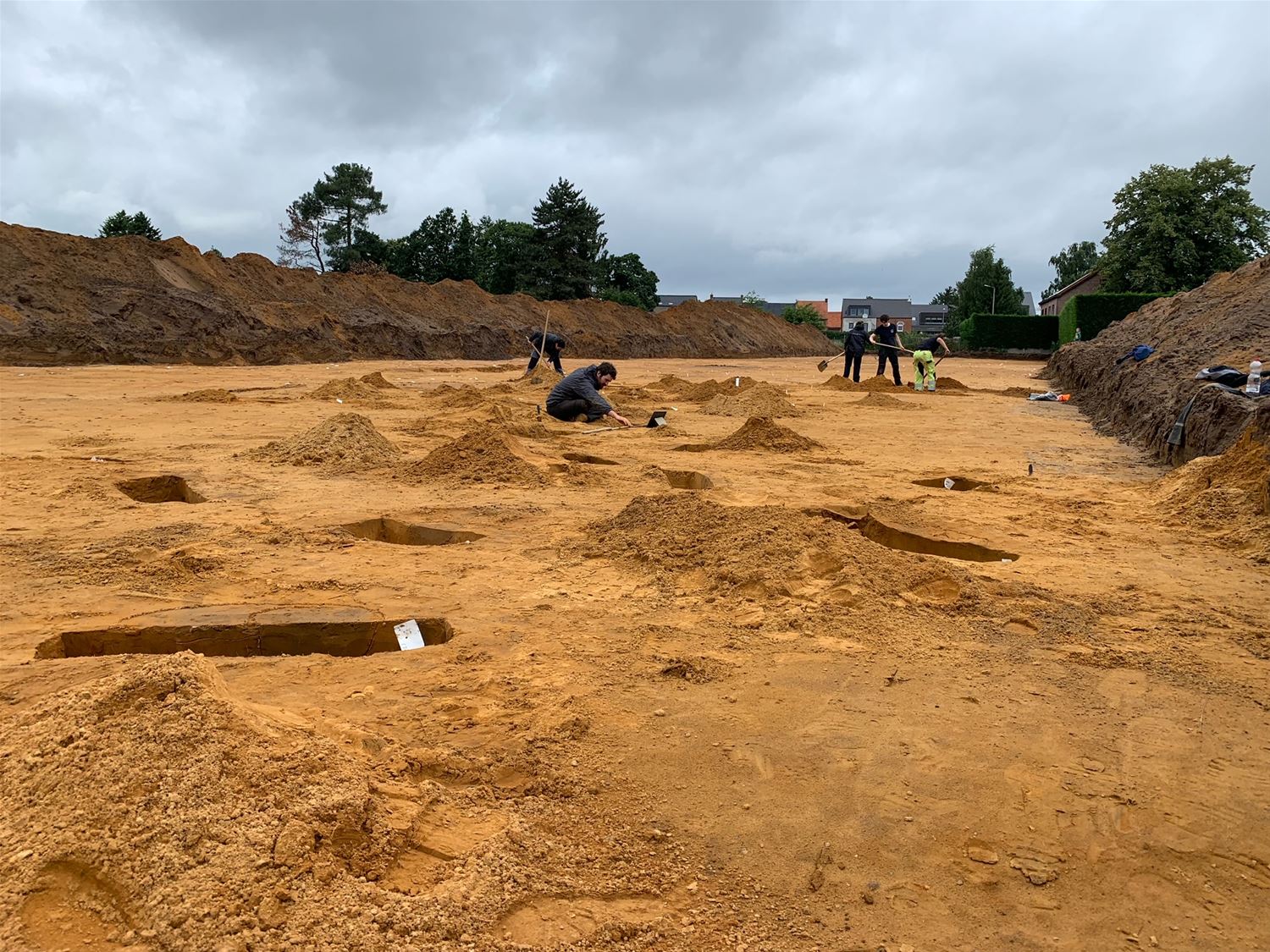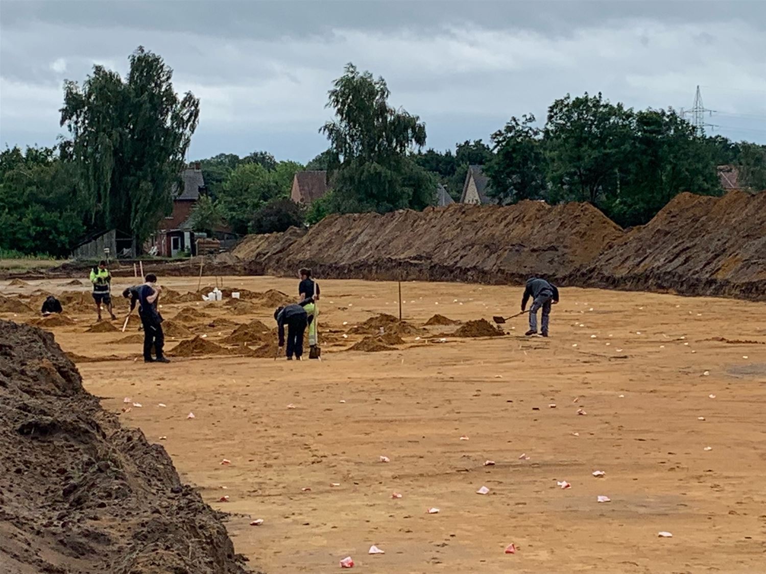 Aan het Mortelveld zijn de archeologische opgravingen volop aan de gang. Die gebeuren door het gespecialiseerde bedrijf Group Van Vooren - Terra Engineering & Consultancy - uit Sint-Truiden dat van de gemeente de opdracht kreeg. Ervaren archeologen zijn er dagelijks met de hulp van een 6-tal studenten archeologie van de KU Leuven aan de slag. Het gaat om een intens en secuur werk, zeker nadat bij het vooronderzoek belangrijke archeologische sporen zijn gevonden. En hoewel de onderzoeken nog tot begin september lopen en alles ook moet geëvalueerd worden, zijn de archeologen ter plekke erg enthouiast. Vermoedelijk is de site te situeren in de vroeg-Romeinse tijd, rond het einde van het ijzertijdperk. Er is een vermoeden dat er een paar boederijen hebben gestaan. Via de verkleuring van de grond - door het inslaan van houten palen - is de structuur te achterhalen. De papiertjes op het terrein duiden de verkleuringen aan, de grote hoeveelheid palen sterkt het vermoeden dat het om enkele woningen gaat. De vindplaatsen worden verder onderzocht gemarkeerd en in kaart gebracht, daarna wordt verder gewerkt aan de datering. Het verhaal is dus nog niet ten einde. (foto's Julien Maebe)78189