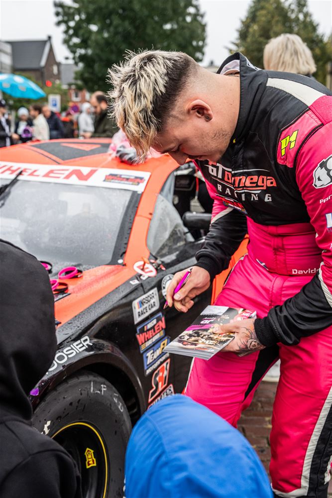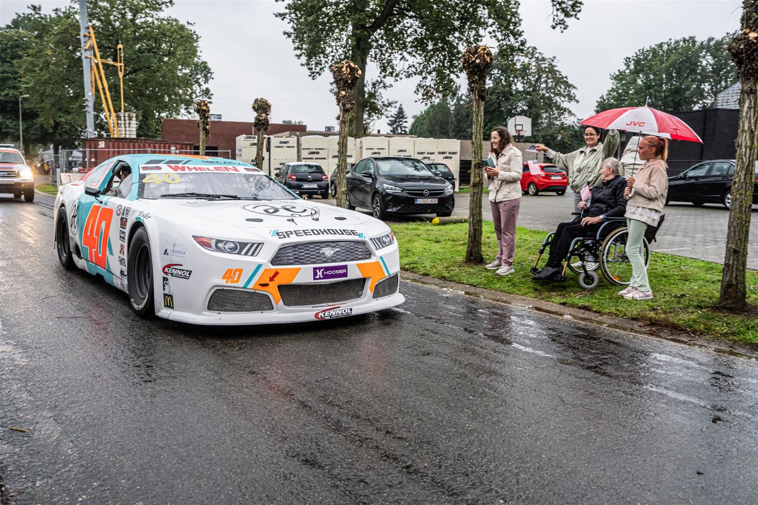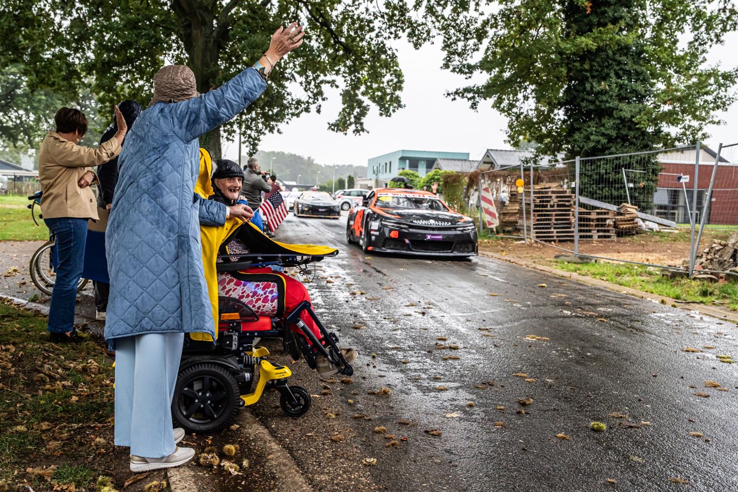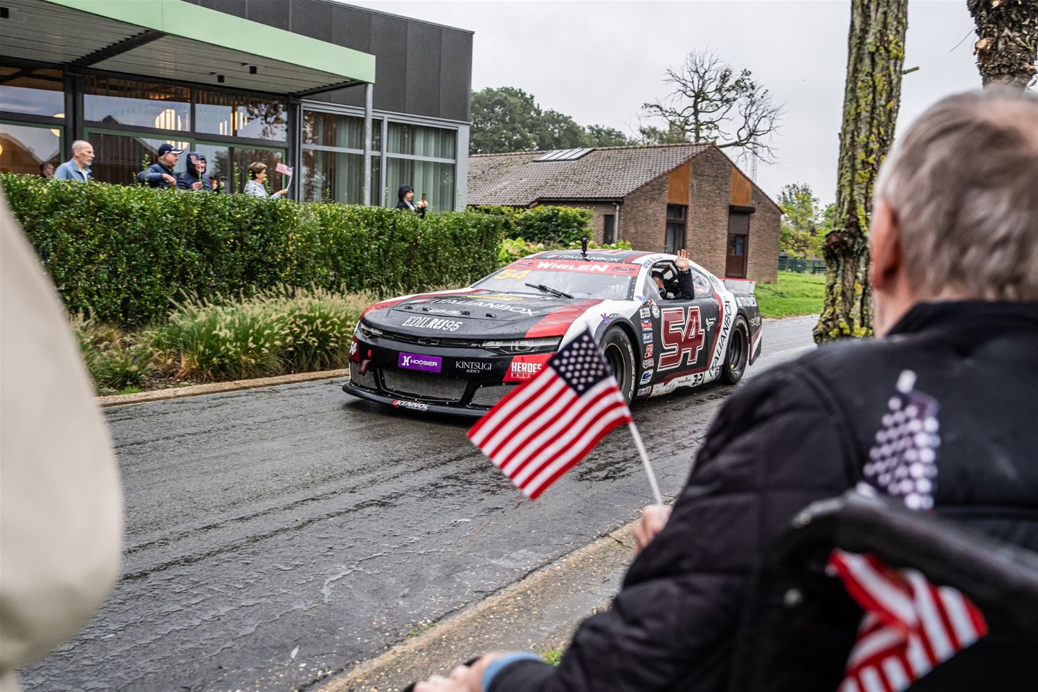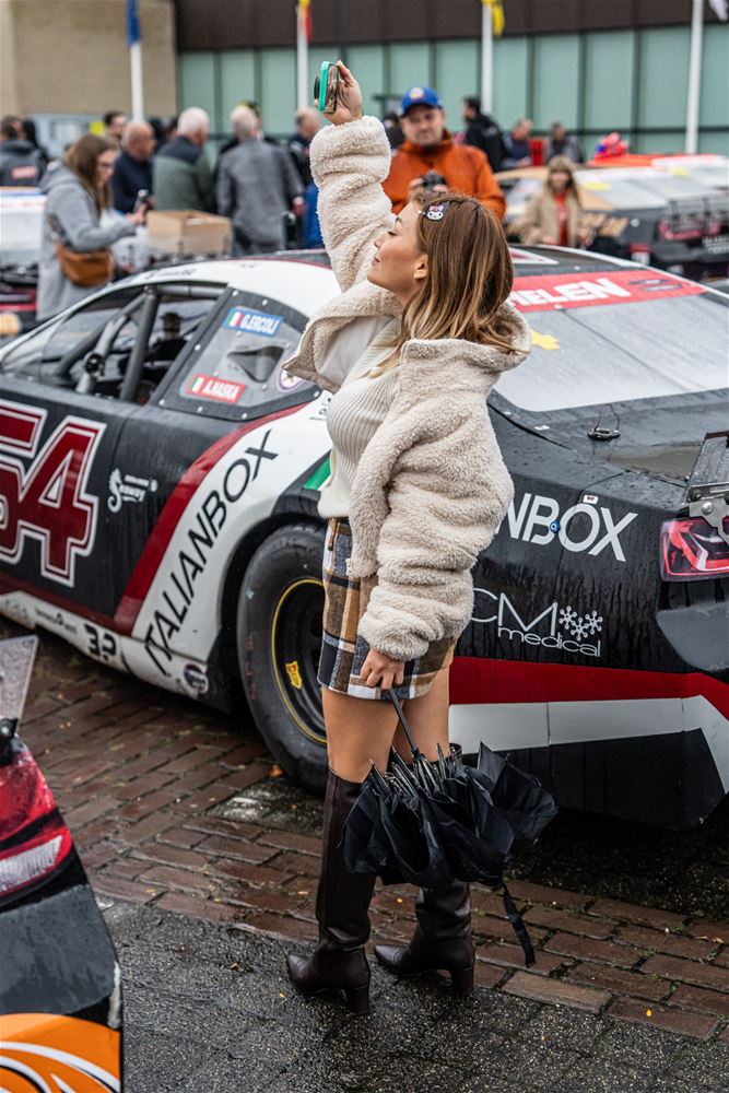 De NASCAR-parade van het circuit naar het Heldenplein verliep vandaag in de regen, maar toch is het een buitengewone editie geworden. Dat kwam doordat de hele karavaan dwars over het domein van 't Weyerke reed en daar de gasten een onvergetelijke ervaring bezorgde. Ze hadden zich dan ook goed voorbereid en stonden met Amerikaanse vlaggen de karavaan op te wachten. Wellicht zijn de rijders nog maar zelden zo enthousiast begroet. Daarna reed de karavaan door naar het Heldenplein waar ruimschoots de tijd was voor foto- en handtekeningenjagers. (foto's Dirk Dekens)78805