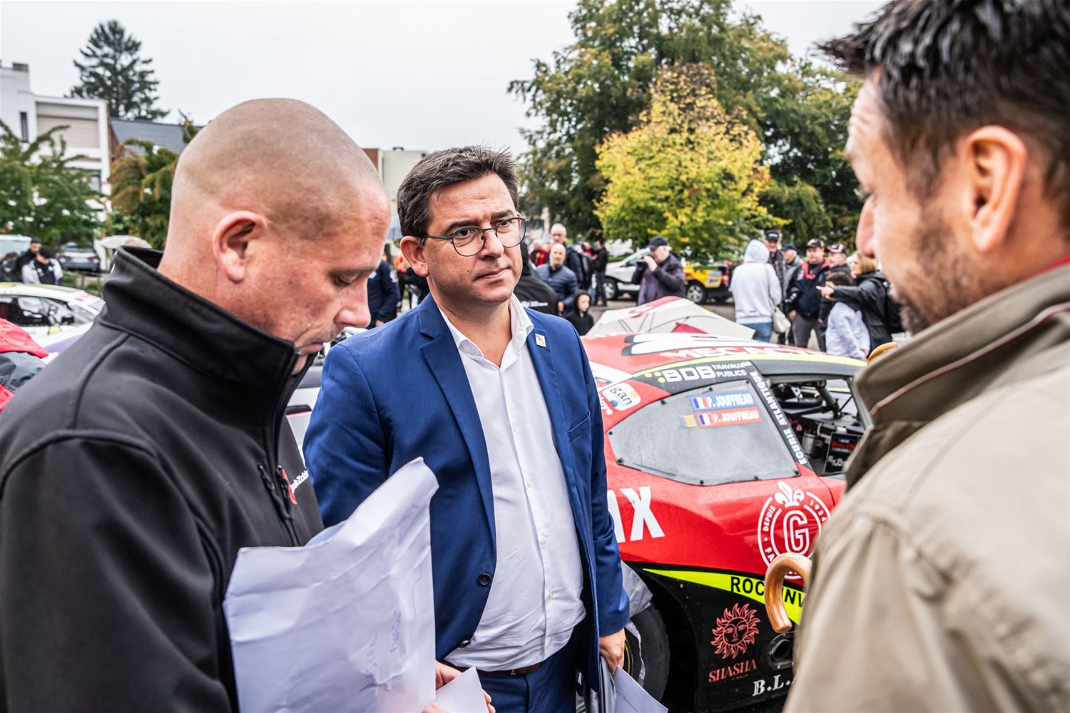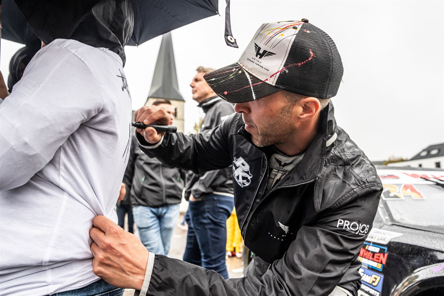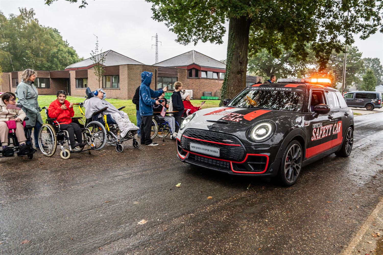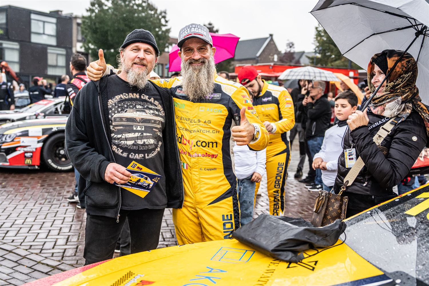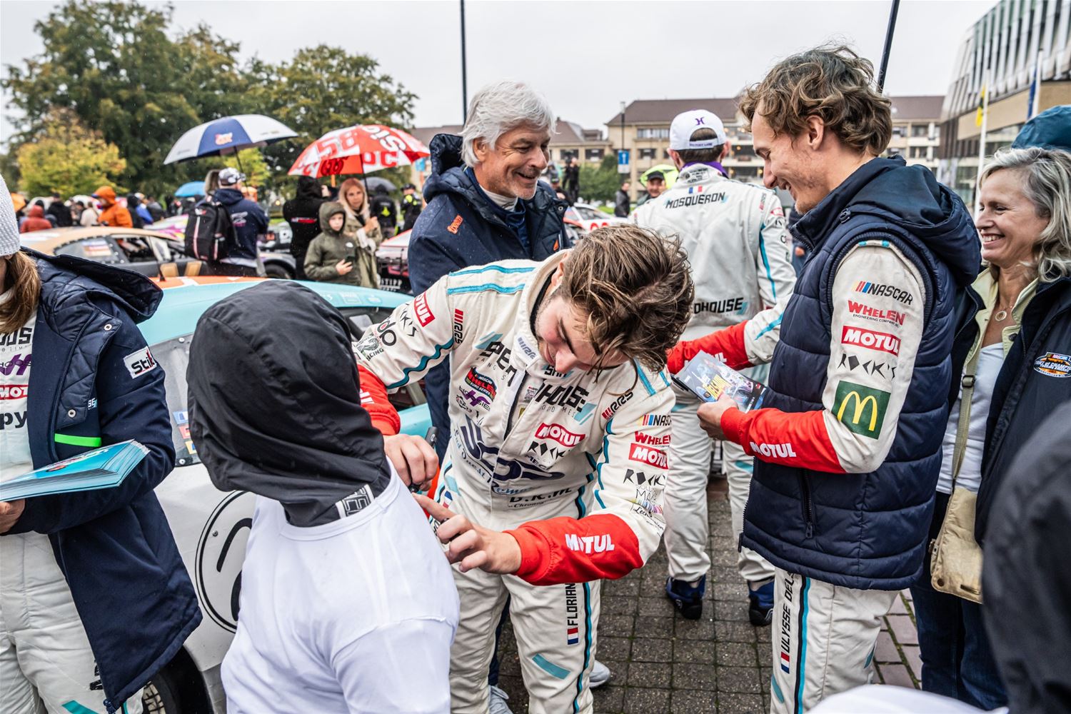De NASCAR-parade van het circuit naar het Heldenplein verliep vandaag in de regen, maar toch is het een buitengewone editie geworden. Dat kwam doordat de hele karavaan dwars over het domein van 't Weyerke reed en daar de gasten een onvergetelijke ervaring bezorgde. Ze hadden zich dan ook goed voorbereid en stonden met Amerikaanse vlaggen de karavaan op te wachten. Wellicht zijn de rijders nog maar zelden zo enthousiast begroet. Daarna reed de karavaan door naar het Heldenplein waar ruimschoots de tijd was voor foto- en handtekeningenjagers. (foto's Dirk Dekens)78805