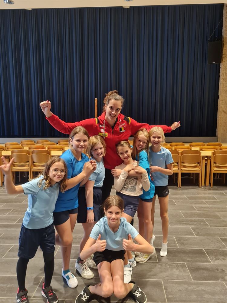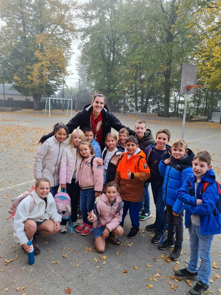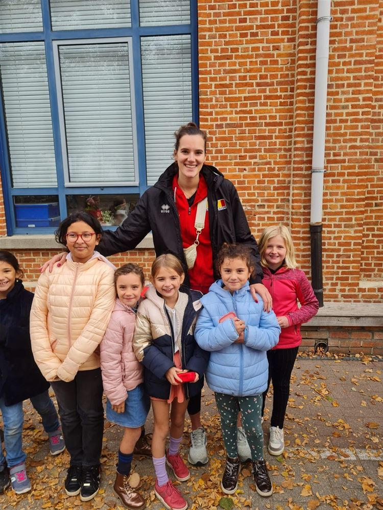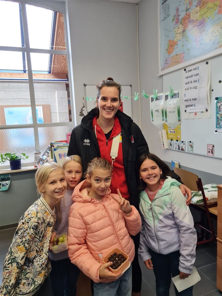 Een speciale dag in de Sint-Jan Berchmansschool in Viversel, want daar kwam Nathalie Lemmens op bezoek. Nathalie is vaste waarde bij de Yellow Tigers, die vorige week bij de eerste 10 eindigden op het WK en daarmee de beste prestatie ooit in het Belgische vrouwenvolleybal leverden. Ze draaide jaren mee in de top van het Belgische volley en kwam daarna terecht bij het Duitse Wiesbaden. Nathalie is oud-leerlinge van de school en wilde graag tijd vrijmaken voor de leerlingen. Die van het vijfde leerjaar kregen zelfs een les volleybal. En de anderen stonden te dringen om met haar op de foto te mogen en om een handtekening te versieren. Wie weet komt de opvolging ook uit Viversel. (foto's Daphne Claes)75496