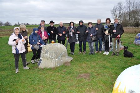 De maandelijkse wandeling van Neos Heusden-Zolder leidde deze keer naar Halen, het monument '44 betonnen helmen' op het veld waar de Slag der Zilveren helmen plaatsvond. De helmen kregen in 44 Limburgse gemeenten een eigen creatieve touch en zijn in Halen samengebracht als blijvende herinnering aan Wereldoorlog I in Limburg. Op de foto de groep bij de helm van Heusden-Zolder. (foto Trudo Groffi)44158