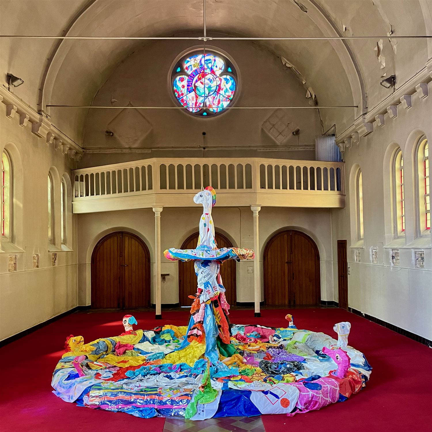 In de aanloop naar Artikel 27 rond de jaarwisseling in ZLDR luchtfabriek had kunstenaar Tom Bogaert de inwoners van Heusden-Zolder en omgeving opgeroepen om hun lekke opblaasbare zwembadjes, luchtbedjes, strandbadjes en andere plastic spullen binnen te brengen. Hij bouwde er een grote installatie mee, die trouwens één van de blikvangers werd op de 20ste editie van Artikel 27. Maar het werk trok ook de aandacht van curatoren van andere tentoonstellingen. Het krijgt nu een plaats in de zomerexpo A Soft Gentle Breeze in de Sint-Theresiakapel in Westende. Zo zie je maar hoe universeel kunst kan zijn ...