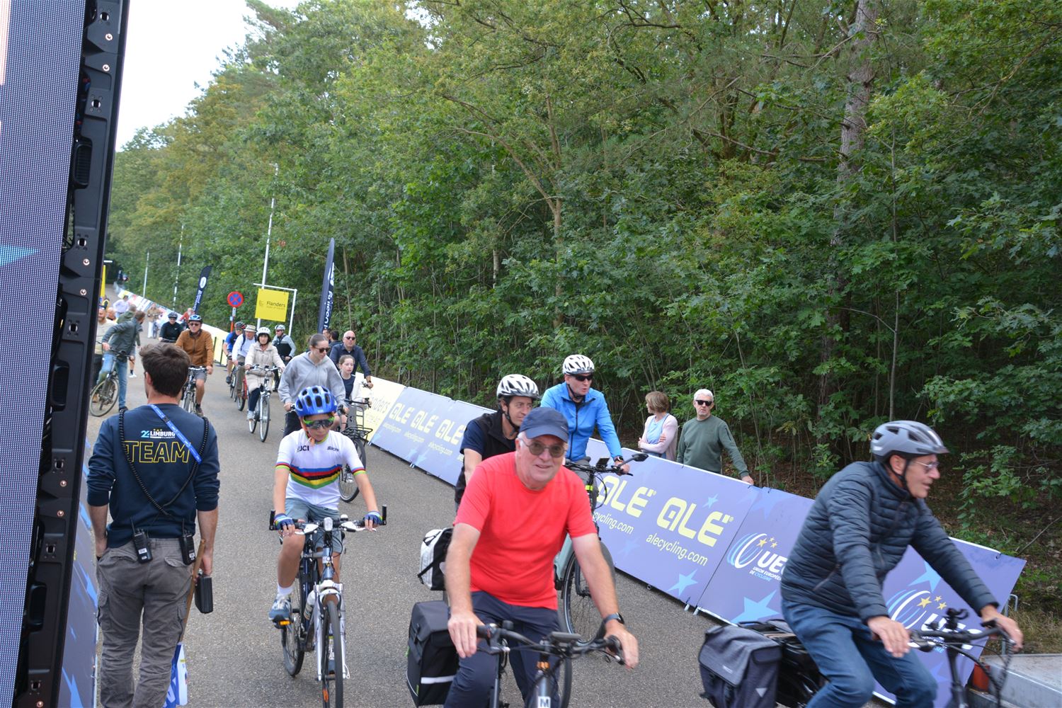 Opnieuw waren vanmiddag heel wat inwoners opgedaagd om samen als 'Peleton Heusden-Zolder' van de start naar Hasselt te rijden om daar samen het verdere verloop van de koers te volgen. Precies een kwartier na het vertrek van profs liet burgemeester Mario Borremans de startvlag vallen en vertrok het peleton. (foto's Marina Poelmans)83045