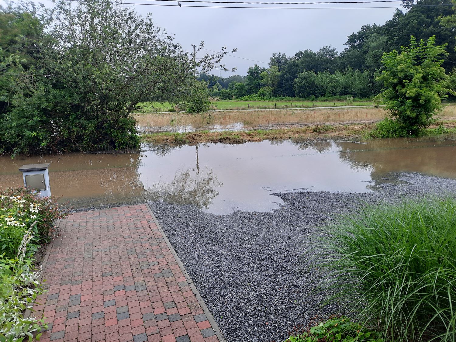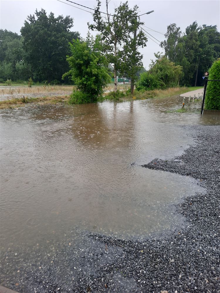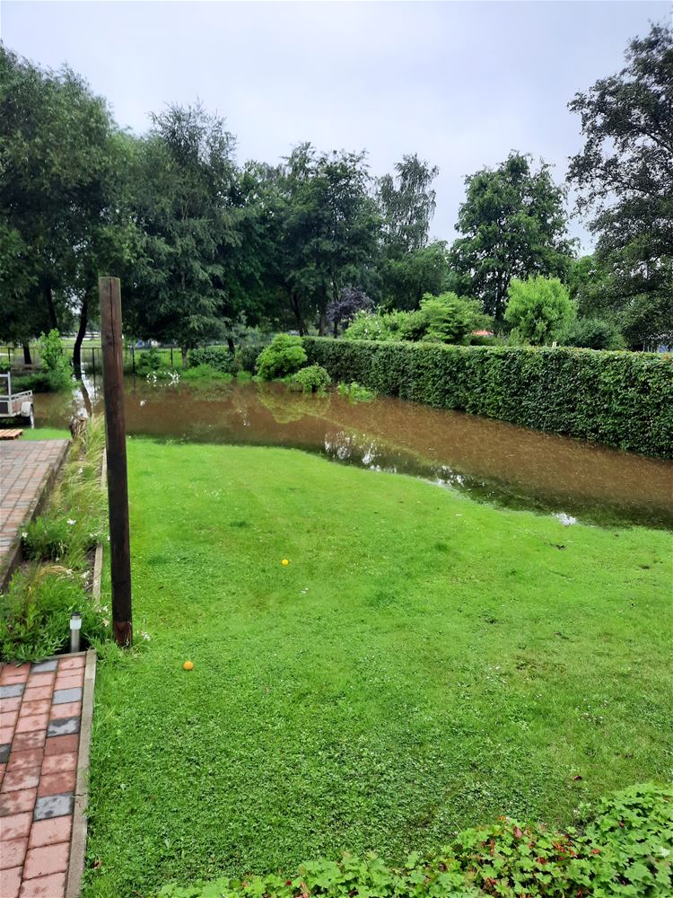 In de Beemdenstraat is het opvangbekken overgelopen. In de loop van de dag en vooravond bleef het water stijgen. In de tuinen van de buurtbewoners loopt het water letterlijk langs voor en achter binnen. (foto's Lieve Gybels)70107