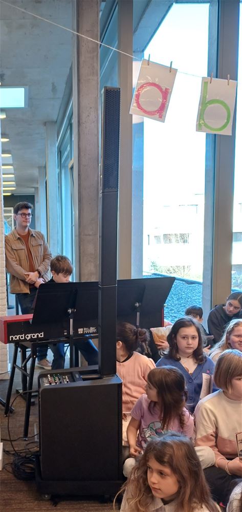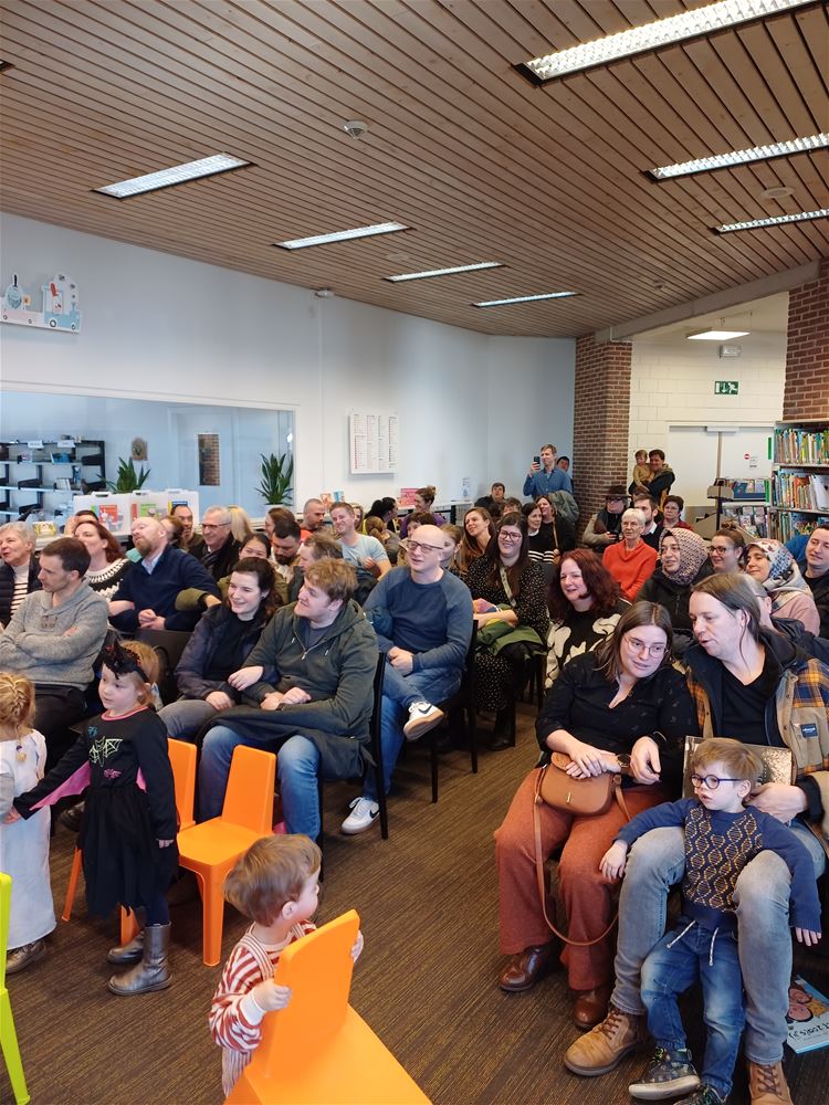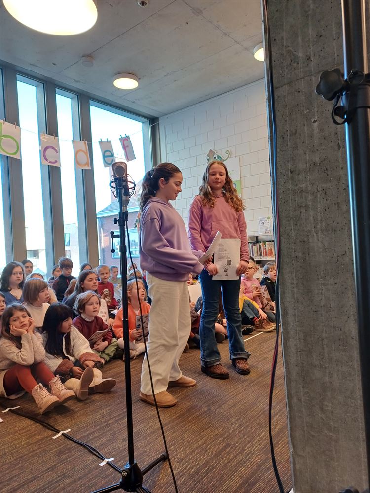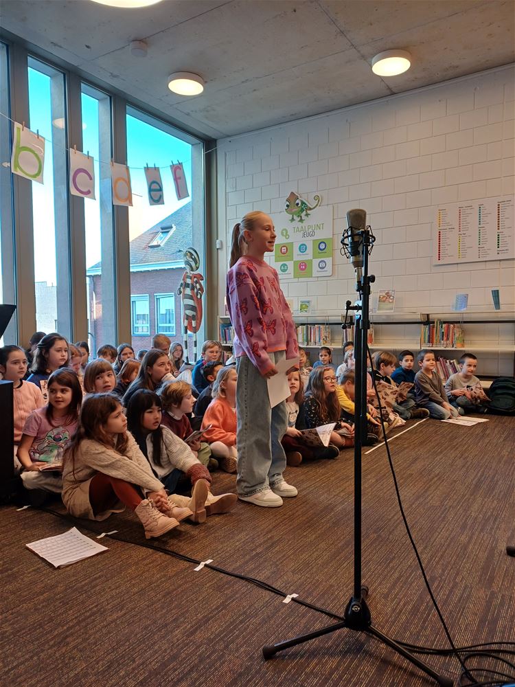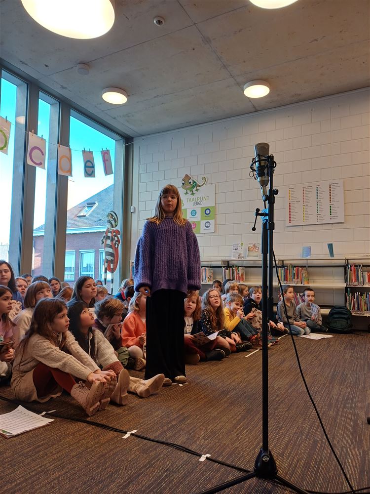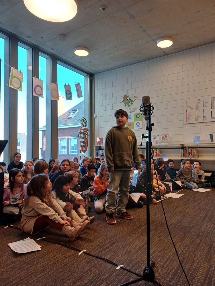 De publieke opkomst was niet overdreven groot, maar de sfeer was er niet minder op: vanmorgen in de bibliotheek tijdens het poëziemoment van de Muzieklab- en Woordlab-klassen van Academie Beringen, afdeling Heusden-Zolder. Zij vieren dat de Nederlandse vertaling van ‘Reis om de wereld in 80 dagen’ dit jaar 150 jaar bestaat. Het samengaan van de Jeugdboekenmaand en de Poëzieweek was voor hen de aanleiding om in de bib een mooi programma te brengen, met gedichten, muziek en liedjes rond de thema’s ‘onderweg zijn’ en ‘tijd’. Ze kregen het publiek duidelijk op hun hand. (foto’s Annick Goossens)84399